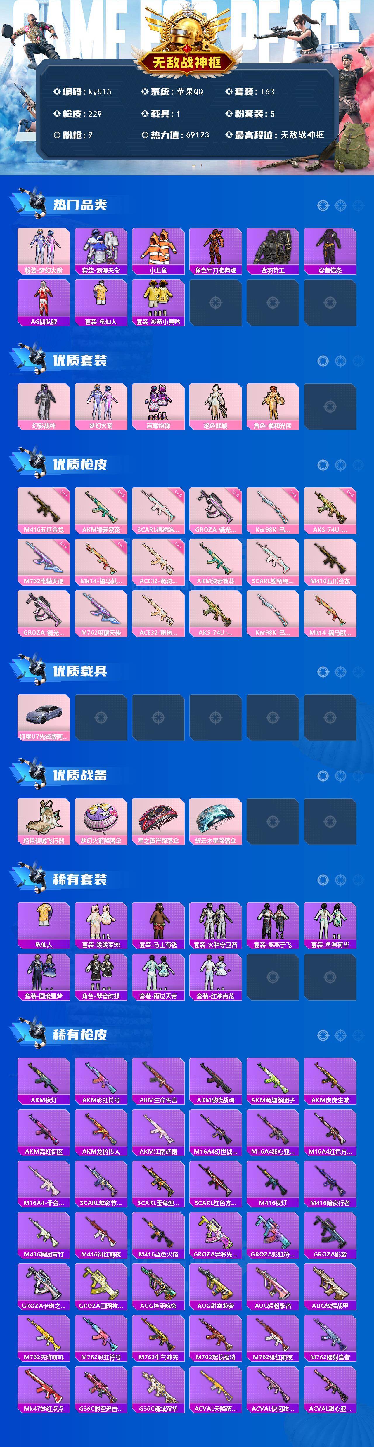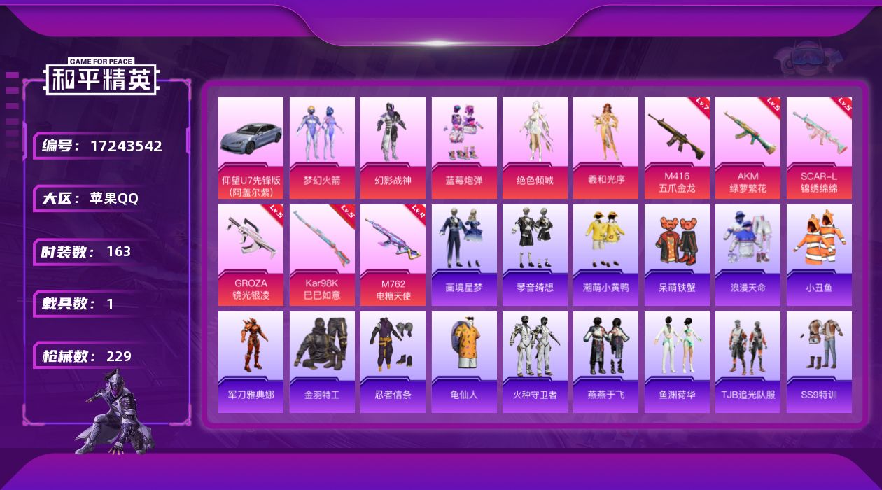 [17243542]苹果 手Q-无敌战神框-5粉装-9特效枪-1载具-1粉色飞行器-69123热力值-17王牌印记-163套装-229枪皮