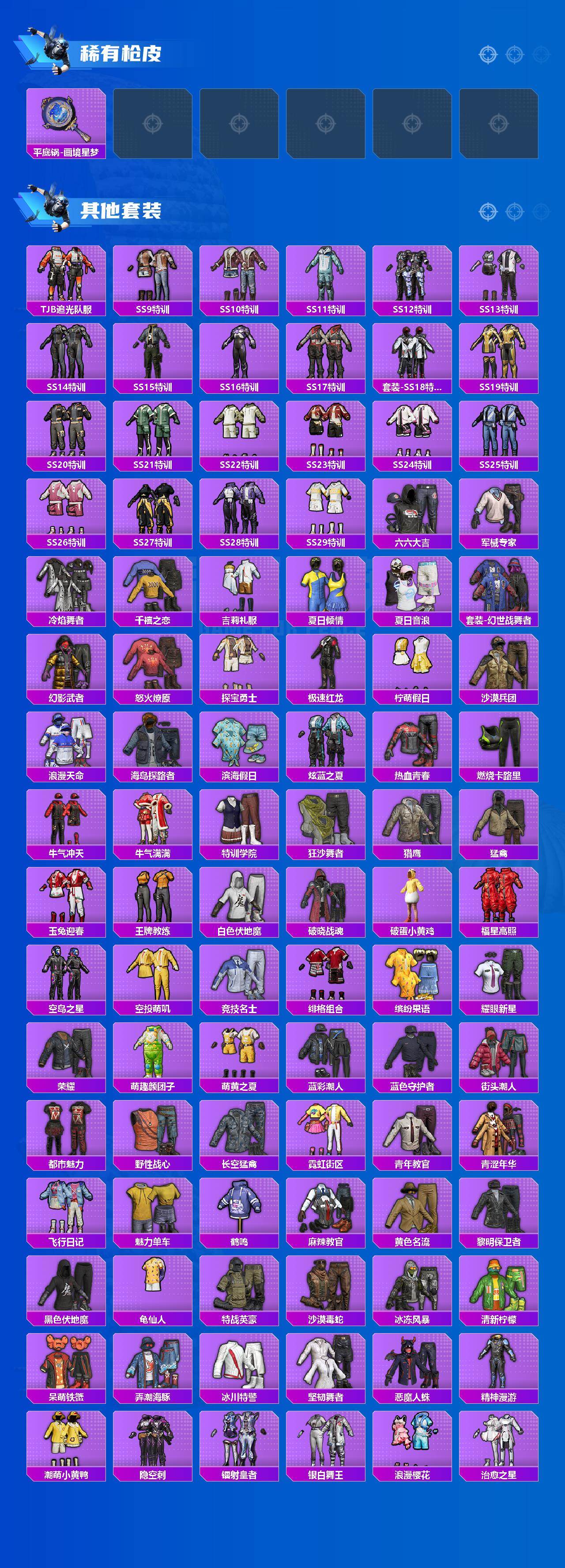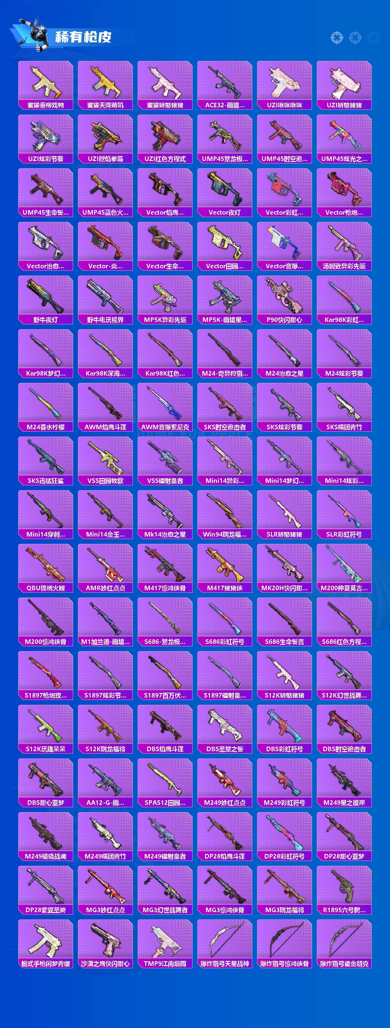 【稀有枪皮】:AKM-夜灯,AKM-彩虹符号,AKM-江南烟雨,AKM-生命誓言,AKM-破晓战魂,AKM-萌趣颜团子,AKM-虎虎生威,AKM-霓虹街区,AKM-龙的传人,M16A4-幻世战舞者,M16A4-甜心亚梦,M16A4-红色方程式,M16A4-千金淑猫,SCAR-L-炫彩节奏,SCAR-L-玉兔迎春,SCAR-L-红色方程式,M416-夜灯,M416-暗夜行者,M416-糯团青竹,M416-绯红前夜,M416-蓝色火焰,GROZA-异彩先驱,GROZA-彩虹符号,GROZA-影袭,GROZA-治愈之星,GROZA-田园牧歌,AUG-辉耀战甲,AUG-怪笑疯兔,AUG-甜蜜菠萝,AUG-耀粉歌者,M762-天降萌叽,M762-彩虹符号,M762-牛气冲天,M762-瑞龙福将,M762-绯红前夜,M762-镭射皇者,Mk47-妙红点点,G36C-镜域双华,G36C-时空追击者,AC-VAL-天降萌叽,A
