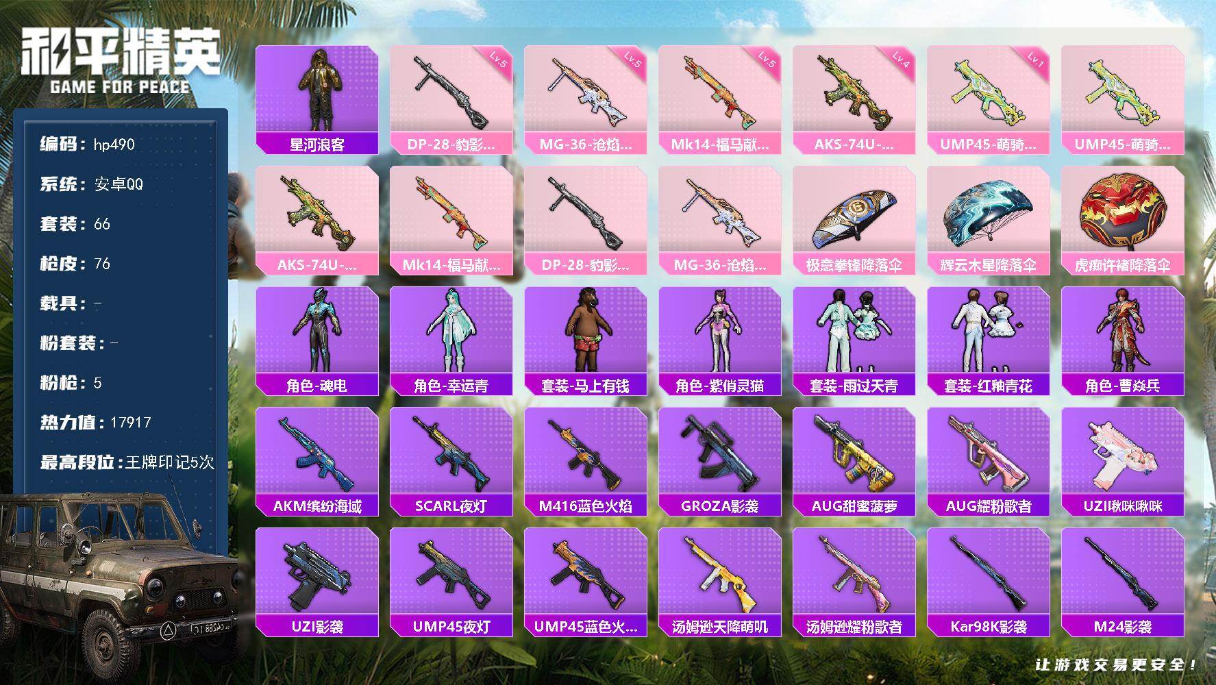[17243582]安卓 手Q-0粉装-5特效枪-0载具-0粉色飞行器-17917热力值-5王牌印记-66套装-76枪皮