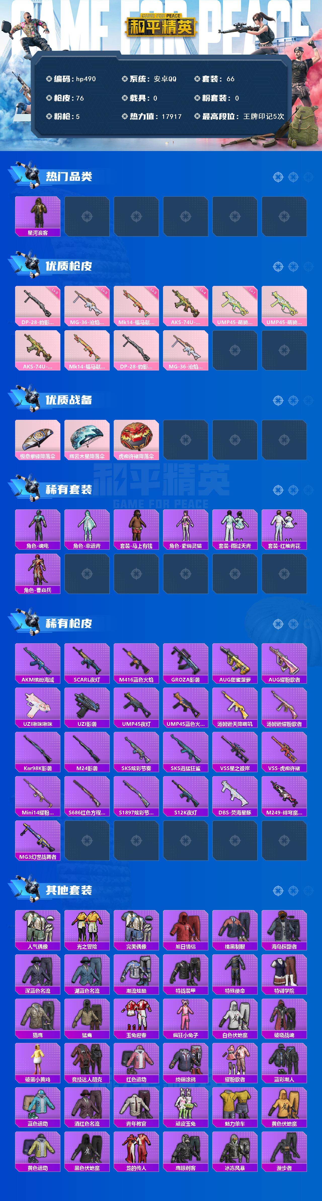 [17243582]安卓 手Q-0粉装-5特效枪-0载具-0粉色飞行器-17917热力值-5王牌印记-66套装-76枪皮 【热门品类】:套装-星河浪客 【粉色枪皮等级】:UMP45-萌骑冒险(一级),AKS-74U-森灵之息(四级),Mk14-福马献瑞(五级),DP-28-豹影疾电(五级),MG-36-沧焰双生(五级) 【粉色枪皮】:UMP45-萌骑冒险,AKS-74U-森灵之息,Mk14-福马献瑞,DP-28-豹影疾电,MG-36-沧焰双生 【粉色降落伞】:极意拳锋降落伞,辉云木星降落伞,虎痴许褚降落伞 【稀有套装】:套装-雪国风尚,角色-魂电,角色-幸运青,套装-马上有钱,角色-紫俏灵猫,套装-雨过天青,套装-红釉青花,角色-曹焱兵 【稀有枪皮】:AKM-缤纷海域,SCAR-L-夜灯,M416-蓝色火焰,GROZA-影袭,AUG-甜蜜菠萝,AUG-耀粉歌者,UZI-啾咪啾咪,UZI-影袭,UMP45-夜灯,UMP45-蓝色火焰,汤姆逊-天降萌叽,汤姆逊-耀粉歌者,Kar98K-影袭,M24-影袭,SKS-炫彩节奏,SKS-迅猛狂鲨,VSS-星之彼岸,VSS-虎痴许褚,Mini14-耀粉歌者,S686-红色方程式,S1897-炫彩节奏,S12K-夜灯,DBS-荧海星豚,M249-绯穹魔姬,MG3-幻世战舞者 【其他套装】:套装-人气偶像,套装-光之冒险,套装-完美偶像,套装-旭日情侣,套装-橘黑制服,套装-海岛探路者,套装-深蓝色名流,套装-湖蓝色名流,套装-潮流炫酷,套装-特战装甲,套装-特殊使命,套装-特训学院,套装-猎鹰,套装-猛禽,套装-玉兔迎春,套装-疯狂小兔子,套装-白色伏地魔,套装-破晓战魂,套装-破蛋小黄鸡,套装-竞技达人朋克,套装-红色运动,套装-绮丽涂鸦,套装-耀粉歌者,套装-蓝彩潮人,套装-蓝色运动,套装-酒红色名流,套装-青年教官,套装-顽皮玉兔,套装-魅力单车,套装-黄色伏地魔,套装-黄色运动,套装-黑色伏地魔,套装-龙的传人,套装-鹰眼刺客,套装-冰冻风暴,套装-漫步者,套装-星梦畅游 【稀有头盔】:深海小丑鱼头盔(2级) 【营地ID】:1017273643