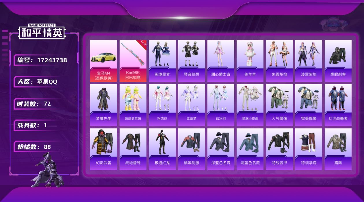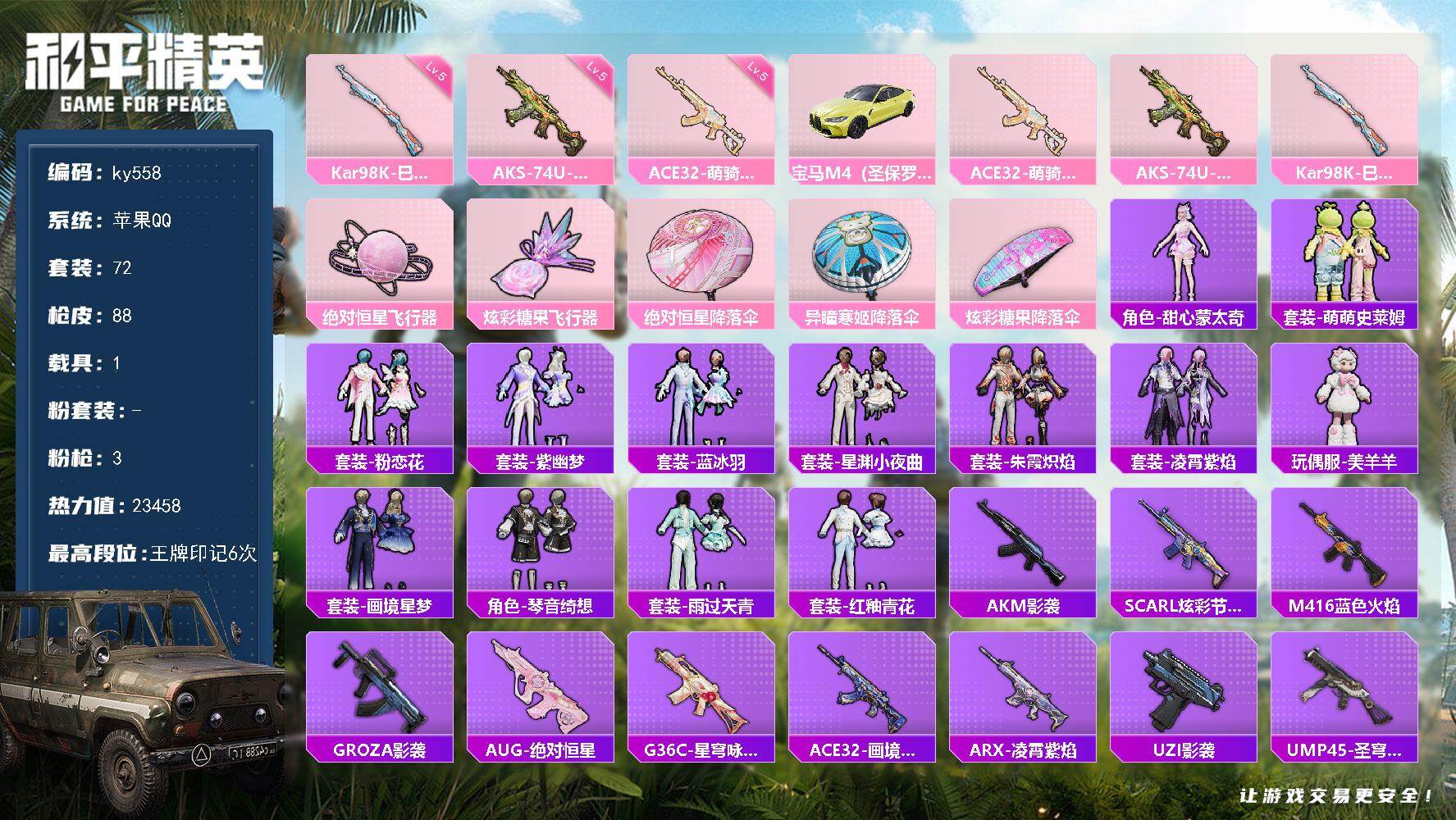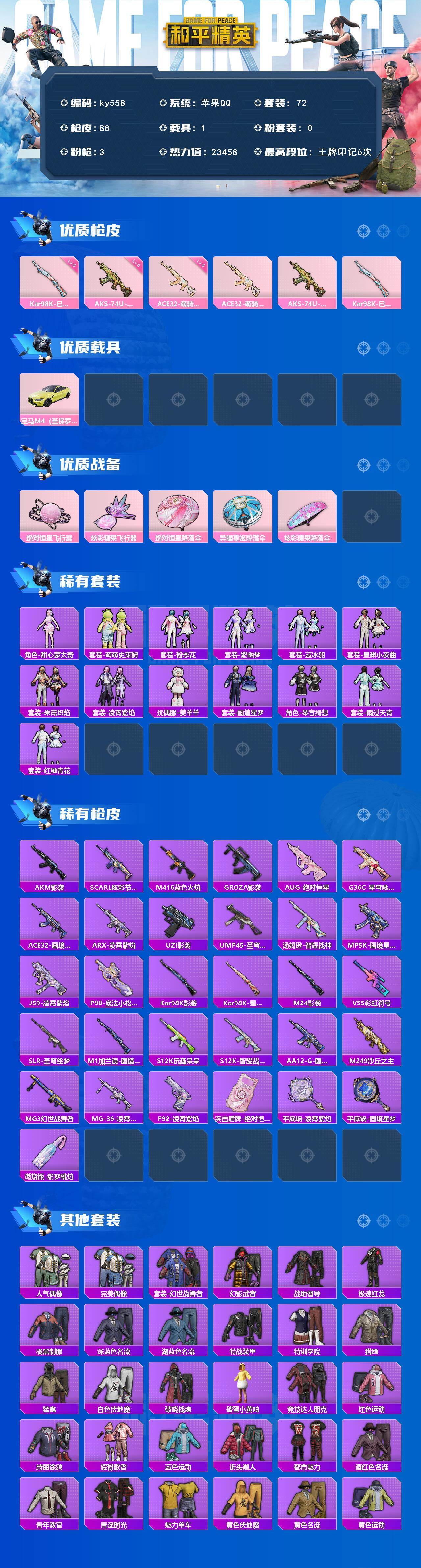 [17243738]苹果 手Q-0粉装-3特效枪-1载具-2粉色飞行器-23458热力值-6王牌印记-72套装-88枪皮 【粉色枪皮等级】:ACE32-萌骑漫游(五级),AKS-74U-森灵之息(五级),Kar98K-巳巳如意(五级) 【粉色载具】:宝马M4(圣保罗黄) 【粉色枪皮】:ACE32-萌骑漫游,AKS-74U-森灵之息,Kar98K-巳巳如意 【粉色飞行器】:绝对恒星飞行器,炫彩糖果飞行器 【粉色降落伞】:绝对恒星降落伞,异瞳寒姬降落伞,炫彩糖果降落伞 【稀有套装】:角色-甜心蒙太奇,套装-雪国风尚,套装-炫彩糖果,套装-萌萌史莱姆,套装-粉恋花,套装-紫幽梦,套装-蓝冰羽,套装-星渊小夜曲,套装-朱霞炽焰,套装-凌霄紫焰,玩偶服-美羊羊,套装-画境星梦,套装-琴音绮想,套装-雨过天青,套装-红釉青花 【稀有枪皮】:AKM-影袭,SCAR-L-炫彩节奏,M416-蓝色火焰,GROZA-影袭,AUG-绝对恒星,G36C-星穹咏叹调,ACE32-画境星梦,ARX-凌霄紫焰,UZI-影袭,UMP45-圣穹绘梦,汤姆逊-智耀战神,MP5K-画境星梦,JS9-凌霄紫焰,P90-魔法小松鼠,Kar98K-影袭,Kar98K-星穹咏叹调,M24-影袭,VSS-彩虹符号,SLR-圣穹绘梦,M1加兰德-画境星梦,S12K-玩趣呆呆,S12K-智耀战神,AA12-G-画境星梦,M249-沙丘之主,MG3-幻世战舞者,MG-36-凌霄紫焰,P92-凌霄紫焰,突击盾牌-绝对恒星,平底锅-凌霄紫焰,平底锅-画境星梦,燃烧瓶-甜梦桃焰 【其他套装】:套装-人气偶像,套装-完美偶像,套装-幻世战舞者,套装-幻影武者,套装-战地督导,套装-极速红龙,套装-橘黑制服,套装-深蓝色名流,套装-湖蓝色名流,套装-特战装甲,套装-特训学院,套装-猎鹰,套装-猛禽,套装-白色伏地魔,套装-破晓战魂,套装-破蛋小黄鸡,套装-竞技达人朋克,套装-红色运动,套装-绮丽涂鸦,套装-耀粉歌者,套装-蓝色运动,套装-街头潮人,套装-都市魅力,套装-酒红色名流,套装-青年教官,套装-青涩时光,套装-魅力单车,套装-黄色伏地魔,套装-黄色名流,套装-黄色运动,套装-黑色伏地魔,套装-鹰眼刺客,套装-冰冻风暴,套装-漫步者,套装-梦魇先生 【营地ID】:991247824