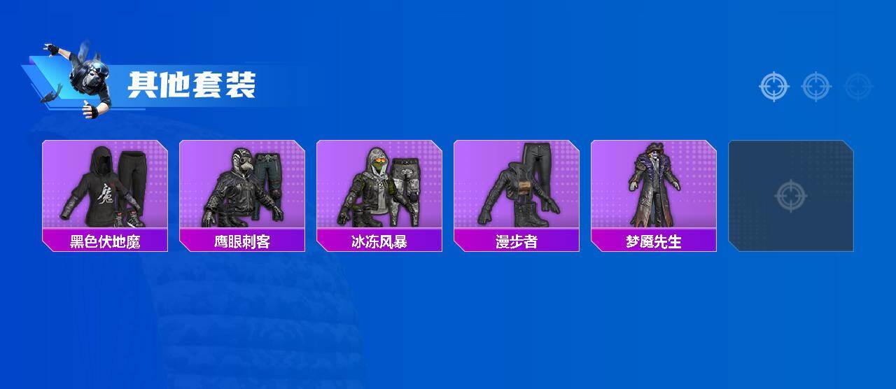 【其他套装】:套装-人气偶像,套装-完美偶像,套装-幻世战舞者,套装-幻影武者,套装-战地督导,套装-极速红龙,套装-橘黑制服,套装-深蓝色名流,套装-湖蓝色名流,套装-特战装甲,套装-特训学院,套装-猎鹰,套装-猛禽,套装-白色伏地魔,套装-破晓战魂,套装-破蛋小黄鸡,套装-竞技达人朋克,套装-红色运动,套装-绮丽涂鸦,套装-耀粉歌者,套装-蓝色运动,套装-街头潮人,套装-都市魅力,套装-酒红色名流,套装-青年教官,套装-青涩时光,套装-魅力单车,套装-黄色伏地魔,套装-黄色名流,套装-黄色运动,套装-黑色伏地魔,套装-鹰眼刺客,套装-冰冻风暴,套装-漫步者,套装-梦魇先生