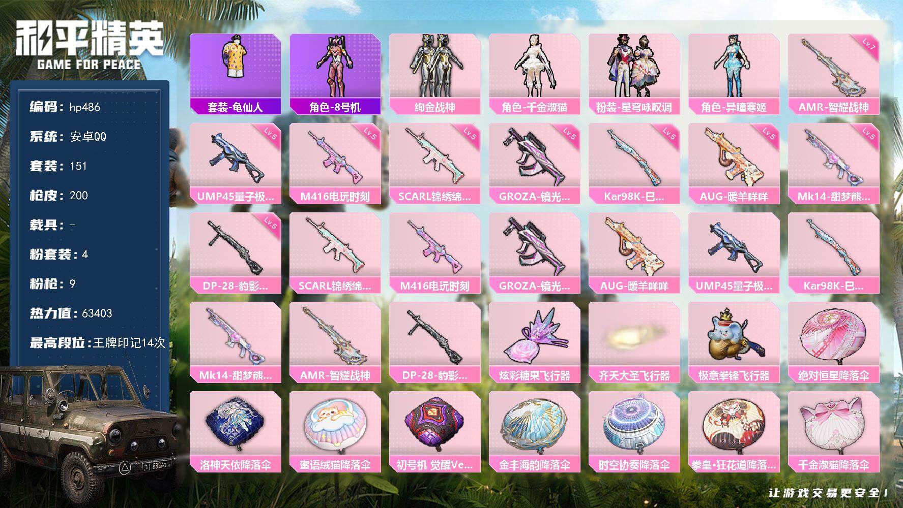 [17243786]安卓 手Q-4粉装-9特效枪-0载具-3粉色飞行器-63403热力值-14王牌印记-151套装-200枪皮