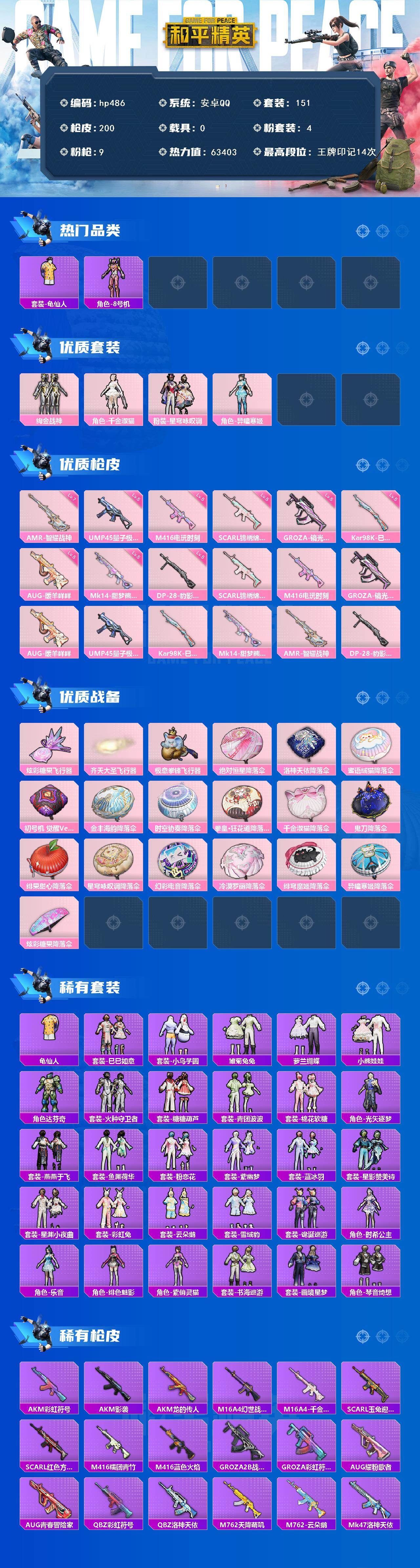 [17243786]安卓 手Q-4粉装-9特效枪-0载具-3粉色飞行器-63403热力值-14王牌印记-151套装-200枪皮 【热门品类】:套装-龟仙人,角色-8号机 【粉色套装】:粉装-绚金战神,角色-千金淑猫,粉装-星穹咏叹调,角色-异瞳寒姬 【粉色枪皮等级】:SCAR-L-锦绣绵绵(五级),M416-电玩时刻(五级),GROZA-镜光银凌(五级),AUG-暖羊咩咩(五级),UMP45-量子极限(五级),Kar98K-巳巳如意(五级),Mk14-甜梦熊击(五级),AMR-智耀战神(七级),DP-28-豹影疾电(五级) 【粉色枪皮】:SCAR-L-锦绣绵绵,M416-电玩时刻,GROZA-镜光银凌,AUG-暖羊咩咩,UMP45-量子极限,Kar98K-巳巳如意,Mk14-甜梦熊击,AMR-智耀战神,DP-28-豹影疾电 【粉色飞行器】:炫彩糖果飞行器,齐天大圣飞行器,极意拳锋飞行器 【粉色降落伞】:绝对恒星降落伞,洛神天依降落伞,蜜语绒猫降落伞,初号机 觉醒Ver.降落伞,金丰海韵降落伞,时空协奏降落伞,拳皇·狂花道降落伞,千金淑猫降落伞,鬼刀降落伞,绯果甜心降落伞,星穹咏叹调降落伞,幻彩电音降落伞,冷漠罗丽降落伞,绯穹魔姬降落伞,异瞳寒姬降落伞,炫彩糖果降落伞 【稀有套装】:套装-龟仙人,套装-巳巳如意,套装-小鸟芋圆,套装-雪国风尚,套装-炫彩糖果,套装-雏菊兔兔,套装-萝兰蝴蝶,套装-小熊娃娃,角色-达芬奇,套装-火种守卫者,套装-糖糖葫芦,套装-青团波波,套装-棉花软糖,角色-光矢逐梦,套装-燕燕于飞,套装-鱼渊荷华,套装-粉恋花,套装-紫幽梦,套装-蓝冰羽,套装-星影赞美诗,套装-星渊小夜曲,套装-彩虹兔,套装-云朵鹅,套装-雪绒豹,套装-诡诞巡游,角色-时希公主,角色-乐音,角色-绯色魅影,角色-紫俏灵猫,套装-书海巡游,套装-画境星梦,套装-琴音绮想 【稀有枪皮】:AUG-冰晶雪宝,AKM-彩虹符号,AKM-影袭,AKM-龙的传人,M16A4-幻世战舞者,M16A4-千金淑猫,SCAR-L-玉兔迎春,SCAR-L-红色方程式,M416-糯团青竹,M416-蓝色火焰,GROZA-2B战斗服款,GROZA-彩虹符号,AUG-耀粉歌者,AUG-青春冒险家,QBZ-彩虹符号,QBZ-洛神天依,M762-天降萌叽,M762-云朵鹅,Mk47-洛神天依,G36C-星穹咏叹调,蜜