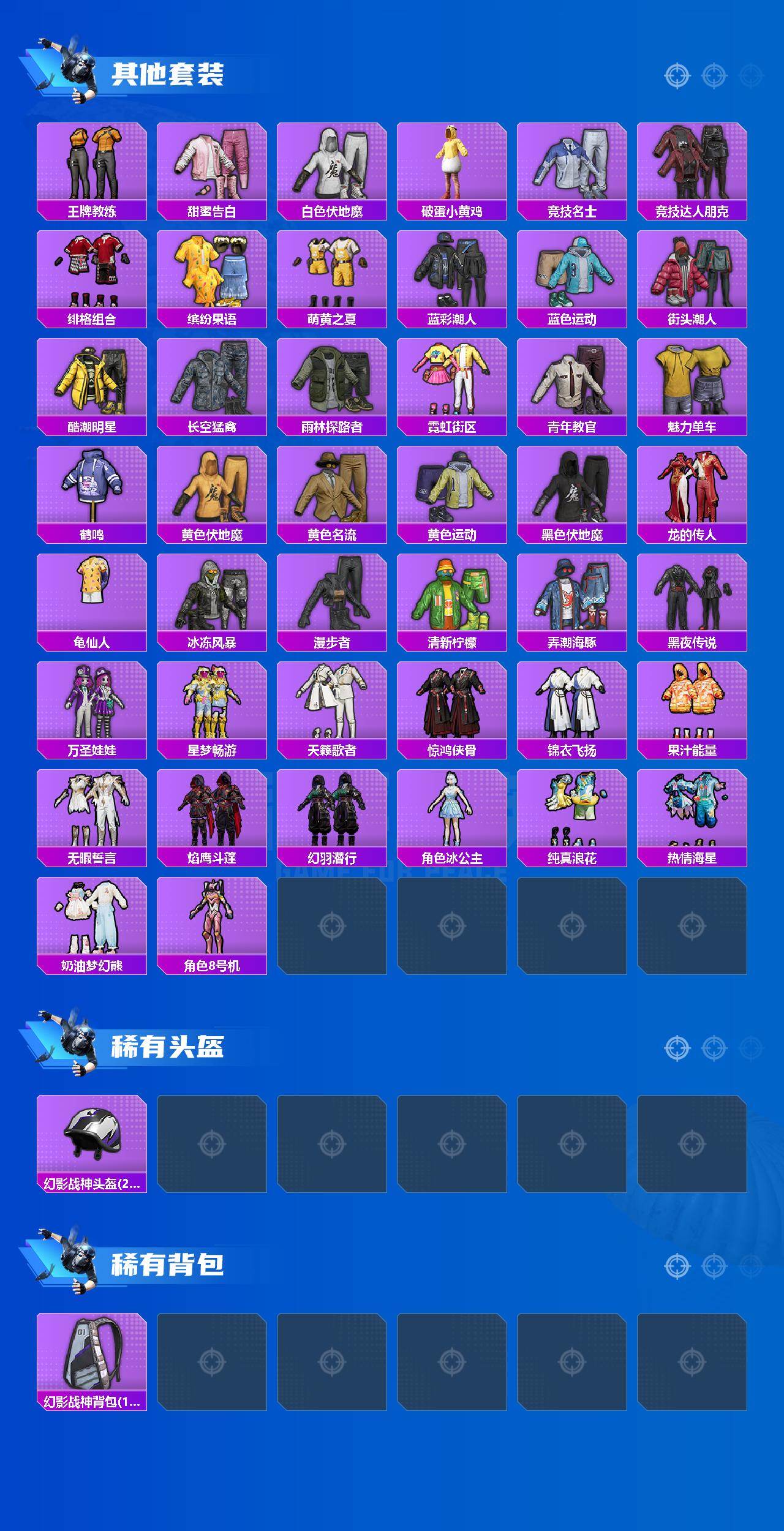 【稀有套装】:套装-龟仙人,套装-巳巳如意,套装-小鸟芋圆,套装-雪国风尚,套装-炫彩糖果,套装-雏菊兔兔,套装-萝兰蝴蝶,套装-小熊娃娃,角色-达芬奇,套装-火种守卫者,套装-糖糖葫芦,套装-青团波波,套装-棉花软糖,角色-光矢逐梦,套装-燕燕于飞,套装-鱼渊荷华,套装-粉恋花,套装-紫幽梦,套装-蓝冰羽,套装-星影赞美诗,套装-星渊小夜曲,套装-彩虹兔,套装-云朵鹅,套装-雪绒豹,套装-诡诞巡游,角色-时希公主,角色-乐音,角色-绯色魅影,角色-紫俏灵猫,套装-书海巡游,套装-画境星梦,套装-琴音绮想