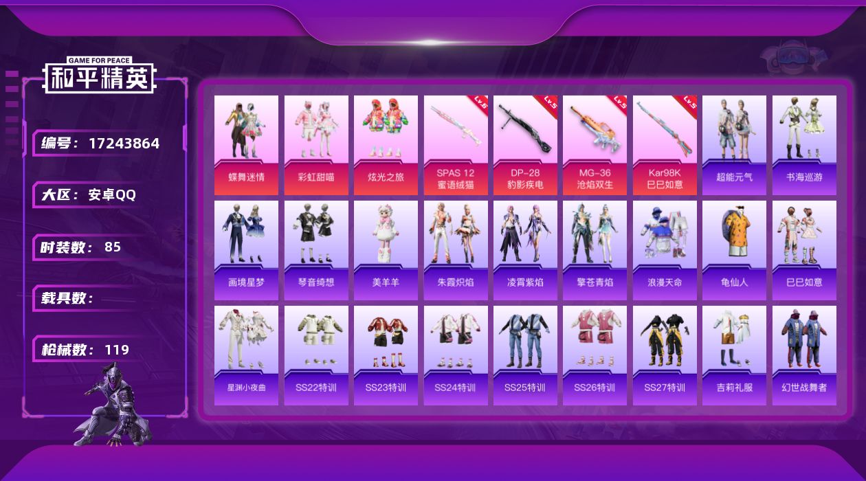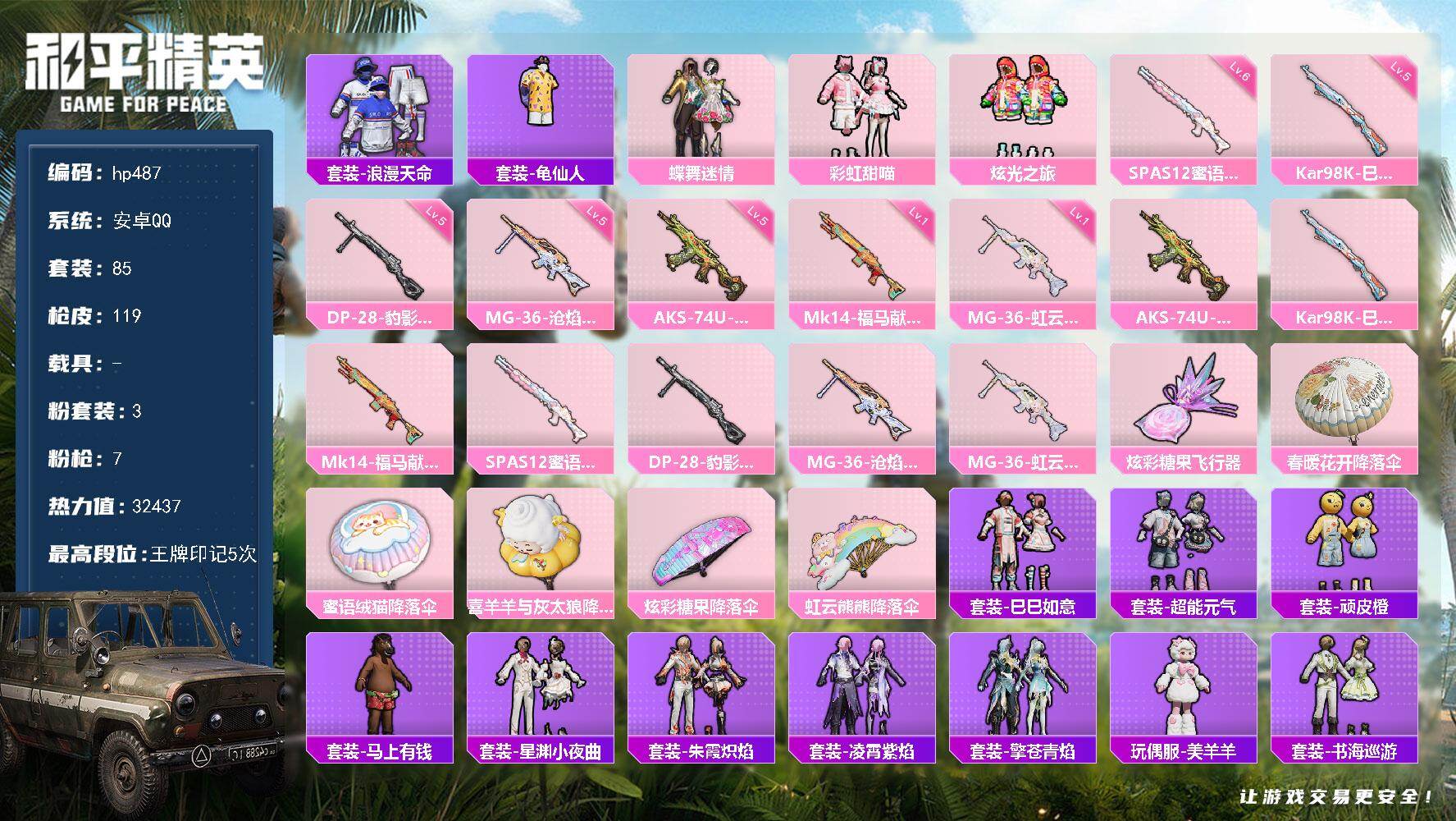 [17243864]安卓 手Q-3粉装-7特效枪-0载具-1粉色飞行器-32437热力值-5王牌印记-85套装-119枪皮