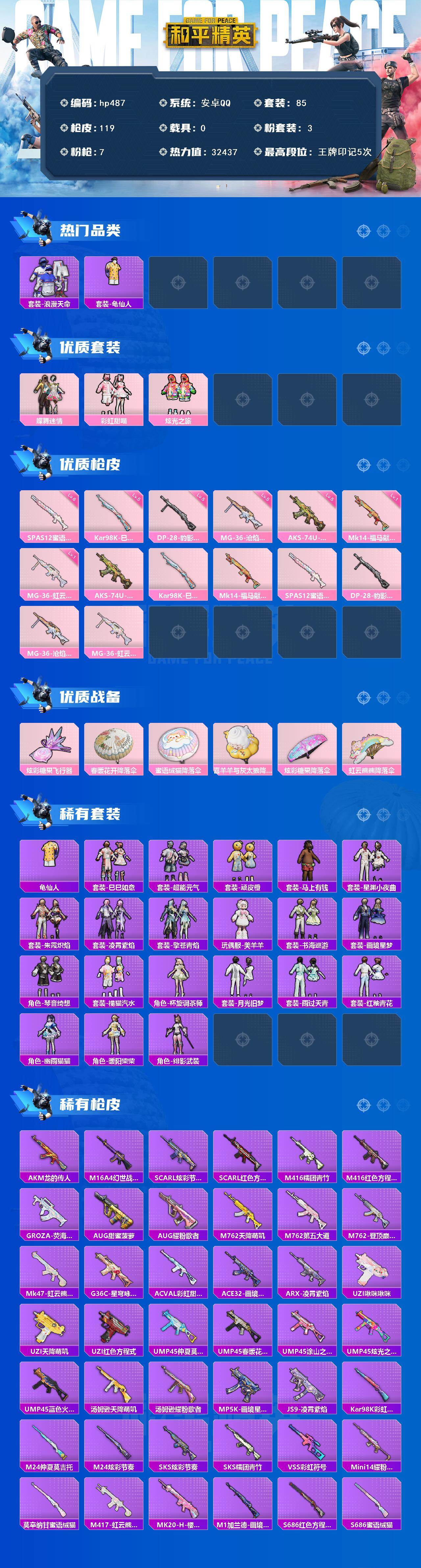 [17243864]安卓 手Q-3粉装-7特效枪-0载具-1粉色飞行器-32437热力值-5王牌印记-85套装-119枪皮 【热门品类】:套装-浪漫天命,套装-龟仙人 【粉色套装】:粉装-蝶舞迷情,粉装-彩虹甜喵,粉装-炫光之旅 【粉色枪皮等级】:AKS-74U-森灵之息(五级),Kar98K-巳巳如意(五级),Mk14-福马献瑞(一级),SPAS-12-蜜语绒猫(六级),DP-28-豹影疾电(五级),MG-36-沧焰双生(五级),MG-36-虹云熊熊(一级) 【粉色枪皮】:AKS-74U-森灵之息,Kar98K-巳巳如意,Mk14-福马献瑞,SPAS-12-蜜语绒猫,DP-28-豹影疾电,MG-36-沧焰双生,MG-36-虹云熊熊 【粉色飞行器】:炫彩糖果飞行器 【粉色降落伞】:春暖花开降落伞,蜜语绒猫降落伞,喜羊羊与灰太狼降落伞,炫彩糖果降落伞,虹云熊熊降落伞 【稀有套装】:套装-龟仙人,套装-巳巳如意,套装-超能元气,套装-雪国风尚,套装-炫彩糖果,套装-顽皮橙,套装-马上有钱,套装-星渊小夜曲,套装-朱霞炽焰,套装-凌霄紫焰,套装-擎苍青焰,玩偶服-美羊羊,套装-书海巡游,套装-画境星梦,套装-琴音绮想,套装-橘猫汽水,角色-杯旋调茶师,套装-月光旧梦,套装-雨过天青,套装-红釉青花,角色-幽雨猫猫,角色-暖阳柴柴,角色-绯影武装 【稀有枪皮】:AUG-冰晶雪宝,AKM-龙的传人,M16A4-幻世战舞者,SCAR-L-炫彩节奏,SCAR-L-红色方程式,M416-糯团青竹,M416-红色方程式,GROZA-荧海星豚,AUG-甜蜜菠萝,AUG-耀粉歌者,M762-天降萌叽,M762-第五大道,M762-登顶巅峰,Mk47-虹云熊熊,G36C-星穹咏叹调,AC-VAL-彩虹甜喵,ACE32-画境星梦,ARX-凌霄紫焰,UZI-啾咪啾咪,UZI-天降萌叽,UZI-红色方程式,UMP45-仲夏莫吉托,UMP45-春暖花开,UMP45-涂山之恋,UMP45-炫光之旅,UMP45-蓝色火焰,汤姆逊-天降萌叽,汤姆逊-耀粉歌者,MP5K-画境星梦,JS9-凌霄紫焰,Kar98K-彩虹符号,M24-炫彩节奏,M24-仲夏莫吉托,SKS-炫彩节奏,SKS-糯团青竹,VSS-彩虹符号,Mini14-耀粉歌者,莫辛纳甘-蜜语绒猫,M417-虹云熊熊,MK20-H-樱桃泡泡,M1加兰德-画境星梦,S