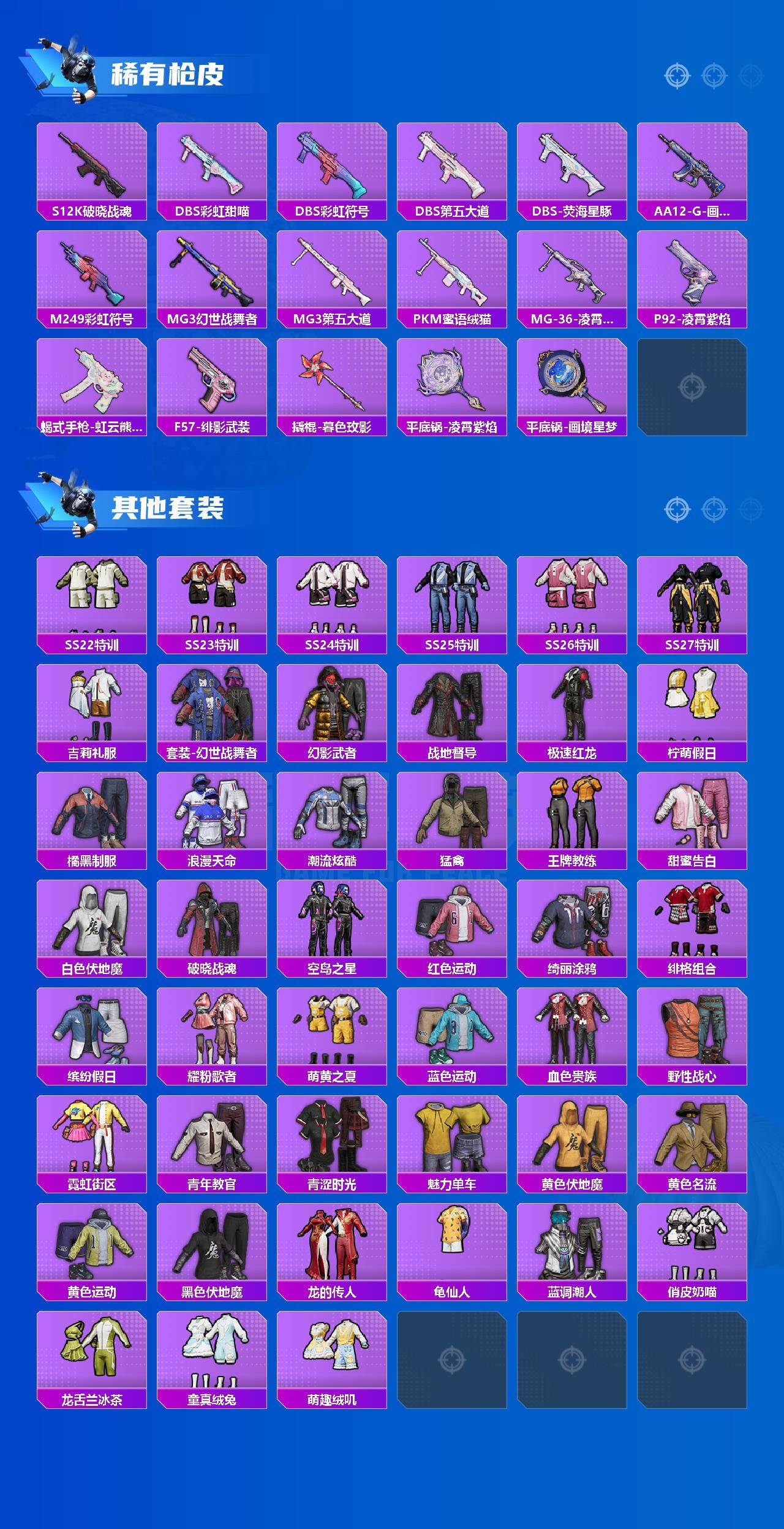 【稀有枪皮】:AUG-冰晶雪宝,AKM-龙的传人,M16A4-幻世战舞者,SCAR-L-炫彩节奏,SCAR-L-红色方程式,M416-糯团青竹,M416-红色方程式,GROZA-荧海星豚,AUG-甜蜜菠萝,AUG-耀粉歌者,M762-天降萌叽,M762-第五大道,M762-登顶巅峰,Mk47-虹云熊熊,G36C-星穹咏叹调,AC-VAL-彩虹甜喵,ACE32-画境星梦,ARX-凌霄紫焰,UZI-啾咪啾咪,UZI-天降萌叽,UZI-红色方程式,UMP45-仲夏莫吉托,UMP45-春暖花开,UMP45-涂山之恋,UMP45-炫光之旅,UMP45-蓝色火焰,汤姆逊-天降萌叽,汤姆逊-耀粉歌者,MP5K-画境星梦,JS9-凌霄紫焰,Kar98K-彩虹符号,M24-炫彩节奏,M24-仲夏莫吉托,SKS-炫彩节奏,SKS-糯团青竹,VSS-彩虹符号,Mini14-耀粉歌者,莫辛纳甘-蜜语绒猫,M417-虹云熊熊,MK20-H-樱桃泡泡,M1加兰德-画境星梦,S