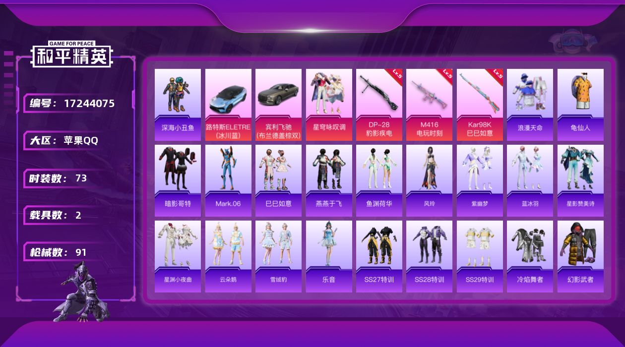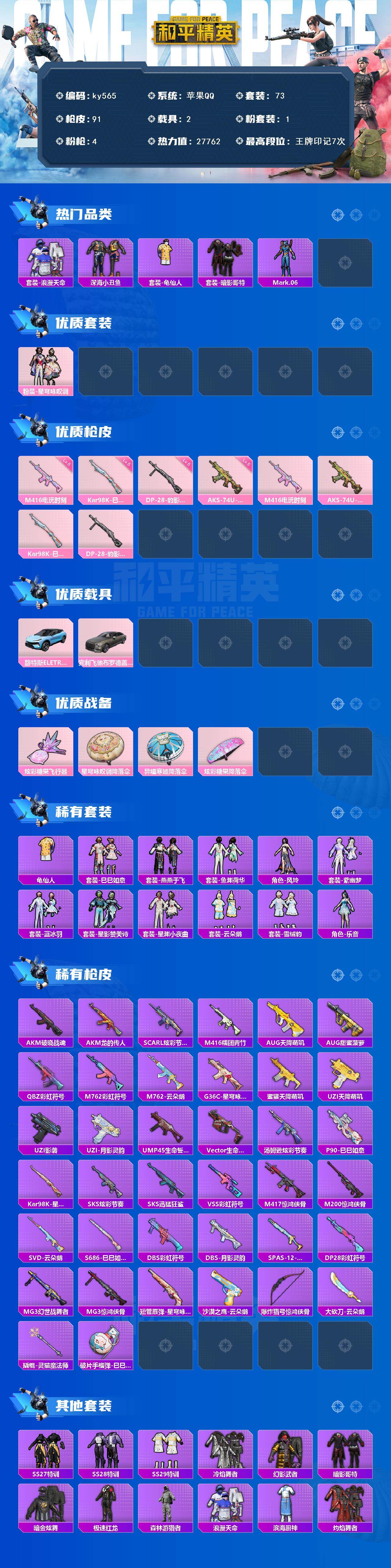 [17244075]苹果 手Q-1粉装-4特效枪-2载具-1粉色飞行器-27762热力值-7王牌印记-73套装-91枪皮 【热门品类】:套装-浪漫天命,套装-深海小丑鱼,套装-龟仙人,套装-暗影哥特,角色-Mark.06 【粉色套装】:粉装-星穹咏叹调 【粉色枪皮等级】:M416-电玩时刻(五级),AKS-74U-森灵之息(五级),Kar98K-巳巳如意(五级),DP-28-豹影疾电(五级) 【粉色载具】:路特斯ELETRE(冰川蓝),宾利飞驰(布罗德盖棕双色) 【粉色枪皮】:M416-电玩时刻,AKS-74U-森灵之息,Kar98K-巳巳如意,DP-28-豹影疾电 【粉色飞行器】:炫彩糖果飞行器 【粉色降落伞】:星穹咏叹调降落伞,异瞳寒姬降落伞,炫彩糖果降落伞 【稀有套装】:套装-龟仙人,套装-巳巳如意,套装-雪国风尚,套装-炫彩糖果,套装-燕燕于飞,套装-鱼渊荷华,角色-风玲,套装-紫幽梦,套装-蓝冰羽,套装-星影赞美诗,套装-星渊小夜曲,套装-云朵鹅,套装-雪绒豹,角色-乐音 【稀有枪皮】:AUG-冰晶雪宝,AKM-破晓战魂,AKM-龙的传人,SCAR-L-炫彩节奏,M416-糯团青竹,AUG-天降萌叽,AUG-甜蜜菠萝,QBZ-彩虹符号,M762-彩虹符号,M762-云朵鹅,G36C-星穹咏叹调,蜜獾-天降萌叽,UZI-天降萌叽,UZI-影袭,UZI-月影灵韵,UMP45-生命誓言,Vector-生命誓言,汤姆逊-炫彩节奏,P90-巳巳如意,Kar98K-星穹咏叹调,SKS-炫彩节奏,SKS-迅猛狂鲨,VSS-彩虹符号,M417-惊鸿侠骨,M200-惊鸿侠骨,SVD-云朵鹅,S686-巳巳如意,DBS-彩虹符号,DBS-月影灵韵,SPAS-12-云朵鹅,DP-28-彩虹符号,MG3-幻世战舞者,MG3-惊鸿侠骨,短管霰弹-星穹咏叹调,沙漠之鹰-云朵鹅,爆炸猎弓-惊鸿侠骨,大砍刀-云朵鹅,撬棍-灵猫魔法师,破片手榴弹-巳巳如意 【其他套装】:套装-SS27特训,套装-SS28特训,套装-SS29特训,套装-冷焰舞者,套装-幻影武者,套装-暗影哥特,套装-暗金炫舞,套装-极速红龙,套装-森林游猎者,套装-浪漫天命,套装-滨海厨神,套装-灼焰舞者,套装-特战装甲,套装-特训学院,套装-王牌教练,套装-白色伏地魔,套装-破晓战魂,套装-破蛋小黄鸡,套装-竞技名士,套装-缤纷果语,套装