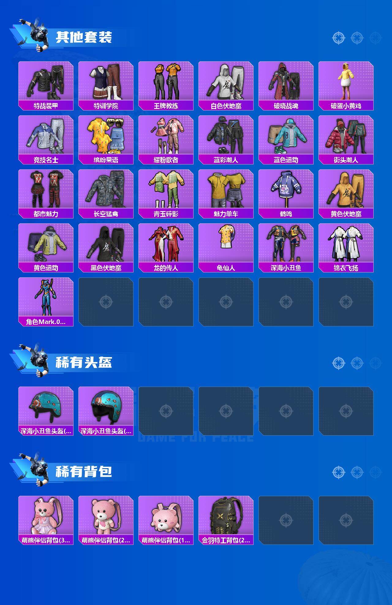 【其他套装】:套装-SS27特训,套装-SS28特训,套装-SS29特训,套装-冷焰舞者,套装-幻影武者,套装-暗影哥特,套装-暗金炫舞,套装-极速红龙,套装-森林游猎者,套装-浪漫天命,套装-滨海厨神,套装-灼焰舞者,套装-特战装甲,套装-特训学院,套装-王牌教练,套装-白色伏地魔,套装-破晓战魂,套装-破蛋小黄鸡,套装-竞技名士,套装-缤纷果语,套装