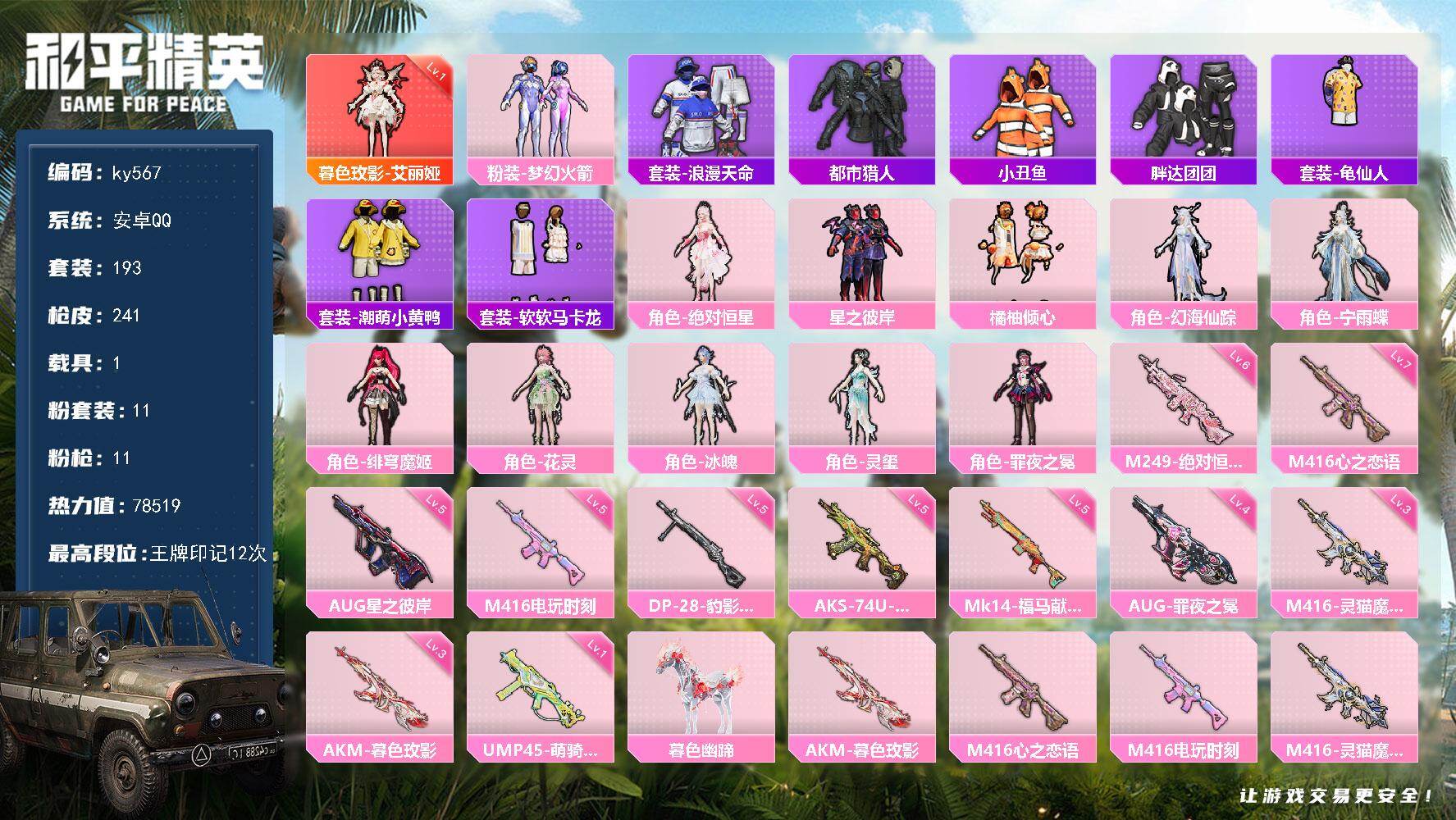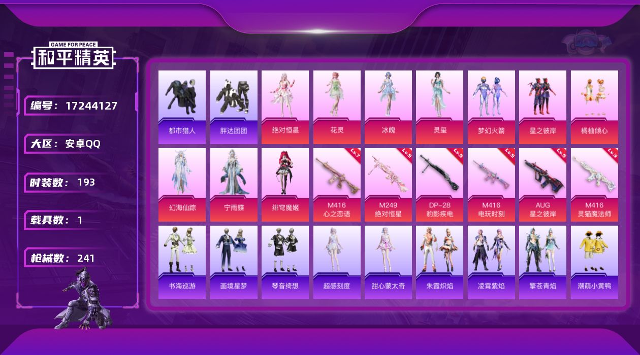[17244127]安卓 手Q-1神装-11粉装-11特效枪-1载具-7粉色飞行器-78519热力值-12王牌印记-193套装-241枪皮