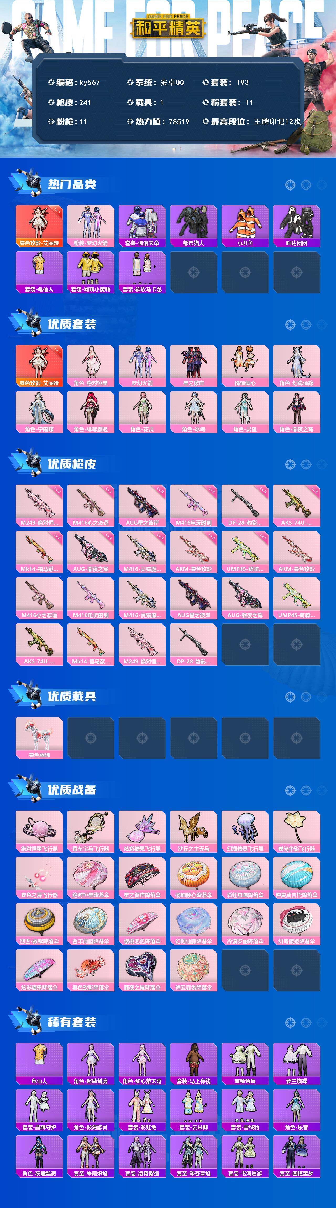 [17244127]安卓 手Q-1神装-11粉装-11特效枪-1载具-7粉色飞行器-78519热力值-12王牌印记-193套装-241枪皮 【红色神装等级】:暮色玫影-艾丽娅(一级) 【红色角色神装】:暮色玫影-艾丽娅 【热门品类】:粉装-梦幻火箭,套装-浪漫天命,套装-都市猎人,套装-小丑鱼,套装-胖达团团,套装-龟仙人,套装-潮萌小黄鸭,套装-软软马卡龙 【粉色套装】:角色-绝对恒星,粉装-梦幻火箭,粉装-星之彼岸,粉装-橘柚倾心,角色-幻海仙踪,角色-宁雨蝶,角色-绯穹魔姬,角色-花灵,角色-冰魄,角色-灵玺,角色-罪夜之冕 【粉色枪皮等级】:AKM-暮色玫影(三级),M416-心之恋语(七级),M416-电玩时刻(五级),M416-灵猫魔法师(三级),AUG-星之彼岸(五级),AUG-罪夜之冕(四级),UMP45-萌骑冒险(一级),AKS-74U-森灵之息(五级),Mk14-福马献瑞(五级),M249-绝对恒星(六级),DP-28-豹影疾电(五级) 【粉色载具】:暮色幽蹄 【粉色枪皮】:AKM-暮色玫影,M416-心之恋语,M416-电玩时刻,M416-灵猫魔法师,AUG-星之彼岸,AUG-罪夜之冕,UMP45-萌骑冒险,AKS-74U-森灵之息,Mk14-福马献瑞,M249-绝对恒星,DP-28-豹影疾电 【粉色飞行器】:绝对恒星飞行器,香车宝马飞行器,炫彩糖果飞行器,沙丘之主天马,幻海精灵飞行器,曦光华影飞行器,暮色之舞飞行器 【粉色降落伞】:绝对恒星降落伞,星之彼岸降落伞,橘柚倾心降落伞,彩虹甜喵降落伞,仲夏莫吉托降落伞,创世·救赎降落伞,金丰海韵降落伞,樱桃泡泡降落伞,幻海仙踪降落伞,冷漠罗丽降落伞,绯穹魔姬降落伞,炫彩糖果降落伞,暮色玫影降落伞,罪夜之冕降落伞,绛云霓裳降落伞 【稀有套装】:套装-龟仙人,角色-超感刻度,角色-甜心蒙太奇,套装-雪国风尚,套装-炫彩糖果,套装-马上有钱,套装-雏菊兔兔,套装-萝兰蝴蝶,套装-晶辉守护,角色-鲛海歌灵,套装-彩虹兔,套装-云朵鹅,套装-雪绒豹,角色-乐音,角色-夜瞳黯灵,套装-朱霞炽焰,套装-凌霄紫焰,套装-擎苍青焰,套装-书海巡游,套装-画境星梦,套装-琴音绮想,角色-霜刃之御,角色-月烬之祷,角色-云韶流音,套装-雨过天青,套装-红釉青花,角色-幻步猫灵 【稀有枪皮】:AUG-冰晶雪宝,AKM-夜灯,AKM-彩虹符号