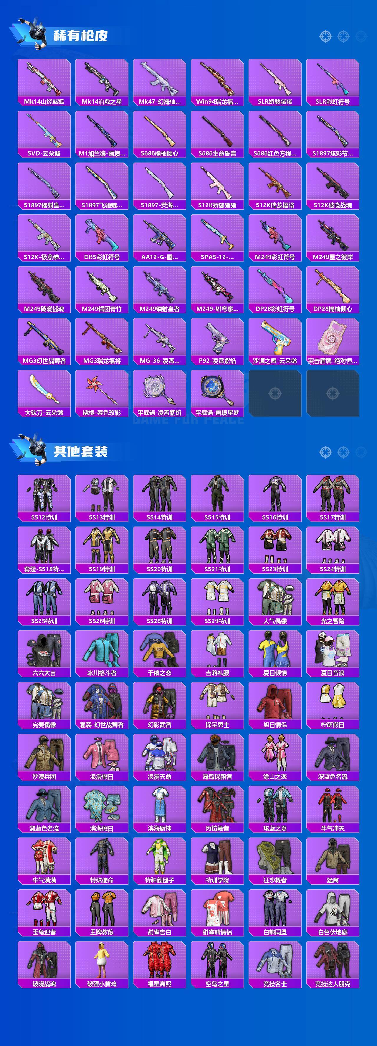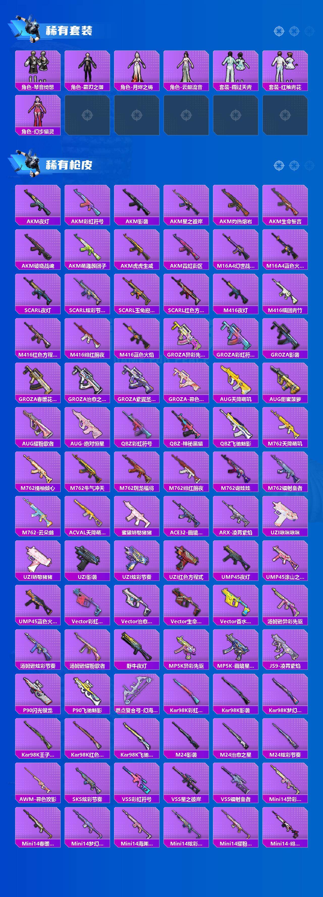 【粉色枪皮】:AKM-暮色玫影,M416-心之恋语,M416-电玩时刻,M416-灵猫魔法师,AUG-星之彼岸,AUG-罪夜之冕,UMP45-萌骑冒险,AKS-74U-森灵之息,Mk14-福马献瑞,M249-绝对恒星,DP-28-豹影疾电