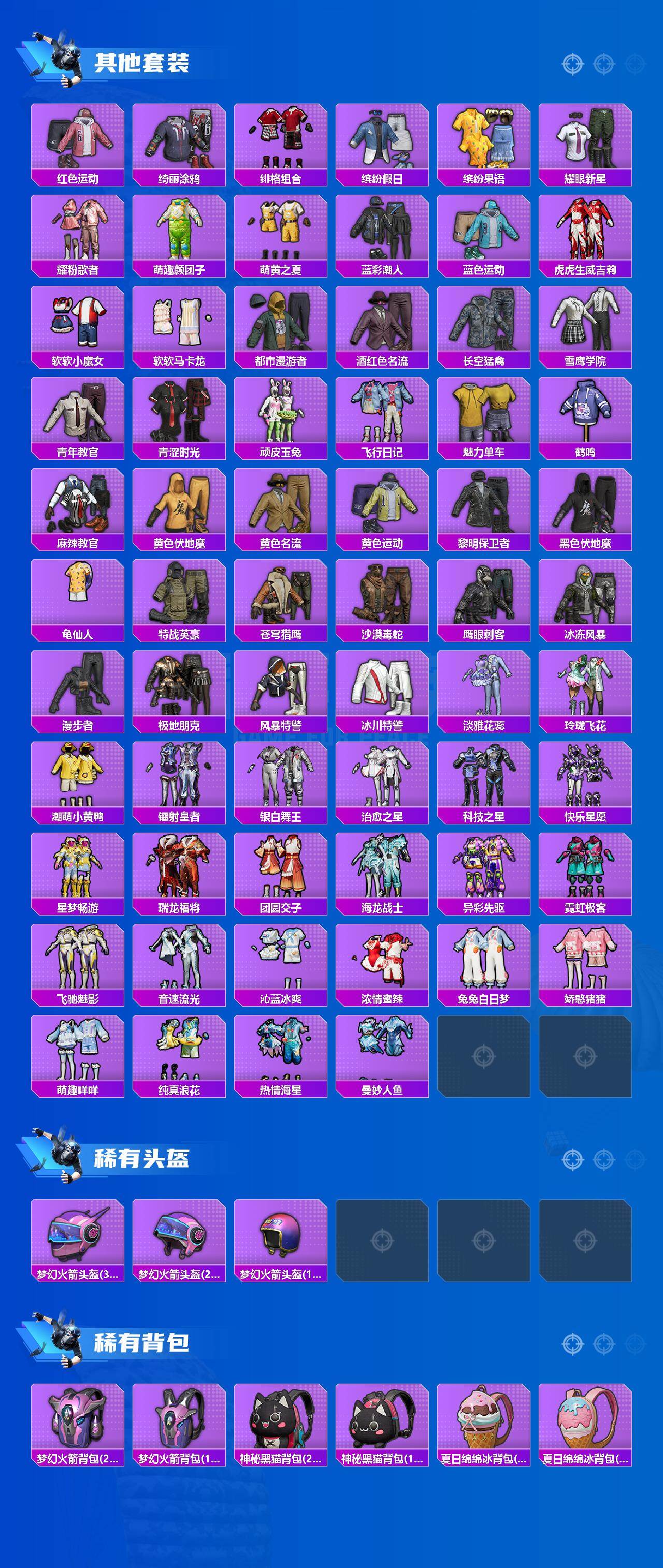 【稀有套装】:套装-龟仙人,角色-超感刻度,角色-甜心蒙太奇,套装-雪国风尚,套装-炫彩糖果,套装-马上有钱,套装-雏菊兔兔,套装-萝兰蝴蝶,套装-晶辉守护,角色-鲛海歌灵,套装-彩虹兔,套装-云朵鹅,套装-雪绒豹,角色-乐音,角色-夜瞳黯灵,套装-朱霞炽焰,套装-凌霄紫焰,套装-擎苍青焰,套装-书海巡游,套装-画境星梦,套装-琴音绮想,角色-霜刃之御,角色-月烬之祷,角色-云韶流音,套装-雨过天青,套装-红釉青花,角色-幻步猫灵