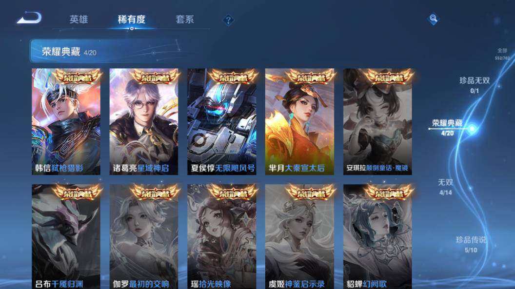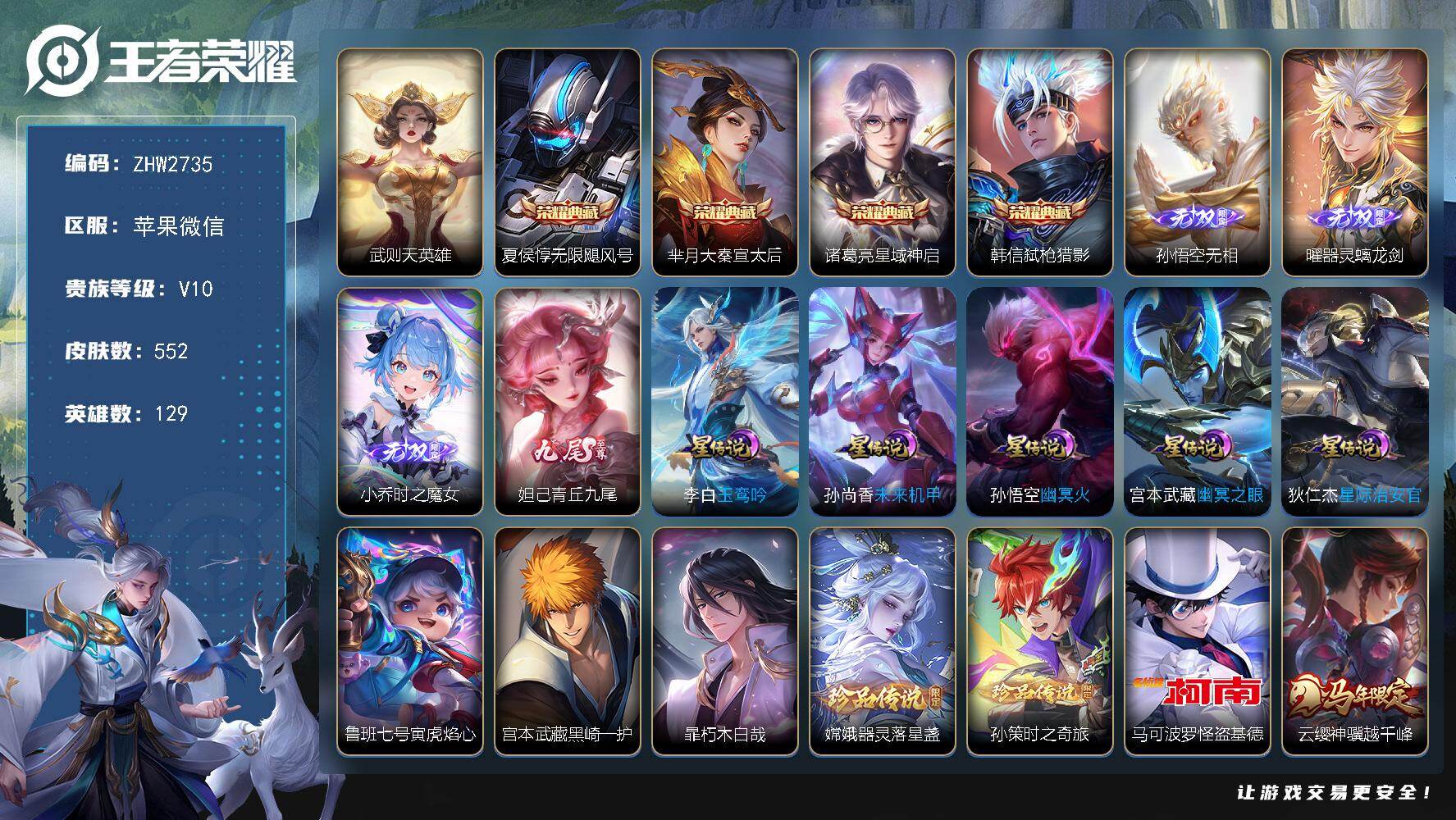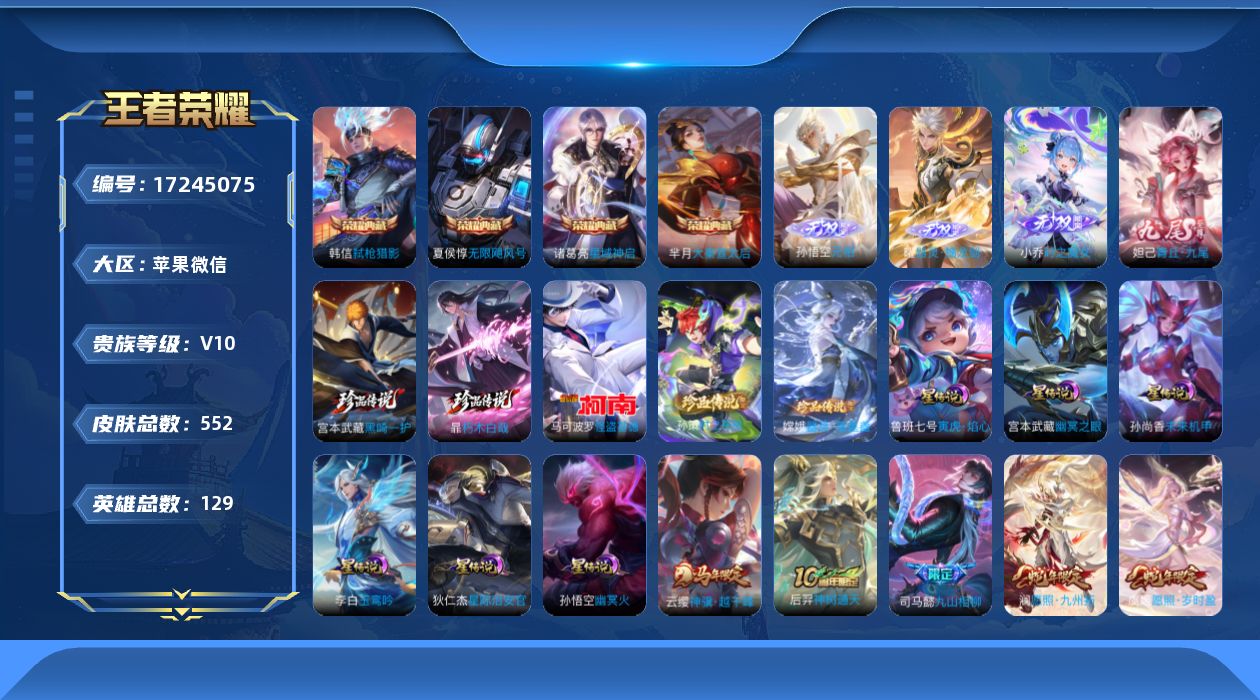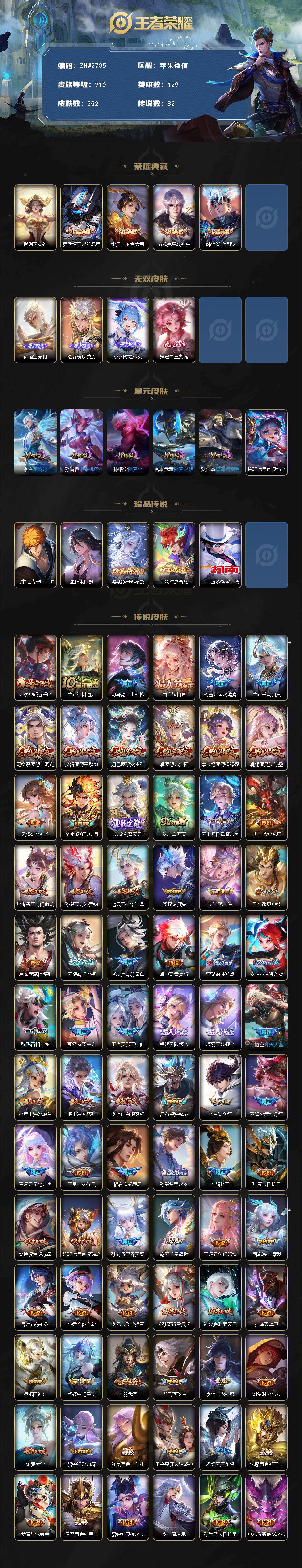[17245075]苹果WX-V10-最强王者段位-129英雄-552皮肤-4典藏皮肤-1典藏英雄-4无双-5珍品传说-82传说-171史诗