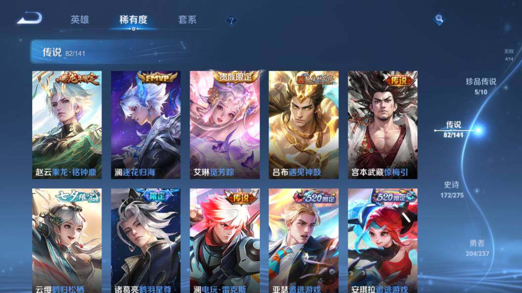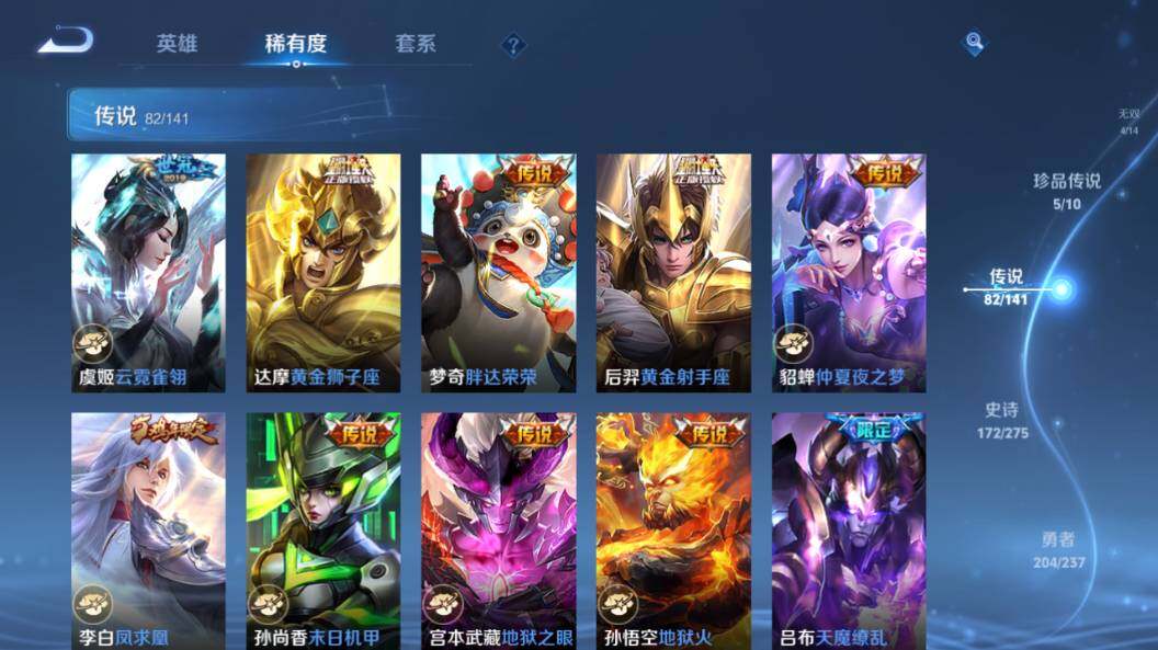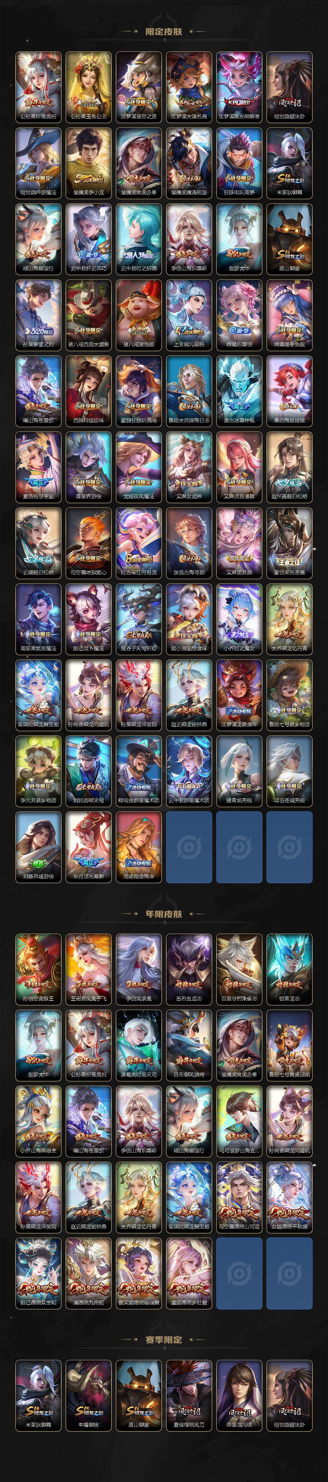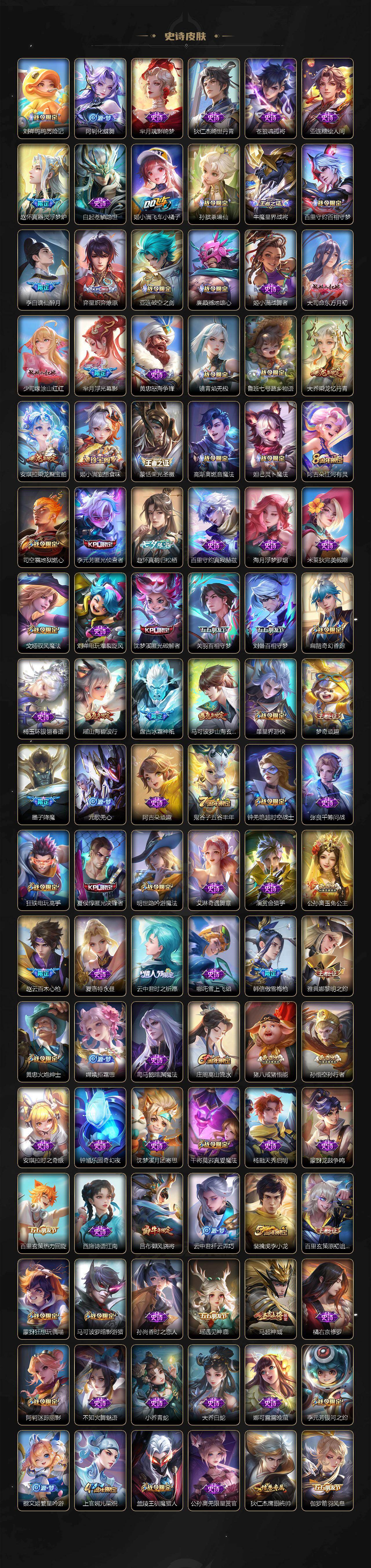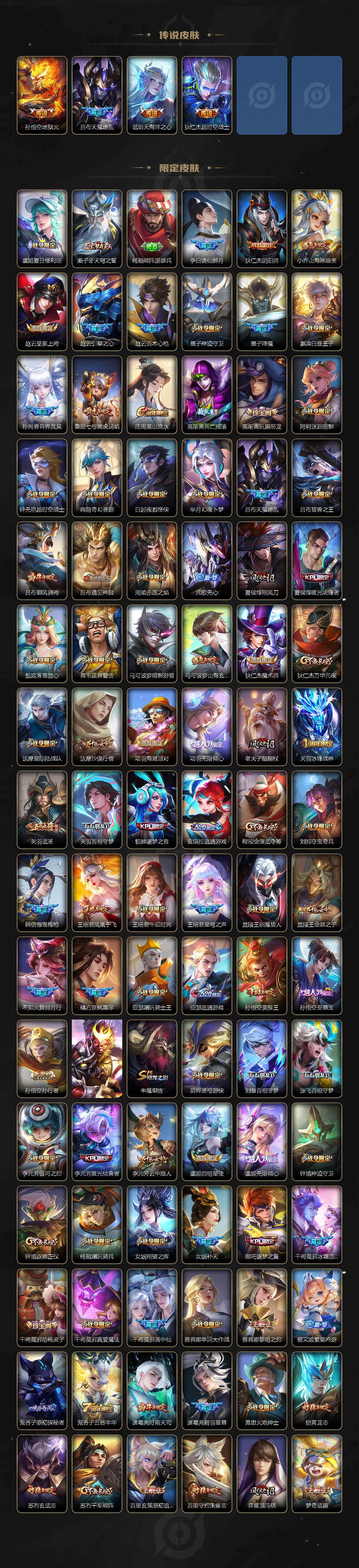 【传说皮肤】:云缨神骥越千峰,后羿神树通天,司马懿九山相柳,西施续相思,杨玉环星之鸣奏,后羿千劫归真,司空震愿照山河定,女娲愿照千秋盛,妲己愿照众生和,澜愿照九州拓,蔡文姬愿照福禄聚,虞姬愿照岁时盈,云缨幻光神枪,裴擒虎祥瑞亨通,嬴政玄雷天君,桑启鸣野蒿,云中君群星魔术团,典韦战鼓燎原,孙尚香乘龙问璇玑,孙策乘龙淬吴钩,赵云乘龙铭钟鼎,澜逐花归海,艾琳觅芳踪,吕布遇见神鼓,宫本武藏惊梅引,云缨鹤归松栖,诸葛亮鹤羽星尊,澜电玩雷克斯,亚瑟追逃游戏,安琪拉追逃游戏,张飞百相守梦,夏洛特浮生妄,干将莫邪画中仙,虞姬无限倾心,项羽无限倾心,孙悟空齐天大圣,小乔山海琳琅生,曜山海苍雷引,李信山海炽霜斩,吕布怒海麟威,李白诗剑行,不知火舞绯月行,王昭君星穹之声,百里守约碎云,橘右京枫霜尽,孙策挚爱之约,女娲补天,孙策末日机甲,裴擒虎寅虎赤拳,鲁班七号寅虎瑞焰,孙尚香异界灵契,赵云淬星耀世,王昭君乞巧织情,西施游龙清影,周瑜音你心动,小乔音你心动,李元芳飞鸢探春,公孙离祈雪灵祝,诸葛亮时雨天司,铠绛天战甲,镜炽阳神光,虞姬启明星使,关羽武圣,曜云鹰飞将,李信一念神魔,刘备时之恋人,伽罗太华,貂蝉猫影幻舞,张良黄金白羊座,干将莫邪久胜战神,虞姬云霓雀翎,达摩黄金狮子座,梦奇胖达荣荣,后羿黄金射手座,貂蝉仲夏夜之梦,李白凤求凰,孙尚香末日机甲,宫本武藏地狱之眼,孙悟空地狱火,吕布天魔缭乱,武则天海洋之心,狄仁杰超时空战士