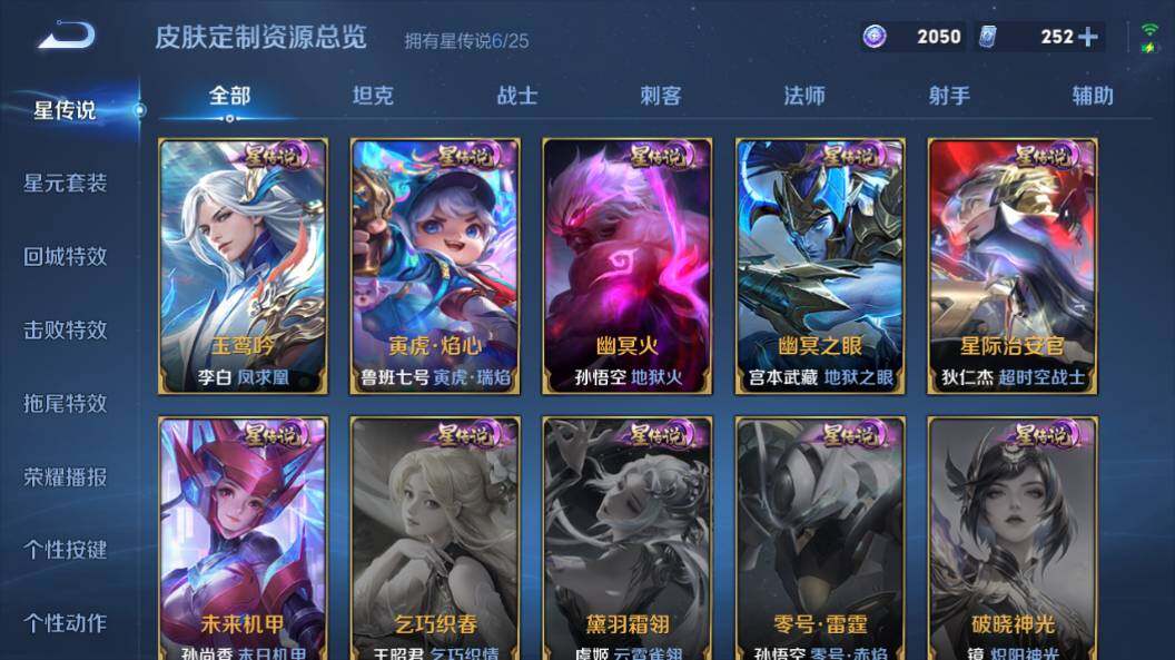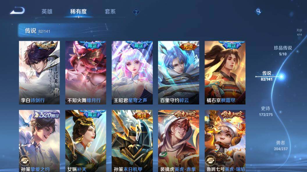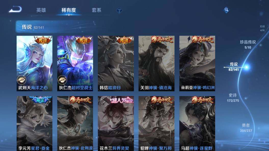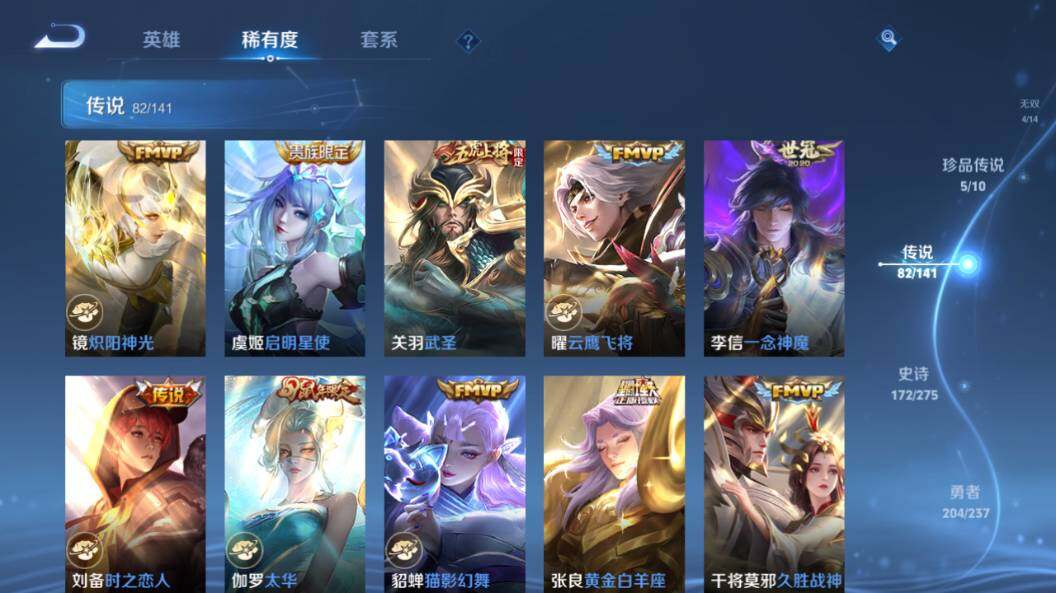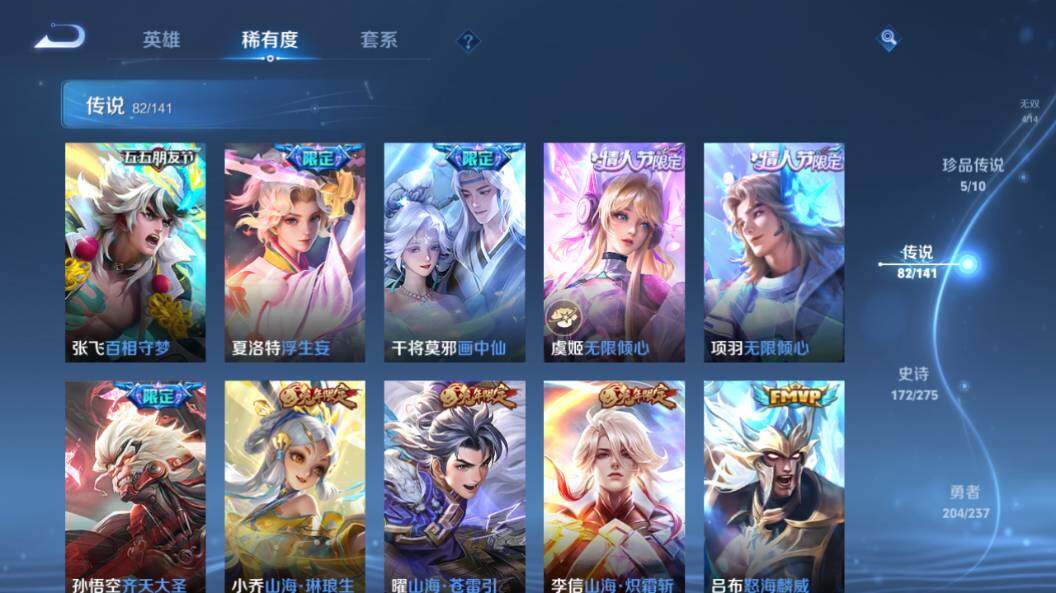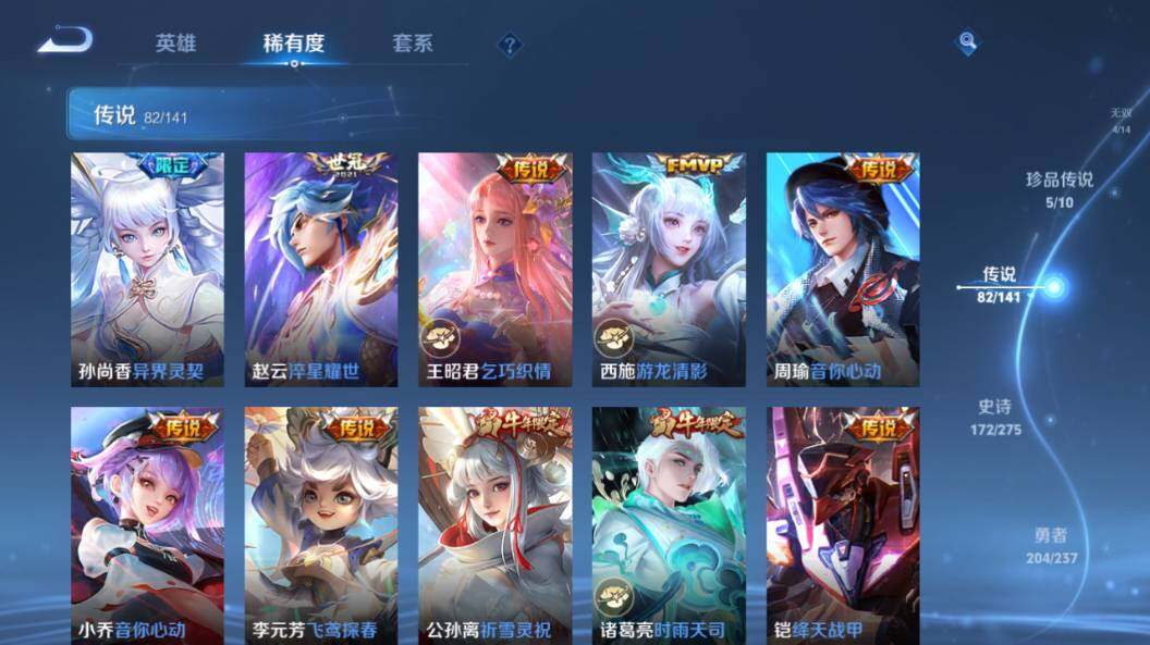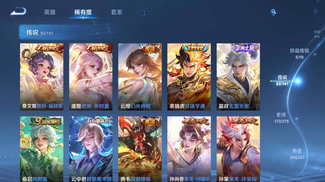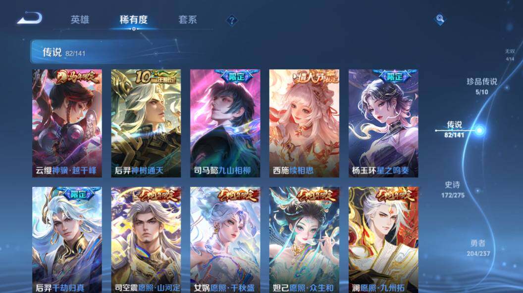 【传说皮肤】:云缨神骥越千峰,后羿神树通天,司马懿九山相柳,西施续相思,杨玉环星之鸣奏,后羿千劫归真,司空震愿照山河定,女娲愿照千秋盛,妲己愿照众生和,澜愿照九州拓,蔡文姬愿照福禄聚,虞姬愿照岁时盈,云缨幻光神枪,裴擒虎祥瑞亨通,嬴政玄雷天君,桑启鸣野蒿,云中君群星魔术团,典韦战鼓燎原,孙尚香乘龙问璇玑,孙策乘龙淬吴钩,赵云乘龙铭钟鼎,澜逐花归海,艾琳觅芳踪,吕布遇见神鼓,宫本武藏惊梅引,云缨鹤归松栖,诸葛亮鹤羽星尊,澜电玩雷克斯,亚瑟追逃游戏,安琪拉追逃游戏,张飞百相守梦,夏洛特浮生妄,干将莫邪画中仙,虞姬无限倾心,项羽无限倾心,孙悟空齐天大圣,小乔山海琳琅生,曜山海苍雷引,李信山海炽霜斩,吕布怒海麟威,李白诗剑行,不知火舞绯月行,王昭君星穹之声,百里守约碎云,橘右京枫霜尽,孙策挚爱之约,女娲补天,孙策末日机甲,裴擒虎寅虎赤拳,鲁班七号寅虎瑞焰,孙尚香异界灵契,赵云淬星耀世,王昭君乞巧织情,西施游龙清影,周瑜音你心动,小乔音你心动,李元芳飞鸢探春,公孙离祈雪灵祝,诸葛亮时雨天司,铠绛天战甲,镜炽阳神光,虞姬启明星使,关羽武圣,曜云鹰飞将,李信一念神魔,刘备时之恋人,伽罗太华,貂蝉猫影幻舞,张良黄金白羊座,干将莫邪久胜战神,虞姬云霓雀翎,达摩黄金狮子座,梦奇胖达荣荣,后羿黄金射手座,貂蝉仲夏夜之梦,李白凤求凰,孙尚香末日机甲,宫本武藏地狱之眼,孙悟空地狱火,吕布天魔缭乱,武则天海洋之心,狄仁杰超时空战士