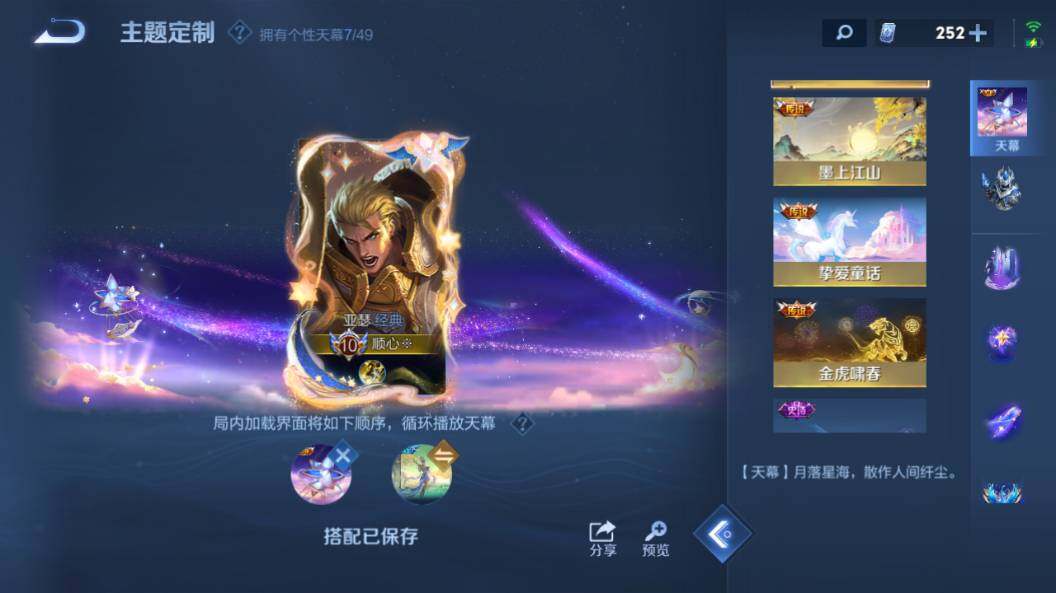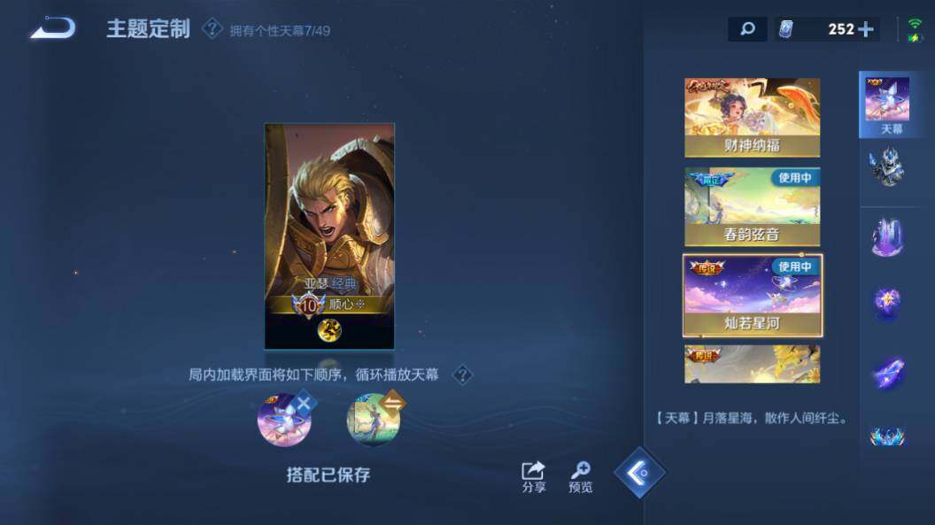达摩黄金狮子座,张良黄金白羊座,干将莫邪久胜战神,铠绛天战甲,貂蝉猫影幻舞,曜云鹰飞将,镜炽阳神光,西施游龙清影,虞姬云霓雀翎,李信一念神魔,赵云淬星耀世,小乔音你心动,周瑜音你心动,刘备时之恋人,李元芳飞鸢探春,王昭君乞巧织情,孙策末日机甲,孙策挚爱之约,百里守约碎云,干将莫邪画中仙,夏洛特浮生妄,张飞百相守梦,安琪拉追逃游戏,亚瑟追逃游戏,宫本武藏惊梅引,吕布遇见神鼓,艾琳觅芳踪,澜逐花归海,孙策乘龙·淬吴钩,赵云乘龙·铭钟鼎,孙尚香乘龙·问璇玑,典韦战鼓燎原,云中君群星魔术团,嬴政玄雷天君,裴擒虎祥瑞亨通,云缨幻光神枪,后羿千劫归真,杨玉环星之鸣奏,西施续相思