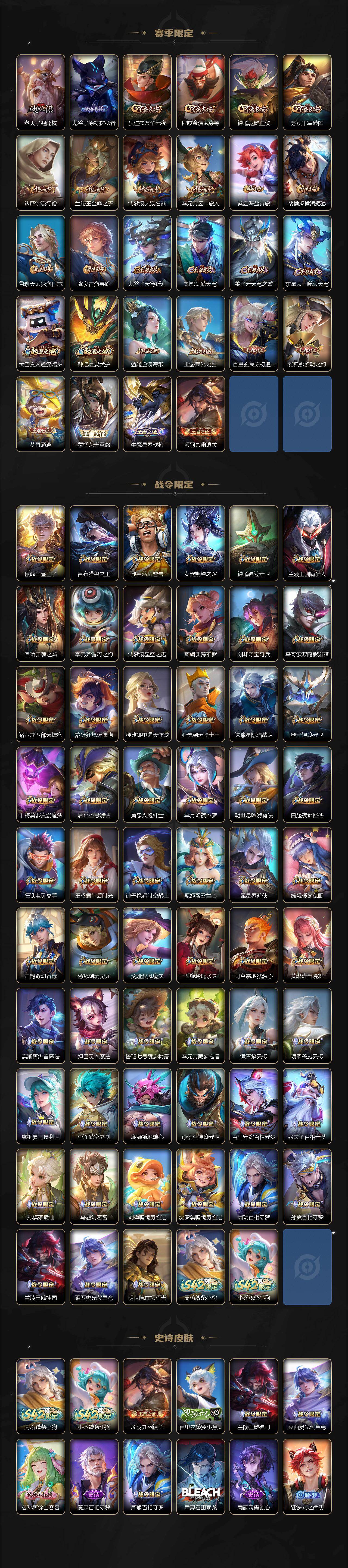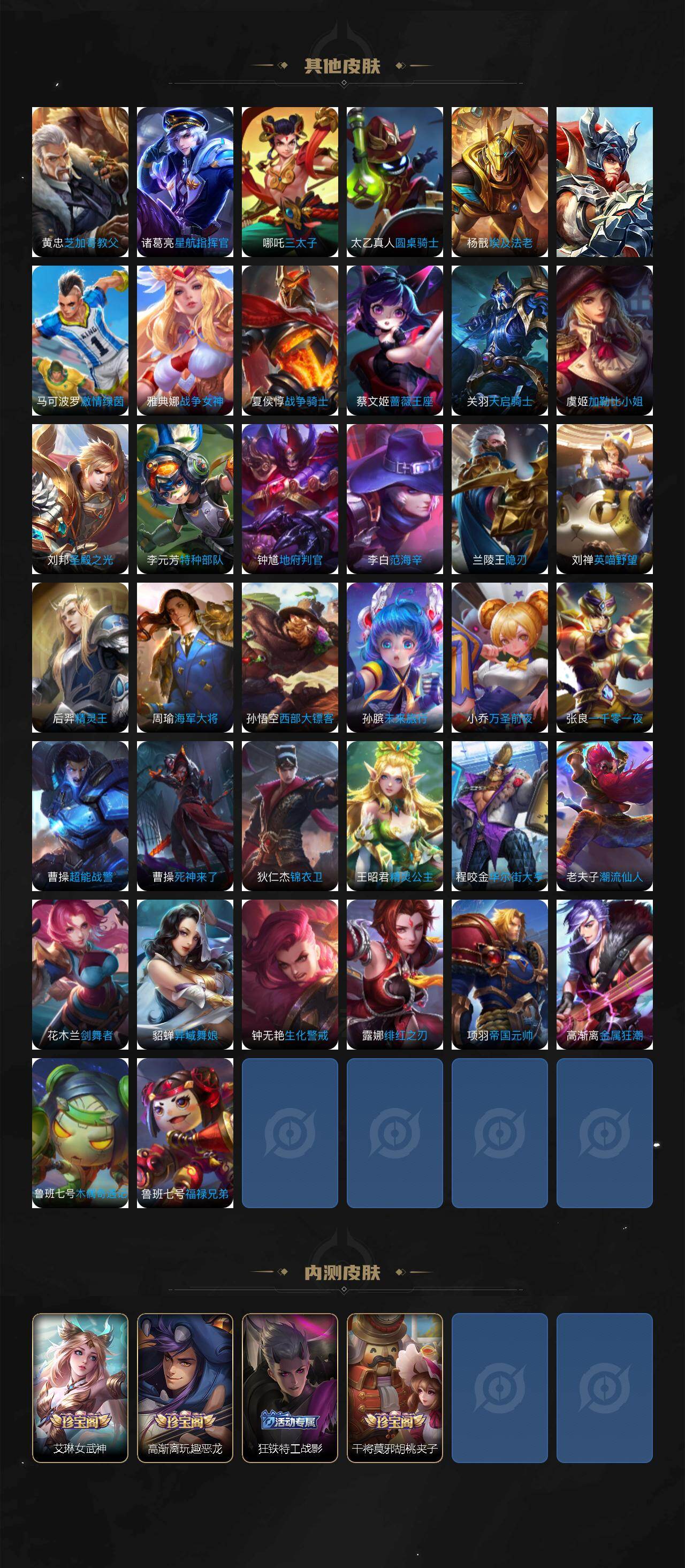 米莱狄御霄,牛魔御旌,盾山御銮,夏侯惇朔风刀,明世隐疑决卦,老夫子醍醐杖,鬼谷子原初探秘者,狄仁杰万华元夜,程咬金演武夺筹,钟馗驱傩正仪,苏烈千军破阵,吕布猎兽之王,嬴政白昼王子,女娲朔望之晖,典韦蓝屏警告,钟馗神迹守卫,沈梦溪星空之诺,李元芳银河之约,刘邦夺宝奇兵,马可波罗暗影游猎,蒙犽狂想玩偶喵,弈星混沌棋,达摩沙漠行僧,兰陵王金庭之子,沈梦溪大漠名商,李元芳云中旅人,桑启海盐诗旅,裴擒虎擒涛扼浪,鲁班大师探海日志,张良古海寻踪,项羽苍威无极,镜青焰无极