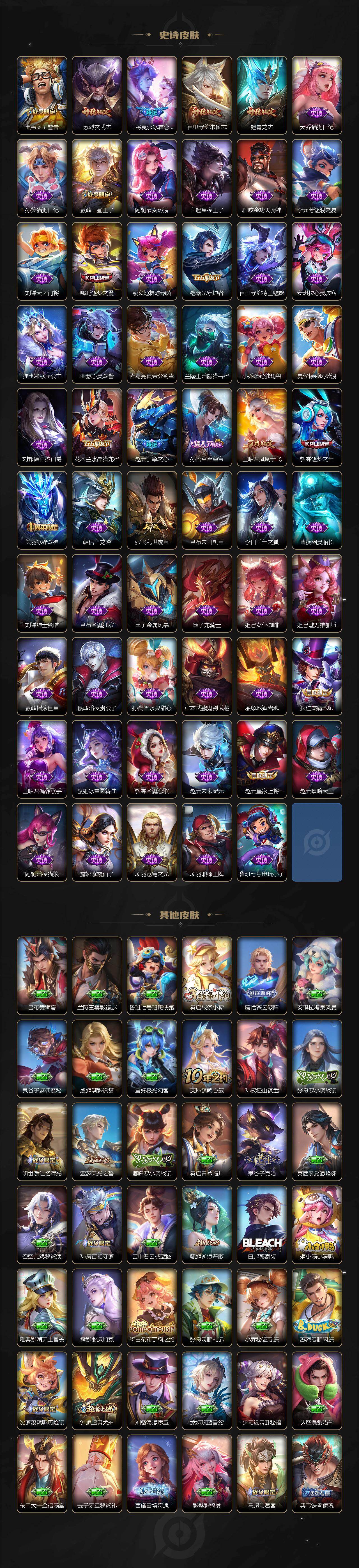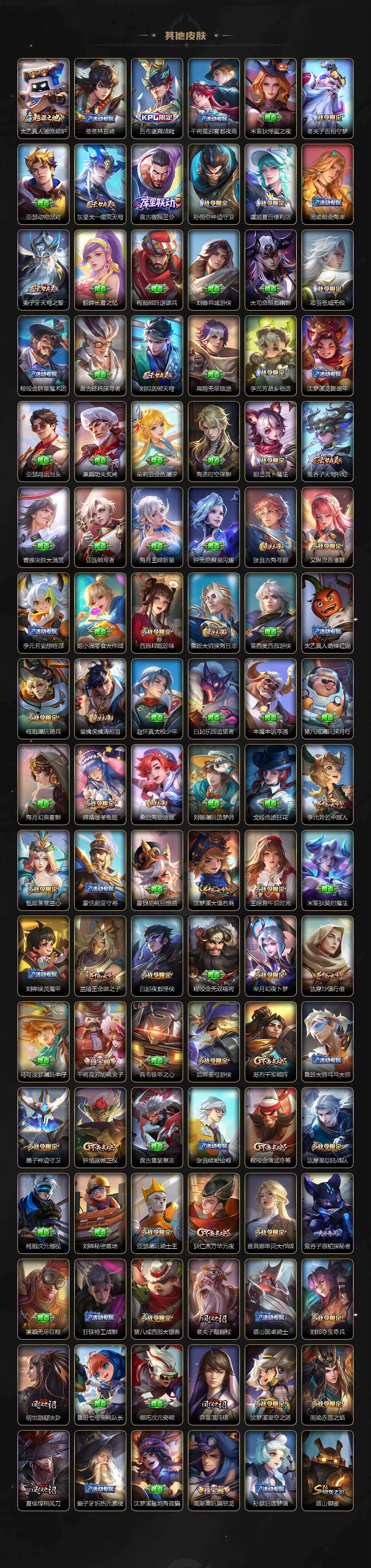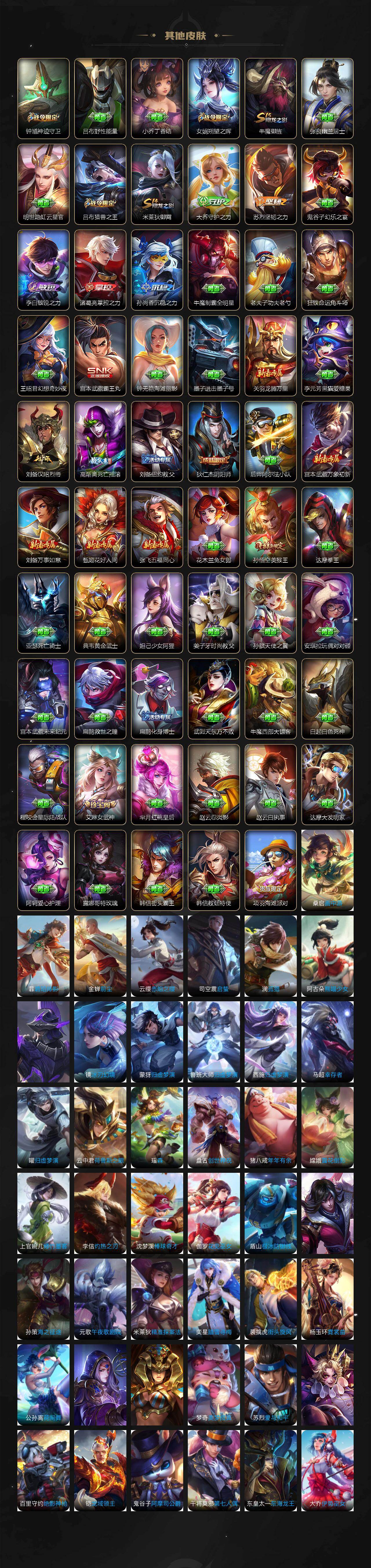 小乔青蛇,大乔白蛇,瑶遇见神鹿,娜可露露晚萤,伽罗箭羽风息,李元芳逐浪之夏,不知火舞魅语,公孙离无限星赏官,大乔猫狗日记,孙策猫狗日记,阿轲节奏热浪,露娜紫霞仙子,诸葛亮黄金分割率,王昭君偶像歌手,韩信白龙吟,项羽苍穹之光,孙尚香时之恋人,阿轲暗夜猫娘,雅典娜冰冠公主,吕布末日机甲,鲁班七号电玩小子,蒙犽龙鼓争鸣,橘右京修罗,墨子龙骑士,嬴政摇滚巨星,刘禅绅士熊喵,刘禅天才门将,白起星夜王子,安琪拉心灵骇客,安琪拉时之奇旅,程咬金功夫厨神,刘邦德古拉伯爵,兰陵王暗隐猎兽者,曹操幽灵船长,宫本武藏鬼剑武藏,司马懿暗渊魔法,亚瑟心灵战警,钟馗乐园奇幻夜,杨戬天秀·启明,蔡文姬舞动绿茵,廉颇地狱岩魂,西施诗语江南,小乔缤纷独角兽,夏侯惇乘风破浪,花木兰水晶猎龙者,铠曙光守护者,百里玄策热力回旋,墨子金属风暴,百里玄策原初追逐者,吕布圣诞狂欢,貂蝉圣诞恋歌,百里守约特工魅影,嬴政暗夜贵公子,嫦娥拒霜思,雅典娜黎明之约,李白千年之狐,哪吒雪上飞焰,夏洛特永昼,澜赏金猎手,艾琳奇遇舞章,张良千筹问战,阿古朵顽趣,杨玉环银翎春语,刘备百相守梦,关羽百相守梦,沈梦溪匿光破解者,刘禅电玩·爆裂旋风,海月浮梦罗烟,百里守约真我赫兹,赵怀真鹤归松栖,李元芳匿光侦查者,高渐离燃音魔法,大乔乘龙·忆丹青,安琪拉乘龙·聚宝船,李白谪仙醉月,姬小满飞车小橘子,白起苍鳞隐世,赵怀真器灵·浮梦炉,亚连糖绘人间,苍狼魂孤将,狄仁杰绮世丹青