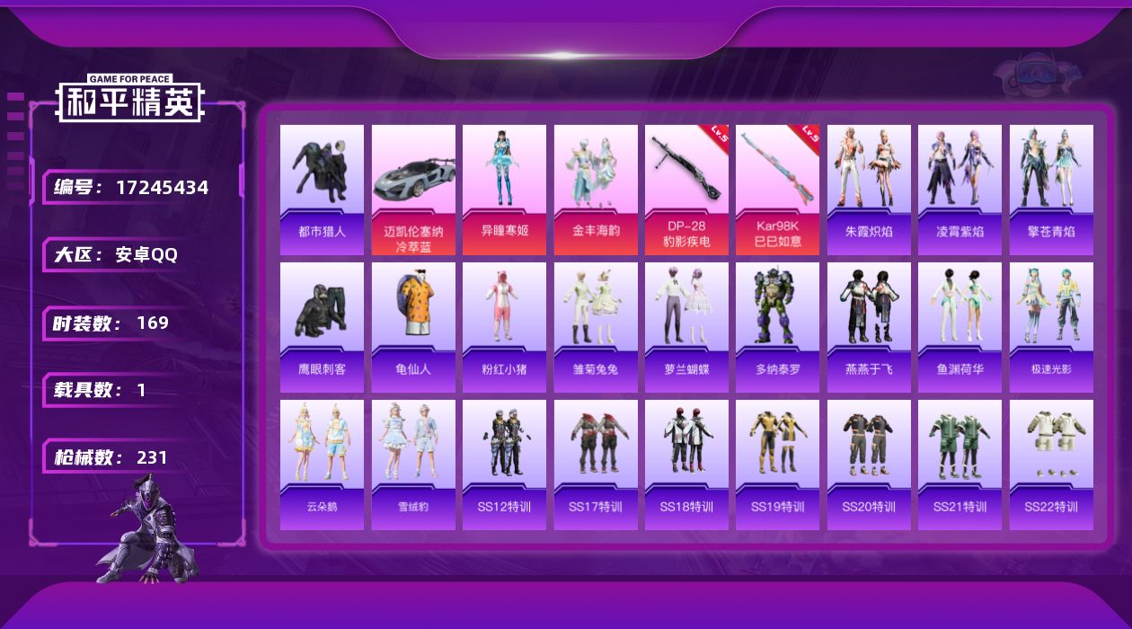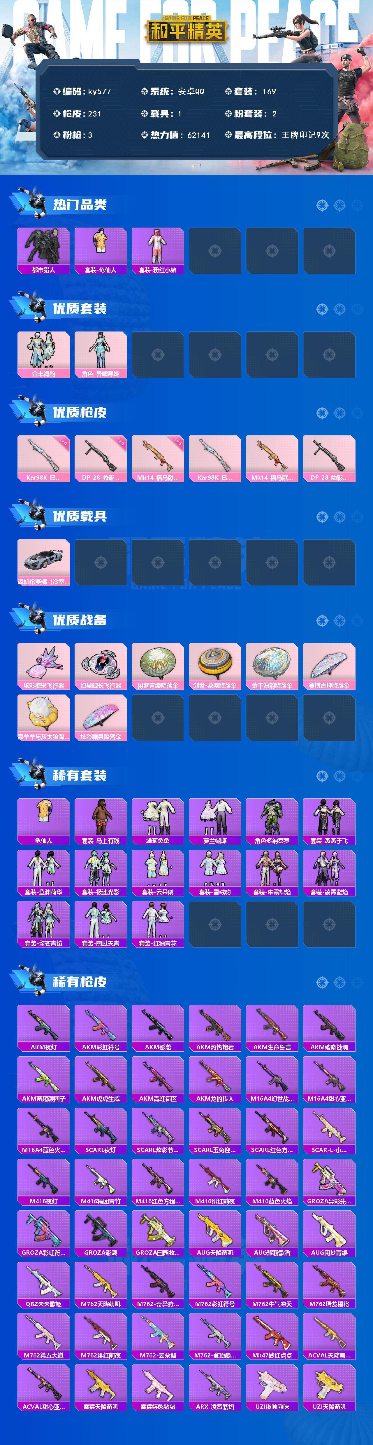 [17245434]安卓 手Q-2粉装-3特效枪-1载具-2粉色飞行器-62141热力值-9王牌印记-169套装-231枪皮 【热门品类】:套装-都市猎人,套装-龟仙人,套装-粉红小猪 【粉色套装】:粉装-金丰海韵,角色-异瞳寒姬 【粉色枪皮等级】:Kar98K-巳巳如意(五级),Mk14-福马献瑞(五级),DP-28-豹影疾电(五级) 【粉色载具】:迈凯伦塞纳(冷萃蓝) 【粉色枪皮】:Kar98K-巳巳如意,Mk14-福马献瑞,DP-28-豹影疾电 【粉色飞行器】:炫彩糖果飞行器,幻星舰长飞行器 【粉色降落伞】:闲梦青缨降落伞,创世·救赎降落伞,金丰海韵降落伞,赛博古神降落伞,喜羊羊与灰太狼降落伞,炫彩糖果降落伞 【稀有套装】:套装-龟仙人,套装-雪国风尚,套装-炫彩糖果,套装-马上有钱,套装-雏菊兔兔,套装-萝兰蝴蝶,角色-多纳泰罗,套装-燕燕于飞,套装-鱼渊荷华,套装-极速光影,套装-云朵鹅,套装-雪绒豹,套装-朱霞炽焰,套装-凌霄紫焰,套装-擎苍青焰,套装-雨过天青,套装-红釉青花 【稀有枪皮】:AUG-冰晶雪宝,AKM-夜灯,AKM-彩虹符号,AKM-影袭,AKM-灼热熔岩,AKM-生命誓言,AKM-破晓战魂,AKM-萌趣颜团子,AKM-虎虎生威,AKM-霓虹街区,AKM-龙的传人,M16A4-幻世战舞者,M16A4-甜心亚梦,M16A4-蓝色火焰,SCAR-L-夜灯,SCAR-L-炫彩节奏,SCAR-L-玉兔迎春,SCAR-L-红色方程式,SCAR-L-小狗蛇点点,M416-夜灯,M416-糯团青竹,M416-红色方程式,M416-绯红前夜,M416-蓝色火焰,GROZA-异彩先驱,GROZA-彩虹符号,GROZA-影袭,GROZA-田园牧歌,AUG-天降萌叽,AUG-耀粉歌者,AUG-闲梦青缨,QBZ-未来歌姬,M762-天降萌叽,M762-奇异狩猎者,M762-彩虹符号,M762-牛气冲天,M762-瑞龙福将,M762-第五大道,M762-绯红前夜,M762-云朵鹅,M762-登顶巅峰,Mk47-妙红点点,AC-VAL-天降萌叽,AC-VAL-甜心亚梦,蜜獾-天降萌叽,蜜獾-娇憨猪猪,ARX-凌霄紫焰,UZI-啾咪啾咪,UZI-天降萌叽,UZI-娇憨猪猪,UZI-幻影战神,UZI-影袭,UZI-红色方程式,UMP45-夜灯,UMP45-蓝色火焰,UMP45-绒宝小鹅,
