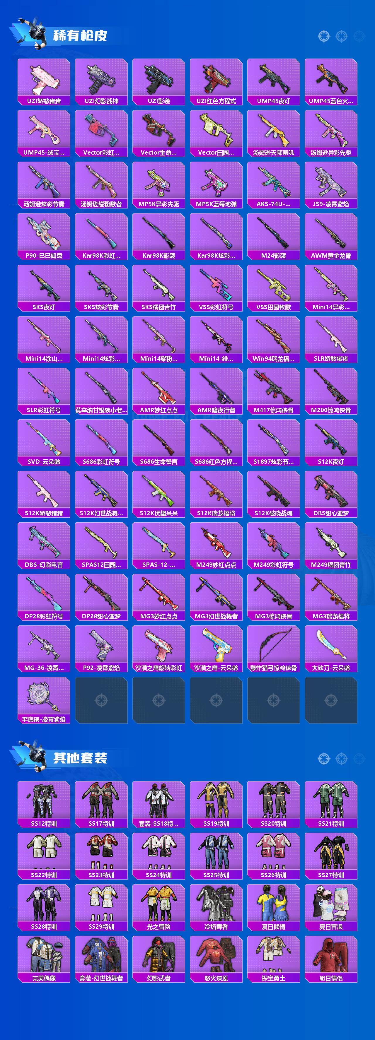 【稀有枪皮】:AUG-冰晶雪宝,AKM-夜灯,AKM-彩虹符号,AKM-影袭,AKM-灼热熔岩,AKM-生命誓言,AKM-破晓战魂,AKM-萌趣颜团子,AKM-虎虎生威,AKM-霓虹街区,AKM-龙的传人,M16A4-幻世战舞者,M16A4-甜心亚梦,M16A4-蓝色火焰,SCAR-L-夜灯,SCAR-L-炫彩节奏,SCAR-L-玉兔迎春,SCAR-L-红色方程式,SCAR-L-小狗蛇点点,M416-夜灯,M416-糯团青竹,M416-红色方程式,M416-绯红前夜,M416-蓝色火焰,GROZA-异彩先驱,GROZA-彩虹符号,GROZA-影袭,GROZA-田园牧歌,AUG-天降萌叽,AUG-耀粉歌者,AUG-闲梦青缨,QBZ-未来歌姬,M762-天降萌叽,M762-奇异狩猎者,M762-彩虹符号,M762-牛气冲天,M762-瑞龙福将,M762-第五大道,M762-绯红前夜,M762-云朵鹅,M762-登顶巅峰,Mk47-妙红点点,AC-VAL-天降萌叽,AC-VAL-甜心亚梦,蜜獾-天降萌叽,蜜獾-娇憨猪猪,ARX-凌霄紫焰,UZI-啾咪啾咪,UZI-天降萌叽,UZI-娇憨猪猪,UZI-幻影战神,UZI-影袭,UZI-红色方程式,UMP45-夜灯,UMP45-蓝色火焰,UMP45-绒宝小鹅,