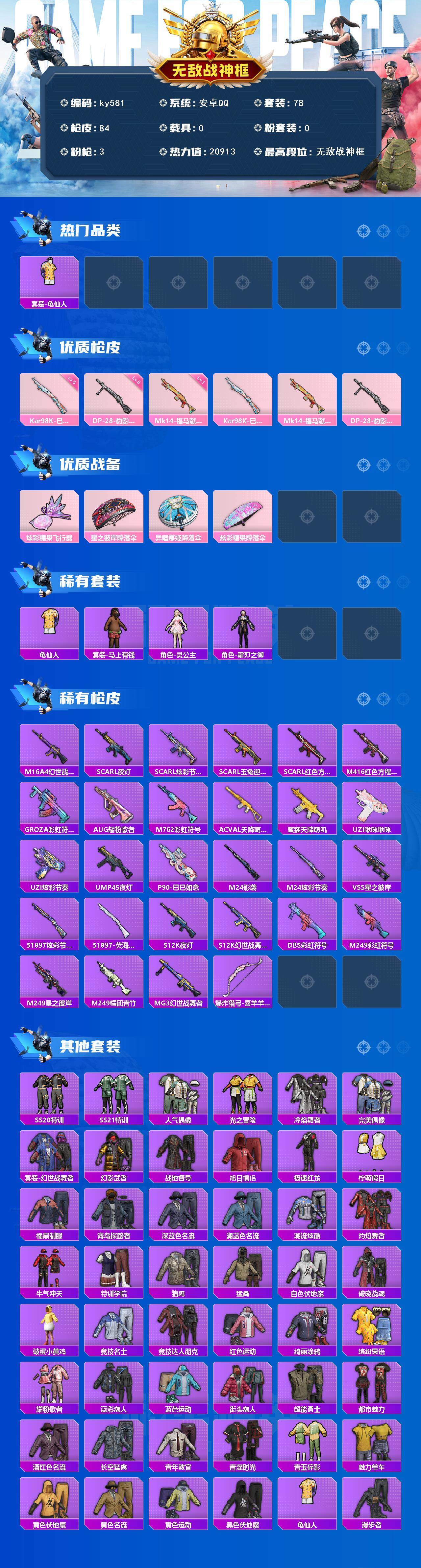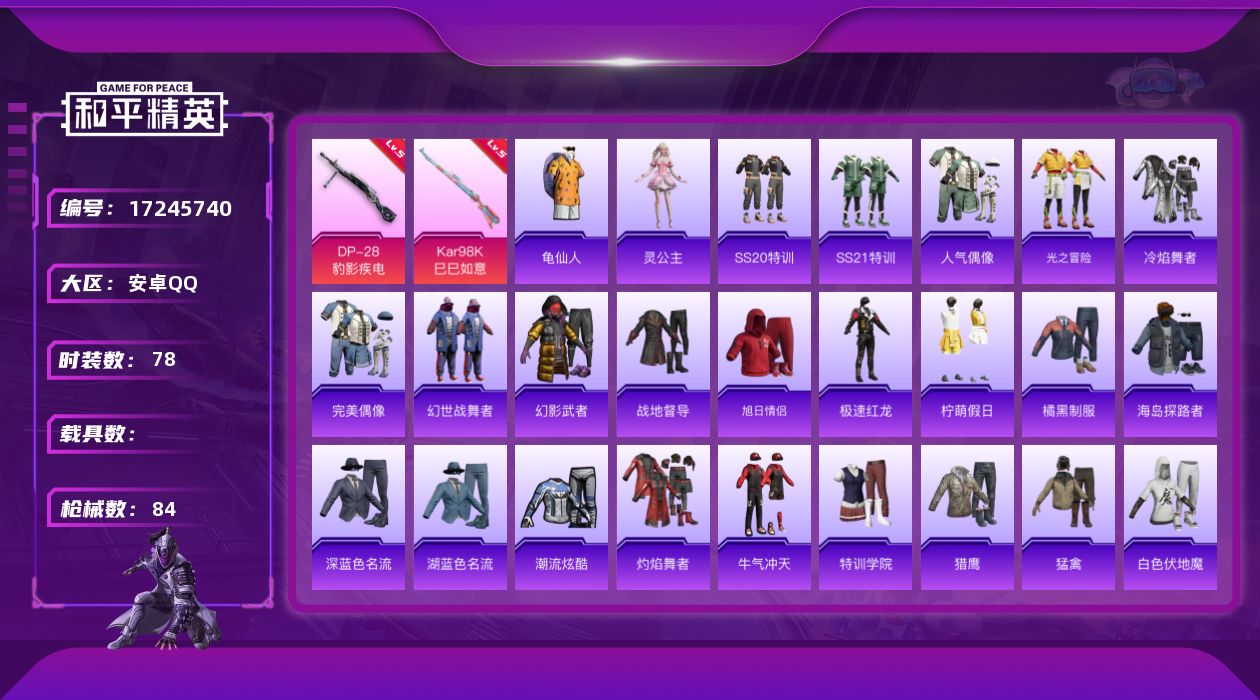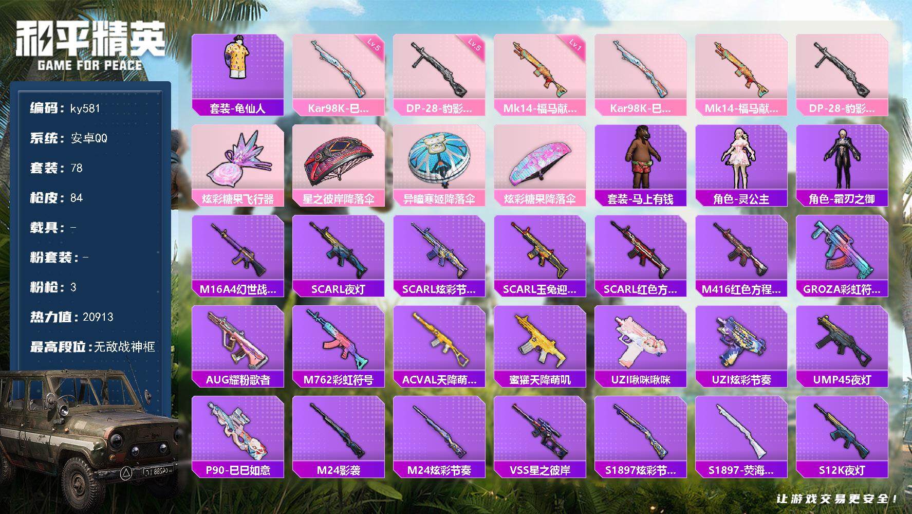 [17245740]安卓 手Q-无敌战神框-0粉装-3特效枪-0载具-1粉色飞行器-20913热力值-5王牌印记-78套装-84枪皮