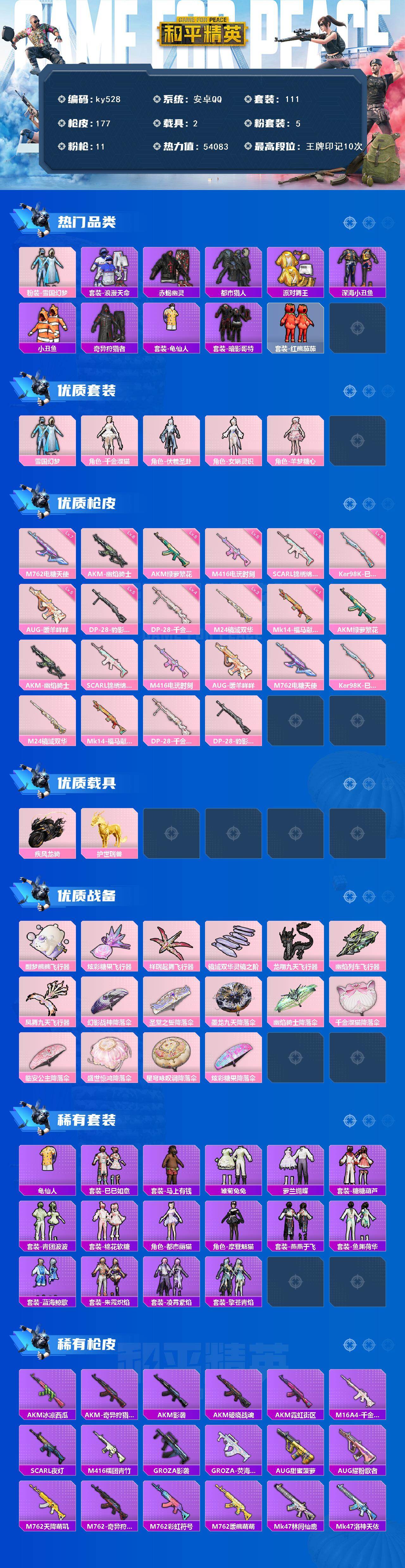 [17246019]安卓 手Q-5粉装-11特效枪-2载具-7粉色飞行器-54083热力值-10王牌印记-111套装-177枪皮 【热门品类】:粉装-雪国幻梦,套装-浪漫天命,套装-赤蝎幽灵,套装-都市猎人,套装-派对舞王,套装-深海小丑鱼,套装-小丑鱼,套装-奇异狩猎者,套装-龟仙人,套装-暗影哥特,套装-红熊茄茄 【粉色套装】:粉装-雪国幻梦,角色-千金淑猫,角色-伏羲圣卦,角色-女娲灵识,角色-羊梦糖心 【粉色枪皮等级】:AKM-绿萝繁花(五级),AKM-幽焰骑士(六级),SCAR-L-锦绣绵绵(五级),M416-电玩时刻(五级),AUG-暖羊咩咩(五级),M762-电糖天使(七级),Kar98K-巳巳如意(五级),M24-镜域双华(三级),Mk14-福马献瑞(一级),DP-28-千金淑猫(四级),DP-28-豹影疾电(五级) 【粉色载具】:疾风龙骑,护世瑞兽 【粉色枪皮】:AKM-绿萝繁花,AKM-幽焰骑士,SCAR-L-锦绣绵绵,M416-电玩时刻,AUG-暖羊咩咩,M762-电糖天使,Kar98K-巳巳如意,M24-镜域双华,Mk14-福马献瑞,DP-28-千金淑猫,DP-28-豹影疾电 【粉色飞行器】:酣梦熊熊飞行器,炫彩糖果飞行器,祥瑞起舞飞行器,镜域双华-灵镜之阶,龙翔九天飞行器,幽焰列车飞行器,凤舞九天飞行器 【粉色降落伞】:幻影战神降落伞,圣堂之誓降落伞,墨龙九天降落伞,幽焰骑士降落伞,千金淑猫降落伞,临安公主降落伞,盛世惊鸿降落伞,星穹咏叹调降落伞,炫彩糖果降落伞 【稀有套装】:套装-龟仙人,套装-巳巳如意,套装-雪国风尚,套装-炫彩糖果,套装-马上有钱,套装-雏菊兔兔,套装-萝兰蝴蝶,套装-糖糖葫芦,套装-青团波波,套装-棉花软糖,角色-都市丽猫,角色-摩登魅猫,套装-燕燕于飞,套装-鱼渊荷华,套装-蓝海鲸歌,套装-朱霞炽焰,套装-凌霄紫焰,套装-擎苍青焰 【稀有枪皮】:AUG-冰晶雪宝,AKM-冰凉西瓜,AKM-奇异狩猎者,AKM-影袭,AKM-破晓战魂,AKM-霓虹街区,M16A4-千金淑猫,SCAR-L-夜灯,M416-糯团青竹,GROZA-影袭,GROZA-荧海星豚,AUG-甜蜜菠萝,AUG-耀粉歌者,M762-天降萌叽,M762-奇异狩猎者,M762-彩虹符号,M762-暖熊萌萌,Mk47-林间仙鹿,Mk47-洛神天依,G36C-镜域双华,G36C