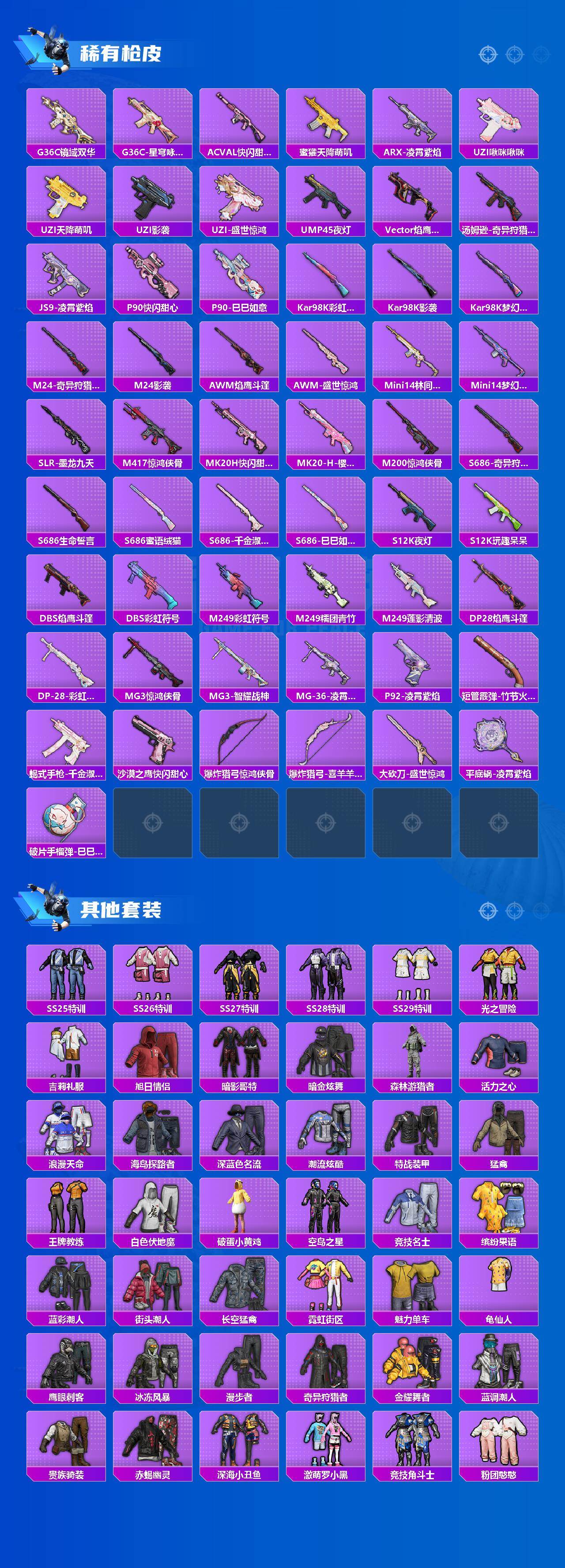【稀有枪皮】:AUG-冰晶雪宝,AKM-冰凉西瓜,AKM-奇异狩猎者,AKM-影袭,AKM-破晓战魂,AKM-霓虹街区,M16A4-千金淑猫,SCAR-L-夜灯,M416-糯团青竹,GROZA-影袭,GROZA-荧海星豚,AUG-甜蜜菠萝,AUG-耀粉歌者,M762-天降萌叽,M762-奇异狩猎者,M762-彩虹符号,M762-暖熊萌萌,Mk47-林间仙鹿,Mk47-洛神天依,G36C-镜域双华,G36C