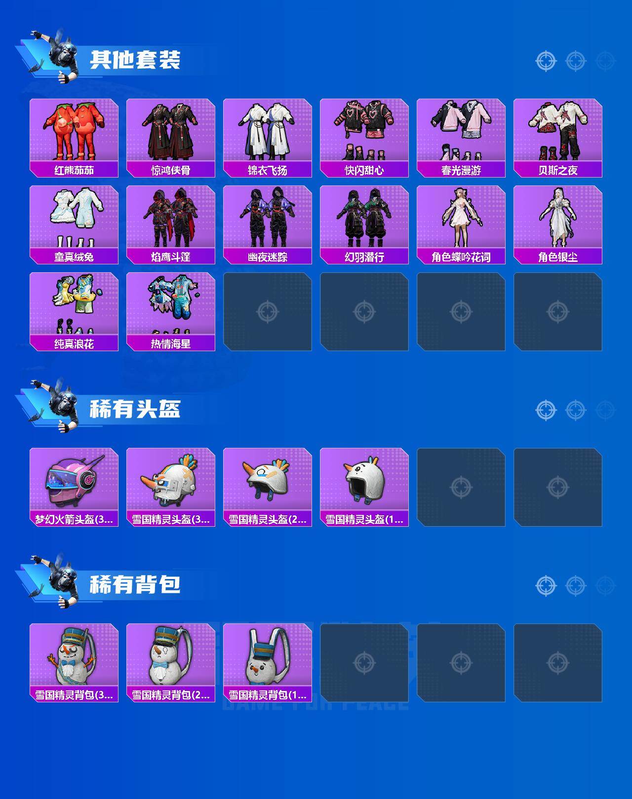 套装-雪国幻梦,套装-赤蝎幽灵,套装-都市猎人,套装-派对舞王,套装-深海小丑鱼,套装-奇异狩猎者,角色-千金淑猫,角色-伏羲圣卦,角色-女娲灵识,套装-鹰眼刺客