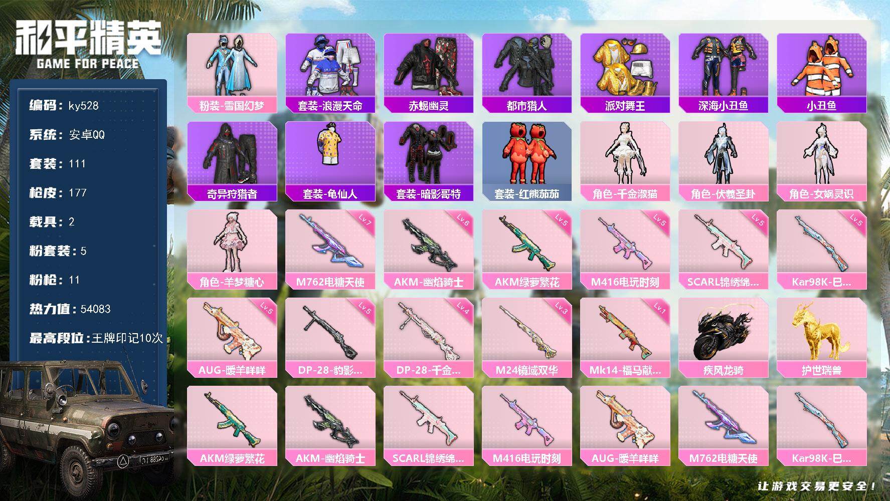 [17246019]安卓 手Q-5粉装-11特效枪-2载具-7粉色飞行器-54083热力值-10王牌印记-111套装-177枪皮