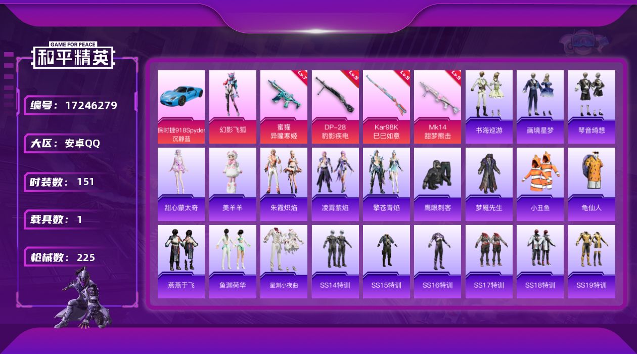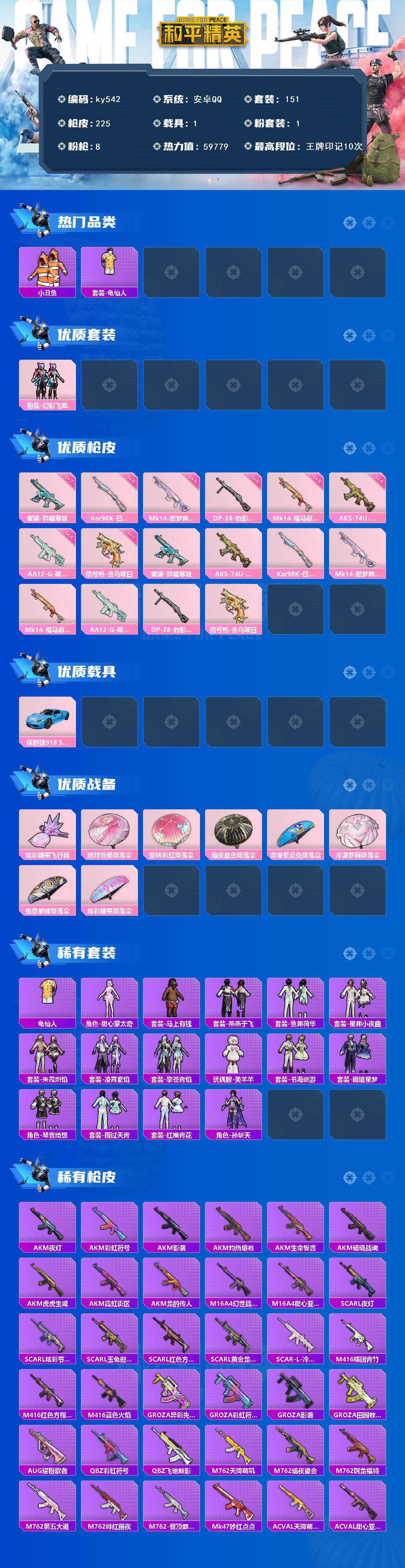 [17246279]安卓 手Q-1粉装-8特效枪-1载具-1粉色飞行器-59779热力值-10王牌印记-151套装-225枪皮 【热门品类】:套装-小丑鱼,套装-龟仙人 【粉色套装】:粉装-幻影飞狐 【粉色枪皮等级】:蜜獾-异瞳寒姬(七级),AKS-74U-森灵之息(四级),Kar98K-巳巳如意(五级),Mk14-甜梦熊击(五级),Mk14-福马献瑞(五级),AA12-G-萌骑幻想(四级),DP-28-豹影疾电(五级),信号枪-金乌曜日(一级) 【粉色载具】:保时捷918 Spyder(沉静蓝) 【粉色枪皮】:蜜獾-异瞳寒姬,AKS-74U-森灵之息,Kar98K-巳巳如意,Mk14-甜梦熊击,Mk14-福马献瑞,AA12-G-萌骑幻想,DP-28-豹影疾电,信号枪-金乌曜日 【粉色飞行器】:炫彩糖果飞行器 【粉色降落伞】:绝对恒星降落伞,旋转彩虹降落伞,暗夜鎏金降落伞,音爆索尼克降落伞,冷漠罗丽降落伞,极意拳锋降落伞,炫彩糖果降落伞 【稀有套装】:套装-龟仙人,角色-甜心蒙太奇,套装-雪国风尚,套装-炫彩糖果,套装-马上有钱,套装-燕燕于飞,套装-鱼渊荷华,套装-星渊小夜曲,套装-朱霞炽焰,套装-凌霄紫焰,套装-擎苍青焰,玩偶服-美羊羊,套装-书海巡游,套装-画境星梦,套装-琴音绮想,套装-雨过天青,套装-红釉青花,角色-孙斩天 【稀有枪皮】:AUG-冰晶雪宝,AKM-夜灯,AKM-彩虹符号,AKM-影袭,AKM-灼热熔岩,AKM-生命誓言,AKM-破晓战魂,AKM-虎虎生威,AKM-霓虹街区,AKM-龙的传人,M16A4-幻世战舞者,M16A4-甜心亚梦,SCAR-L-夜灯,SCAR-L-炫彩节奏,SCAR-L-玉兔迎春,SCAR-L-红色方程式,SCAR-L-黄金龙骨,SCAR-L-冷漠罗丽,M416-糯团青竹,M416-红色方程式,M416-蓝色火焰,GROZA-异彩先驱,GROZA-彩虹符号,GROZA-影袭,GROZA-田园牧歌,AUG-耀粉歌者,QBZ-彩虹符号,QBZ-飞驰魅影,M762-天降萌叽,M762-暗夜鎏金,M762-瑞龙福将,M762-第五大道,M762-绯红前夜,M762-登顶巅峰,Mk47-妙红点点,AC-VAL-天降萌叽,AC-VAL-甜心亚梦,AC-VAL-闲梦青缨,蜜獾-天降萌叽,蜜獾-娇憨猪猪,ACE32-画境星梦,ARX-凌霄紫焰,UZI-