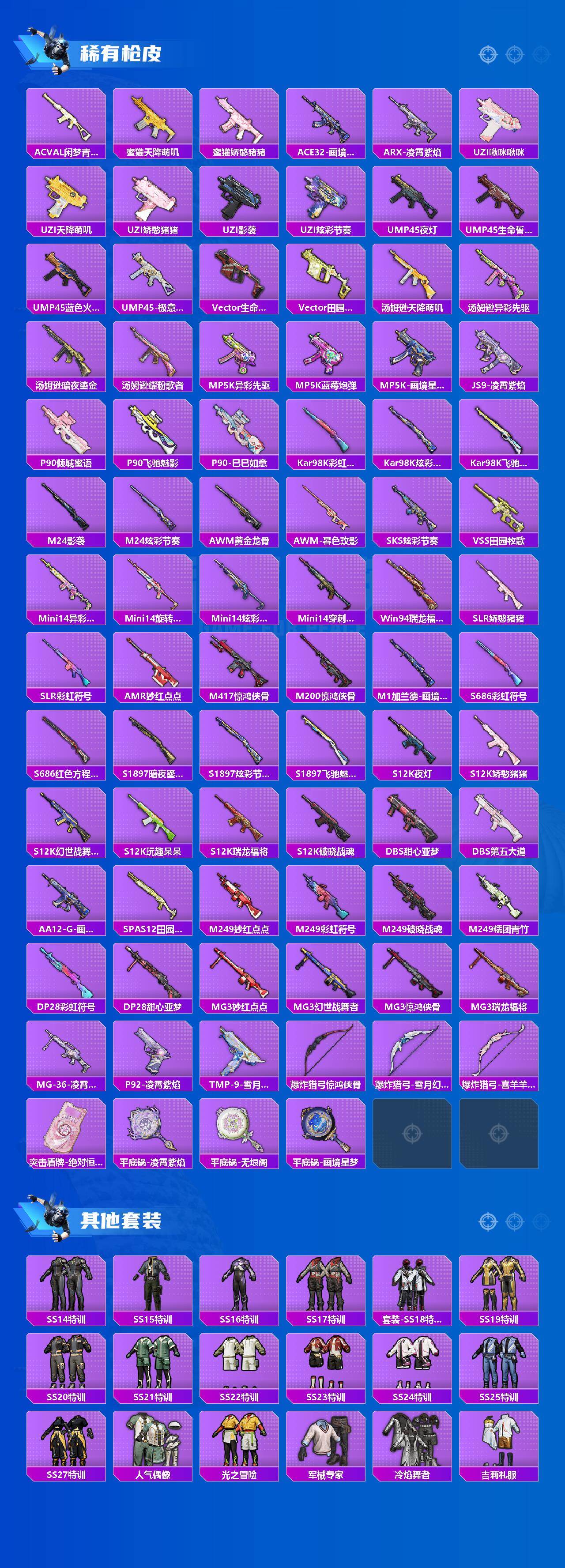 【稀有枪皮】:AUG-冰晶雪宝,AKM-夜灯,AKM-彩虹符号,AKM-影袭,AKM-灼热熔岩,AKM-生命誓言,AKM-破晓战魂,AKM-虎虎生威,AKM-霓虹街区,AKM-龙的传人,M16A4-幻世战舞者,M16A4-甜心亚梦,SCAR-L-夜灯,SCAR-L-炫彩节奏,SCAR-L-玉兔迎春,SCAR-L-红色方程式,SCAR-L-黄金龙骨,SCAR-L-冷漠罗丽,M416-糯团青竹,M416-红色方程式,M416-蓝色火焰,GROZA-异彩先驱,GROZA-彩虹符号,GROZA-影袭,GROZA-田园牧歌,AUG-耀粉歌者,QBZ-彩虹符号,QBZ-飞驰魅影,M762-天降萌叽,M762-暗夜鎏金,M762-瑞龙福将,M762-第五大道,M762-绯红前夜,M762-登顶巅峰,Mk47-妙红点点,AC-VAL-天降萌叽,AC-VAL-甜心亚梦,AC-VAL-闲梦青缨,蜜獾-天降萌叽,蜜獾-娇憨猪猪,ACE32-画境星梦,ARX-凌霄紫焰,UZI-