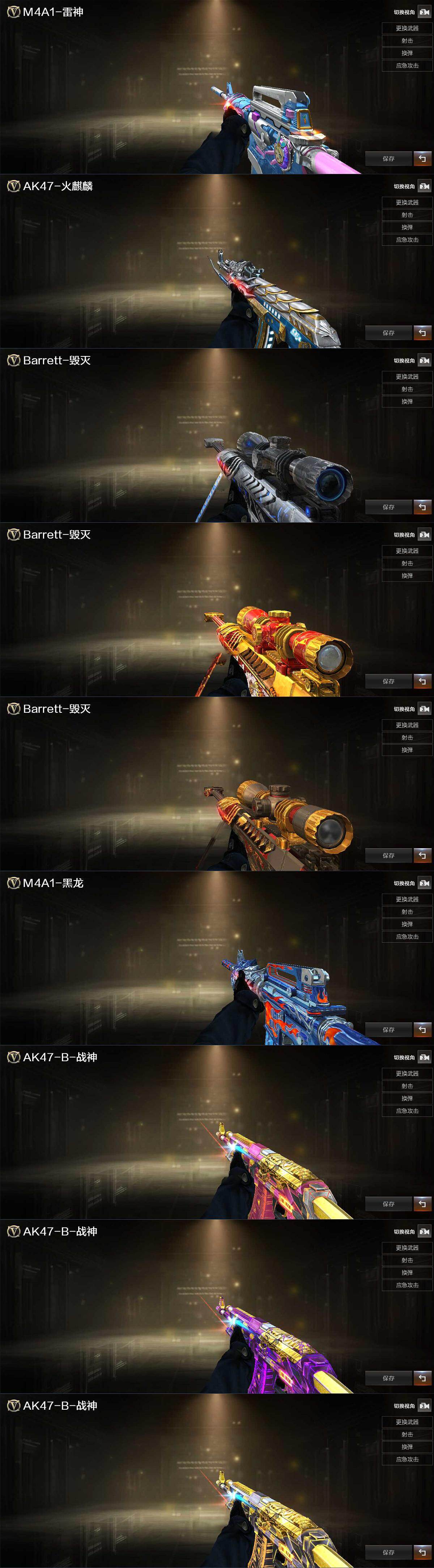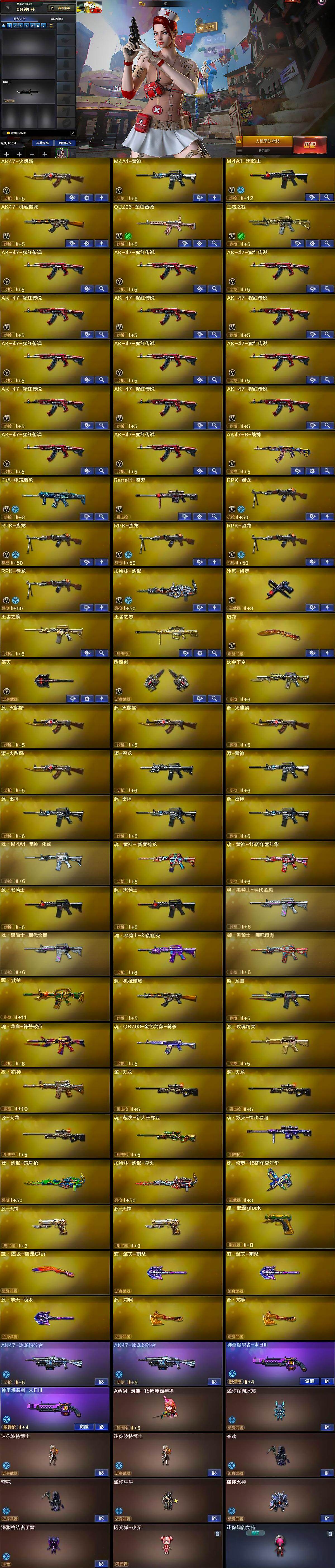【英雄级武器】:AK47-火麒麟,M4A1-雷神,M4A1-黑骑士,AK47-机械迷城,QBZ03-金色蔷薇,9A91-烈火,王者之戮-觉醒版,AK-47-猩红传说*14,AK47-B-战神,白虎-电玩蓝兔,Barrett-毁灭,RPK-盘龙*5,加特林-炼狱,沙鹰-修罗,屠龙,擎天,麒麟刺