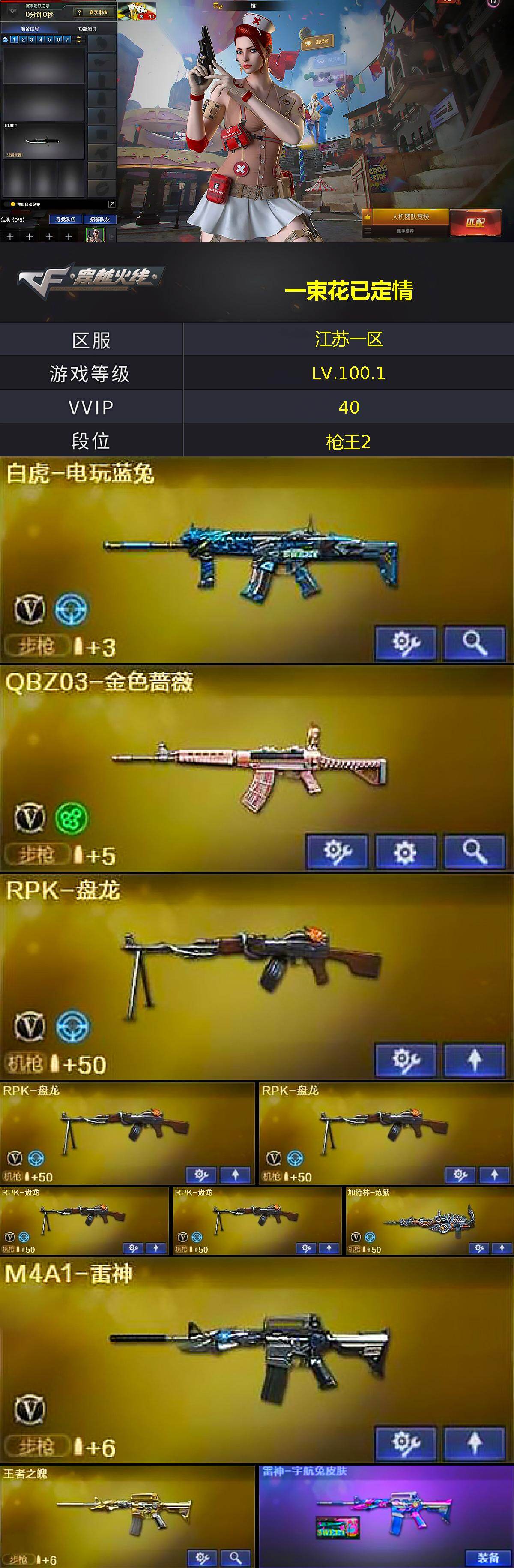 【热门武器】:QBZ03-金色蔷薇,白虎-电玩蓝兔,M4A1-黑骑士,RPK-盘龙*5,加特林-炼狱,沙鹰-修罗