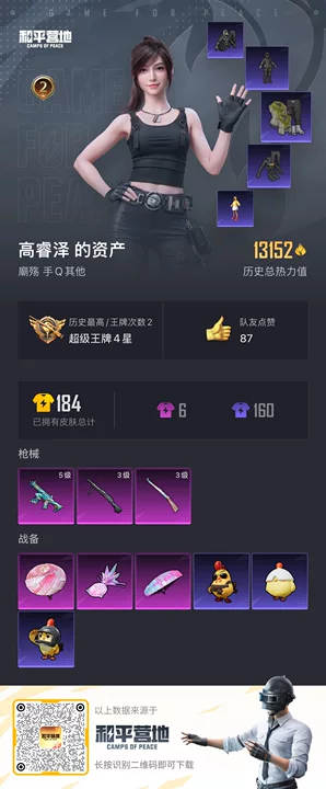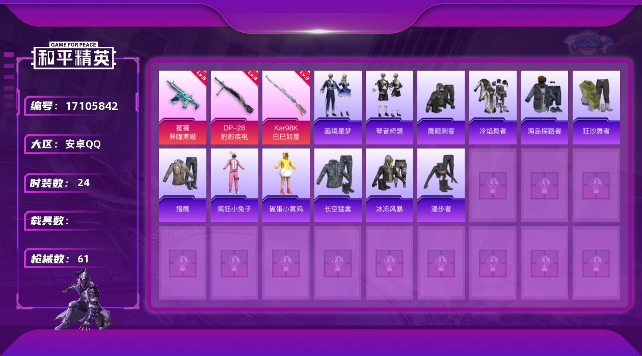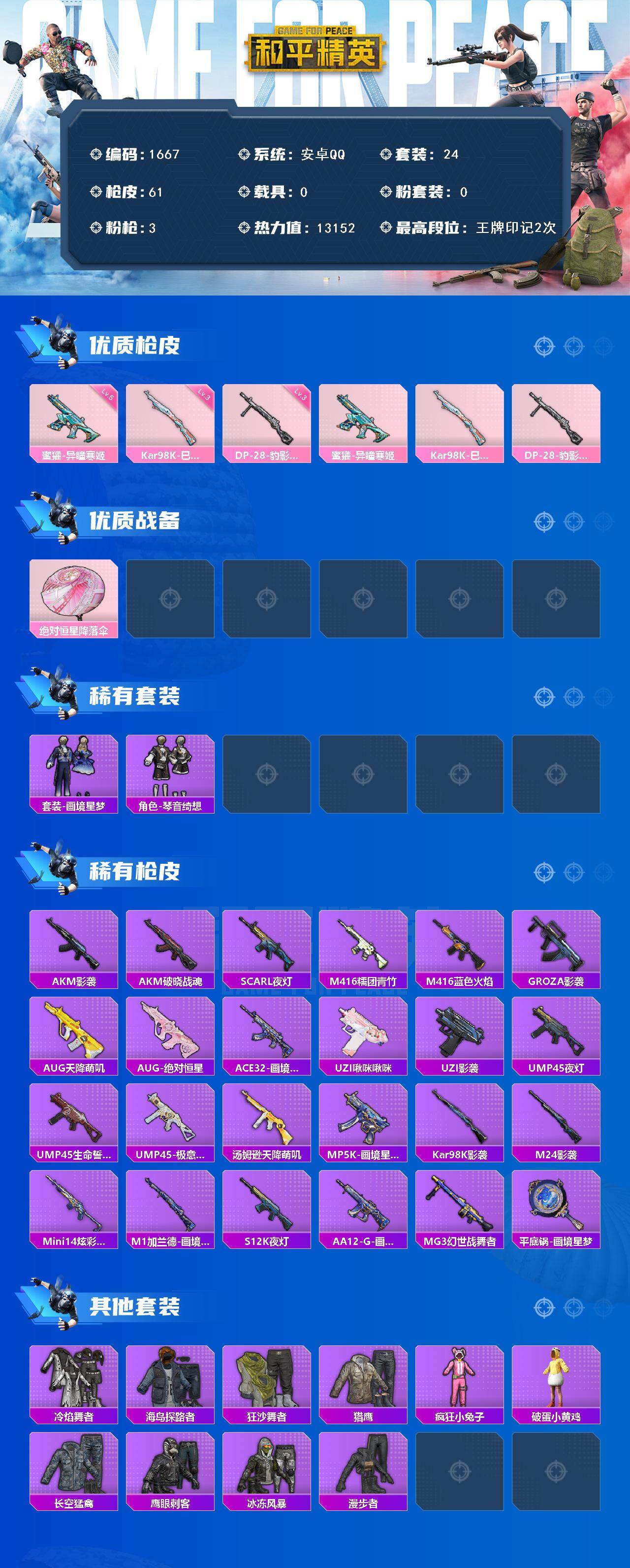 [17105842]【1667】安卓 手Q-0粉装-3特效枪-0载具-1粉色飞行器-13152热力值-2王牌印记-24套装-61枪皮 【粉色枪皮等级】:蜜獾-异瞳寒姬(五级),Kar98K-巳巳如意(三级),DP-28-豹影疾电(三级) 【粉色枪皮】:蜜獾-异瞳寒姬,Kar98K-巳巳如意,DP-28-豹影疾电 【粉色降落伞】:绝对恒星降落伞,炫彩糖果降落伞 【稀有套装】:套装-雪国风尚,套装-画境星梦,套装-琴音绮想,套装-炫彩糖果 【稀有枪皮】:AUG-冰晶雪宝,AKM-影袭,AKM-破晓战魂,SCAR-L-夜灯,M416-糯团青竹,M416-蓝色火焰,GROZA-影袭,AUG-天降萌叽,AUG-绝对恒星,ACE32-画境星梦,UZI-啾咪啾咪,UZI-影袭,UMP45-夜灯,UMP45-生命誓言,UMP45-极意拳锋,汤姆逊-天降萌叽,MP5K-画境星梦,Kar98K-影袭,M24-影袭,Mini14-炫彩节奏,M1加兰德-画境星梦,S12K-夜灯,AA12-G-画境星梦,MG3-幻世战舞者,平底锅-画境星梦 【其他套装】:套装-冷焰舞者,套装-海岛探路者,套装-狂沙舞者,套装-猎鹰,套装-疯狂小兔子,套装-破蛋小黄鸡,套装-长空猛禽,套装-鹰眼刺客,套装-冰冻风暴,套装-漫步者 【营地ID】:946968299