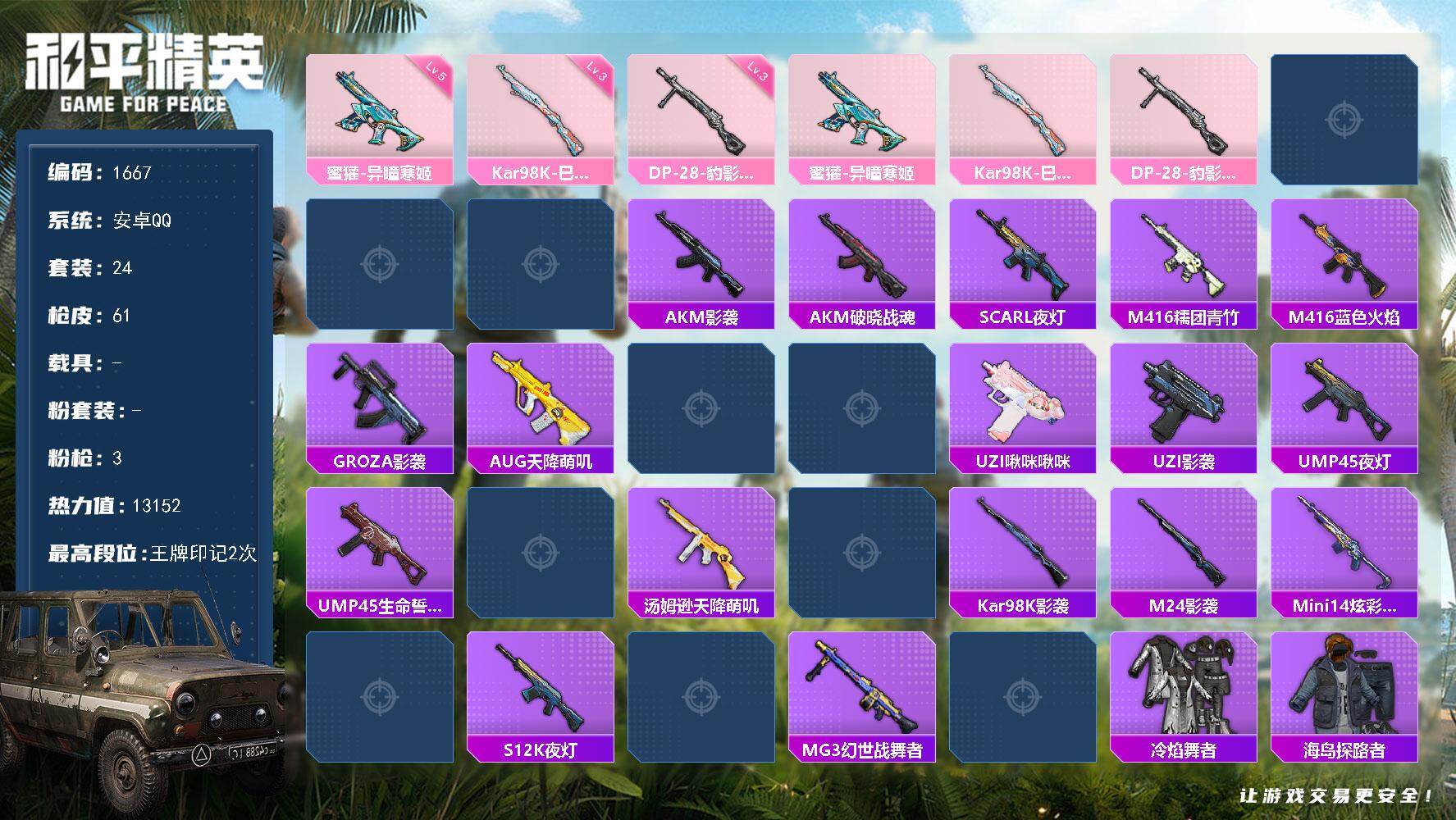 [17105842]【1667】安卓 手Q-0粉装-3特效枪-0载具-1粉色飞行器-13152热力值-2王牌印记-24套装-61枪皮