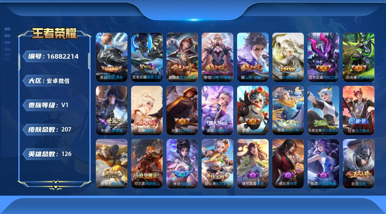 [16882214]安卓WX-V0-至尊星耀III段位-126英雄-207皮肤-1典藏皮肤-11传说-63史诗