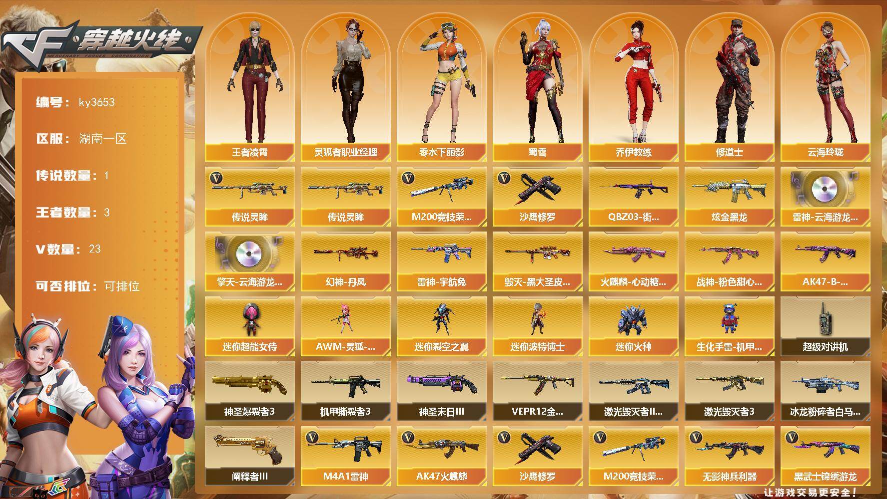 [17226268]湖南一区-23V-3王者-1炫金 【传说武器】:传说灵眸 【热门武器】:传说灵眸,M200-竞技荣光,QBZ03-街机,沙鹰-修罗 【王者炫金武器】:炫金黑龙 【音效卡】:擎天-云海游龙音效卡,M4A1-雷神-云海游龙音效卡 【皮肤】:幻神-丹凤,雷神-宇航兔皮肤,火麒麟-心动糖果,毁灭-黑大圣皮肤,战神-粉色甜心皮肤,AK47-B-常胜将军-曹操 【角色】:王者凌霄,乔伊教练,修道士,云海玲珑,北极狐-X,初恋灵狐,电竞少女,芳心审判者,飞虎队-X,虎妞,嘉年华灵狐,0号玩家,零-水下丽影,灵狐者-X,灵狐者-七夕宝贝,灵狐者-职业经理,龙儿,曼陀罗-X,潘多拉-X,潘多拉-甜心教官,斯沃特-X,蜀雪,兔囡囡,维纳斯 【人偶武器】:AWM-灵狐-15周年嘉年华,迷你裂空之翼,迷你波特博士*2,迷你火种,生化手雷-机甲核心,迷你超能女侍 【暴走生化】:超级对讲机 【挑战大师】:神圣爆裂者III*2,冰龙粉碎者-白马银枪*2,激光毁灭者III-白马银枪*2,VEPR-12-金魔*2,激光毁灭者III,机甲撕裂者III,神圣爆裂者-末日III*2,阐释者III 【英雄级武器】:AK47-火麒麟,M4A1-雷神,无影-神兵利器,黑武士-锦绣游龙,烈火-动感闪耀,王者之城-觉醒版,M200-竞技荣光,烈龙-云海游龙,沙鹰-修罗,天神-动感闪耀,屠龙-动感闪耀,擎天-云海游龙,高爆手雷-幻灵,高爆手雷-竞技荣光,手雷-动感闪耀,手雷-云海游龙,闪光弹-竞技荣光*2,闪光弹-神工天巧,烟雾弹-竞技荣光,烟雾弹-神工天巧 【道具】:BS战队炫彩背包,CFS限定背包,云海游龙炫彩背包,全能枪王背包,女皇终结者-背包,超级背包,女皇终结者-魔龙之吻,绿色巨人,灵魂忍者*2,变异宝贝,迷雾幽灵*2,生化弹匣,夺命之镰,防化服*4,金色流光-枪王排位*2,星辰流光-枪王排位,流光-鎏金之域,枪王排位28赛季金色流光,枪王排位29赛季金色流光,电玩兔兔表情,动感闪耀表情,云海游龙表情,EP战队名片,EP战队喷图,EP战队击杀图标,防弹头盔*4,防弹衣*4,C4工具钳*4,手雷包*4 【特殊枪械】:
