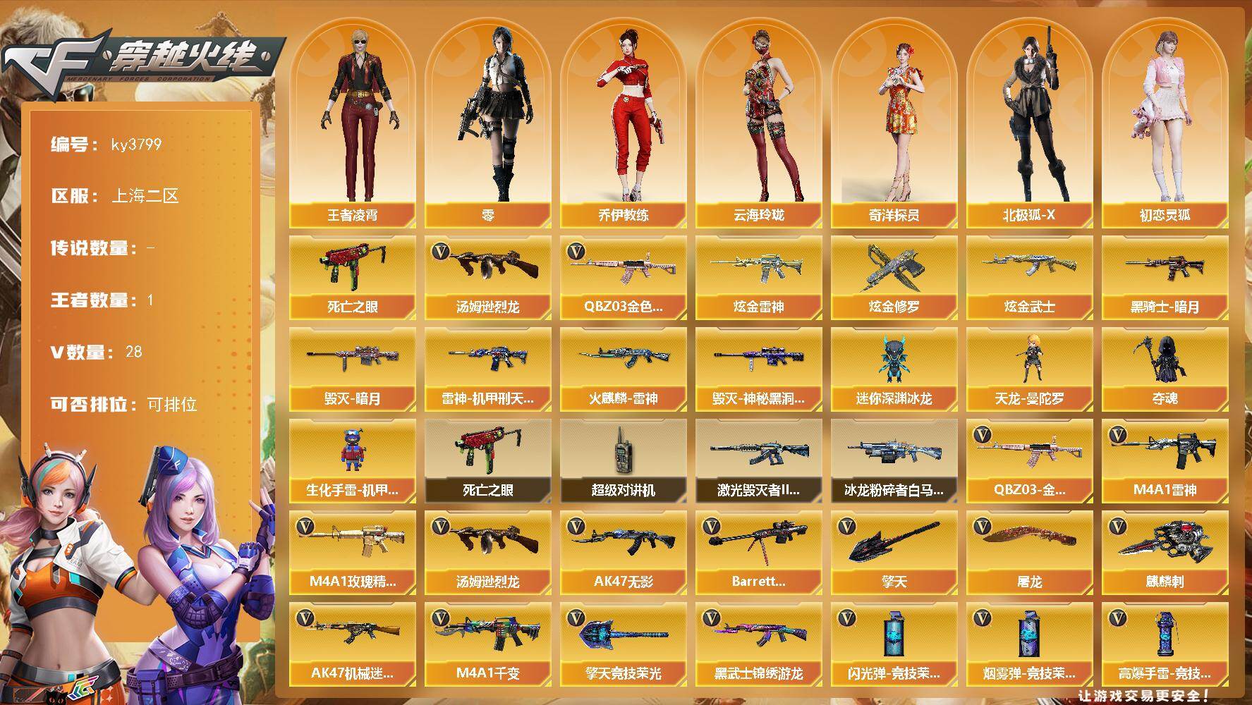[17226751]上海二区-28V-1王者-3炫金 【热门武器】:QBZ03-金色蔷薇,死亡之眼,汤姆逊-烈龙 【王者炫金武器】:炫金雷神,炫金武士,炫金修罗 【皮肤】:雷神-机甲刑天皮肤,火麒麟-雷神,毁灭-暗月,毁灭-神秘黑洞皮肤,黑骑士-暗月 【角色】:零,王者凌霄,奇洋探员,乔伊教练,云海玲珑,北极狐-X,初恋灵狐,电竞少女,风暴女,兰-新年限定,灵狐者-七夕宝贝,曼陀罗-礼服,潘多拉-甜心教官,樱-战斗天使 【人偶武器】:天龙-曼陀罗,迷你深渊冰龙,夺魂*2,生化手雷-机甲核心 【暴走生化】:死亡之眼,超级对讲机 【挑战大师】:冰龙粉碎者-白马银枪,激光毁灭者III-白马银枪 【英雄级武器】:M4A1-千变,M4A1-雷神,AK47-无影,AK47-机械迷城,黑武士-锦绣游龙,M4A1-玫瑰精灵,QBZ03-金色蔷薇,黑骑士-海王,Barrett-毁灭,汤姆逊-烈龙,烈龙-云海游龙,修罗-云海游龙,屠龙*2,擎天*2,麒麟刺,擎天-竞技荣光*2,擎天-云海游龙,屠龙-云海游龙,高爆手雷-竞技荣光*2,手雷-云海游龙,闪光弹-竞技荣光,烟雾弹-竞技荣光 【道具】:云海游龙炫彩背包,机械魔影背包-红色,炫彩背包,夺命之镰,防化服,金色流光-枪王排位,斯沃特表情,云海游龙表情,防弹头盔*7,防弹衣*6,C4工具钳*7,手雷包*7 【特殊枪械】:1烈龙