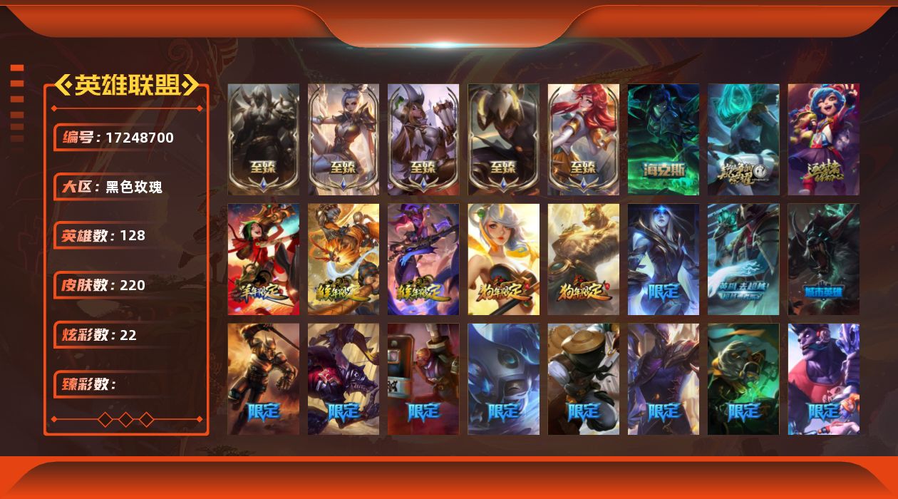 [17248700]未定级段位-128英雄-220皮肤-22炫彩-0终极-8神话-26限定-21传说-59史诗 【神话皮肤】:十周年纪念安妮,源代码乐芙兰,摄魂使者薇恩,至臻黑夜使者李青,至臻魅惑女巫厄运小姐,至臻腥红之月亚托克斯,至臻玉剑传说武剑仙,至臻战斗学院拉克丝 【至臻皮肤】:至臻魅惑女巫厄运小姐,至臻黑夜使者李青,至臻玉剑传说武剑仙锐雯,至臻战斗学院拉克丝,至臻腥红之月亚托克斯 【年限皮肤】:神龙烈焰金克丝,美猴王孙悟空,玉净夜叉凯特琳,北辰之威内瑟斯,春晖神女拉克丝 【海克斯皮肤】:摄魂使者薇恩 【冰雪限定】:平安夜女神娑娜,邪恶圣诞老人维迦,圣诞玩偶波比,冰雪节辛吉德 【限定皮肤】:养蜂人辛吉德,创星之灵璐璐,地底世界崔斯特,Fnatic卡尔萨斯,暗杀星蒙多,SKTT1李青,SSW雷恩加尔,SKTT1伊莉丝,SKTT1辛德拉,胜利之剑亚托克斯,南瓜头费德提克,暗影沃里克,勇者阿狸,都铎王朝图奇,御星魔矢艾希,防暴士兵辛吉德,警用试作体K9内瑟斯 【传说皮肤】:铁哥们儿奥拉夫,地狱之门卫士加里奥,战地机甲厄加特,大天使长米迦勒凯尔,战场女武神凯尔,约德尔国队长提莫,烈焰雄心崔丝塔娜,女皇艾希,绅士科加斯,战地巨兽科加斯,律政大亨蒙多,电玩女神娑娜,银河魔装机神兰博,炼狱魔犬内瑟斯,枯萎之壤泽拉斯,宇航员诺提勒斯,泳池派对吉格斯,金牌主播德莱文,奥德赛凯隐,天煞劫,源计划毁灭派克 【史诗皮肤】:腥红之月崔斯特,摄魂男爵弗拉基米尔,铁钩船长费德提克,圣光审判凯尔,战场公主希维尔,圣洁化身索拉卡,狼外婆沃里克,女船长厄运小姐,紫晶射手艾希,炼金狂士辛吉德,卡尔萨斯祸害之光,飞越疯人院萨科,战争血统蒙多,掠星魔刃卡萨丁,夜刃艾瑞莉娅,寒冰女皇迦娜,恐惧新星普朗克,血石诅咒塔里克,北领前线斯维因,驯龙大师斯维因,抵抗军天使凯特琳,霸天巨兽墨菲特,前线指挥官卡特琳娜,沙漠风暴卡特琳娜,枯萎之壤雷克顿,龙骑统帅嘉文四世,死亡绽放伊莉丝,腥红之月伊莉丝,灵魂烈焰布兰德,艳后奈德丽,四神之力乌迪尔,军神战甲波比,血色之锤波比,飞车暴走族古拉加斯,大夏武士潘森,刺客信条凯南,腥红之月凯南,孤高游侠盖伦,深海怪鱼克格莫,腥红之月鬼武者慎,战国大名慎,银河魔装机神希瓦娜,铁血猎人雷恩加尔,驯龙女巫璐璐,生化骑士德莱厄斯,天启骑士杰斯,源代码丽桑卓,血羽凤凰奎因,仲裁圣女辛德拉,亚特兰蒂斯辛德拉,