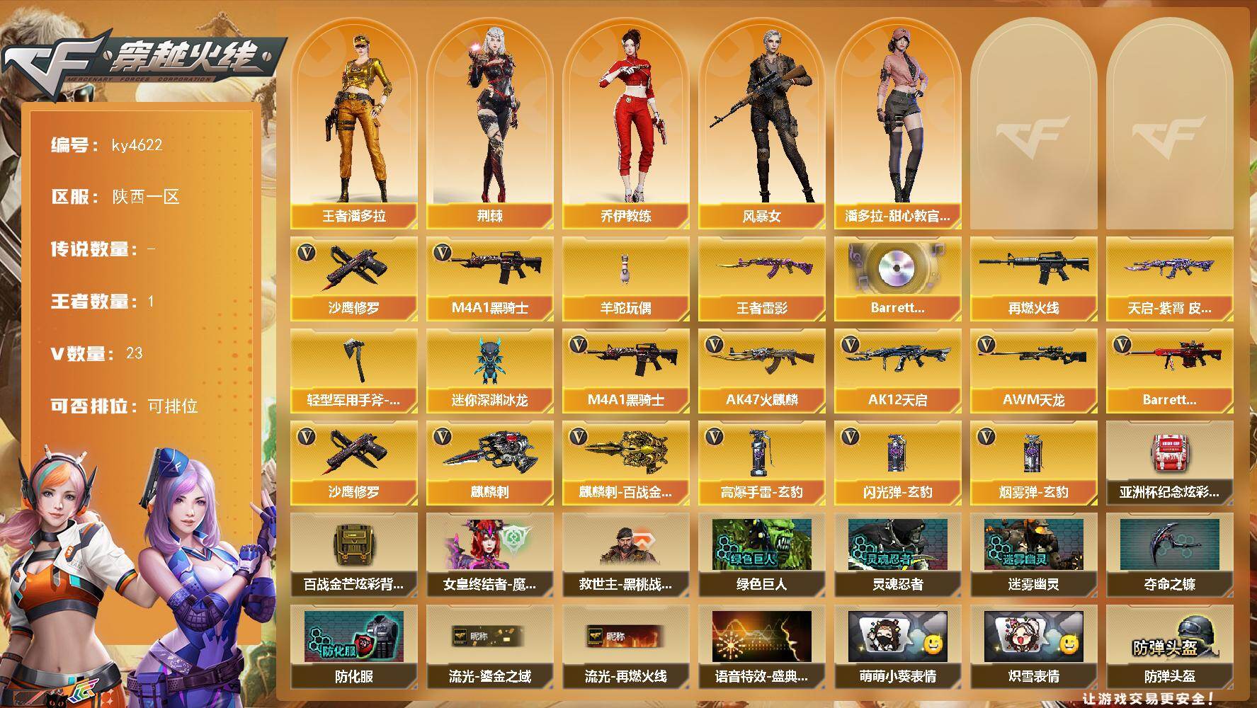 [17231721]陕西一区-23V-1王者-0炫金 【热门武器】:M4A1-黑骑士,羊驼玩偶*2,沙鹰-修罗*3 【王者炫金武器】:王者雷影 【音效卡】:Barrett-碧霄极光音效卡 【皮肤】:M4A1-再燃火线,天启-紫霄 皮肤,轻型军用手斧-再燃火线 【角色】:荆棘,王者潘多拉,乔伊教练,风暴女,潘多拉-甜心教官 【人偶武器】:迷你深渊冰龙 【英雄级武器】:AK47-火麒麟,M4A1-黑骑士,AK12-天启,AWM-天龙,Barrett-极光,沙鹰-修罗*3,麒麟刺,麒麟刺-百战金芒,高爆手雷-玄豹*2,闪光弹-玄豹*2,烟雾弹-玄豹*3 【道具】:亚洲杯纪念炫彩背包,百战金芒炫彩背包,女皇终结者-魔龙之吻,救世主-黑桃战神,绿色巨人,灵魂忍者,迷雾幽灵,夺命之镰,防化服*3,流光-鎏金之域,流光-再燃火线,语音特效-盛典烟火,萌萌小葵表情,炽雪表情,防弹头盔*3,防弹衣*3,C4工具钳*3,手雷包*3 【特殊枪械】:1黑骑士