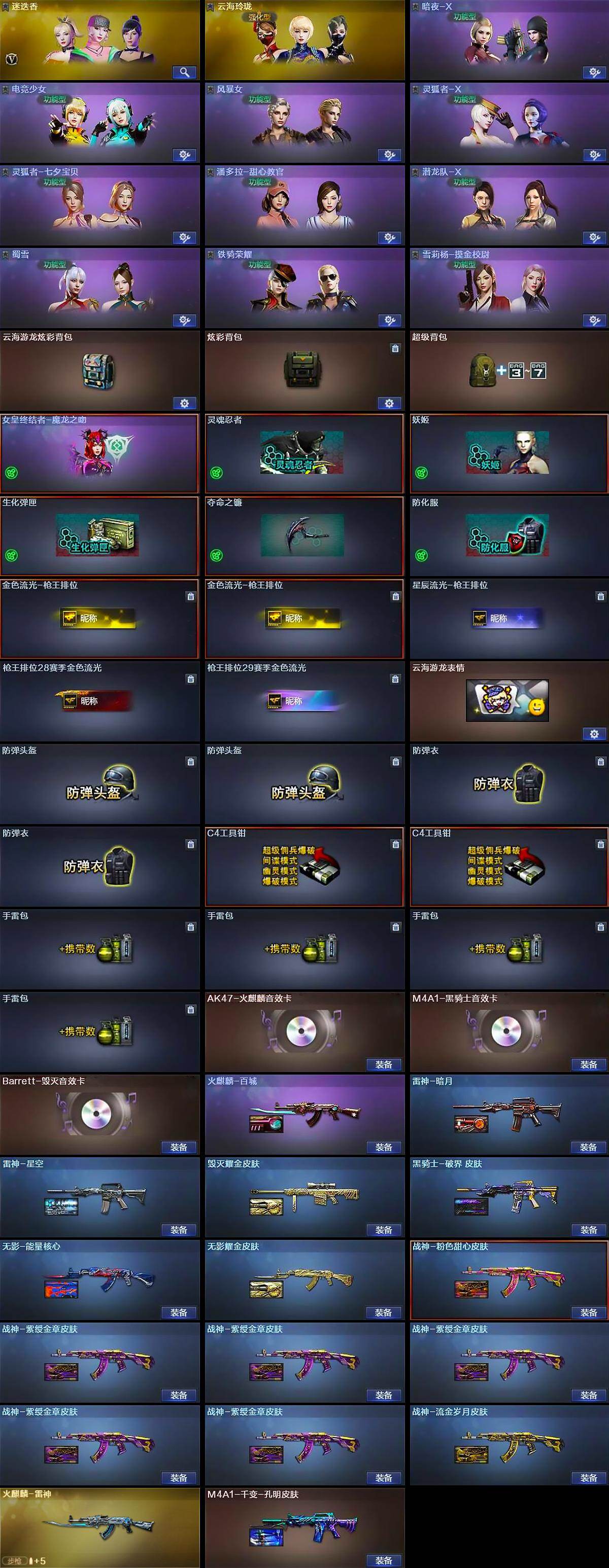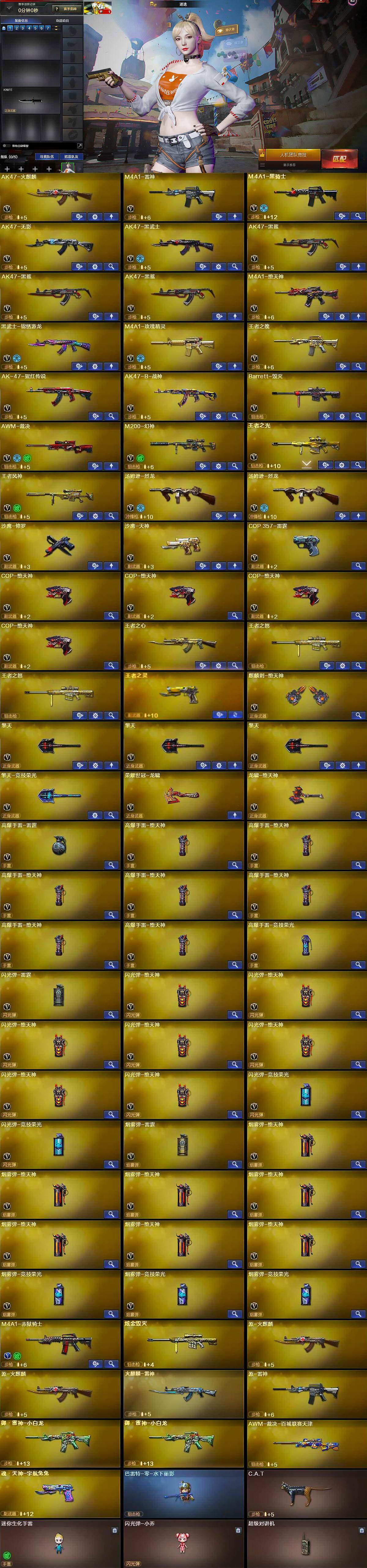 【英雄级武器】:AK47-火麒麟,M4A1-雷神,M4A1-黑骑士,AK47-无影,AK47-黑武士,AK47-黑鲨*3,M4A1-堕天神,黑武士-锦绣游龙,M4A1-玫瑰精灵,王者之魄-觉醒版,AK-47-猩红传说,AK47-B-战神,Barrett-毁灭,AWM-裁决,M200-幻神,王者之光-觉醒版,王者风神-觉醒版,汤姆逊-烈龙*2,沙鹰-修罗,沙鹰-天神,COP-雷霆,COP-堕天神*4,麒麟刺-堕天神,擎天*3,擎天-竞技荣光,荣耀世冠-龙啸,龙啸-堕天神,高爆手雷-雷霆,高爆手雷-堕天神*7,高爆手雷-竞技荣光,闪光弹-雷霆,闪光弹-堕天神*7,闪光弹-竞技荣光*2,烟雾弹-雷霆,烟雾弹-堕天神*7,烟雾弹-竞技荣光*3,M4A1-赤狱骑士
