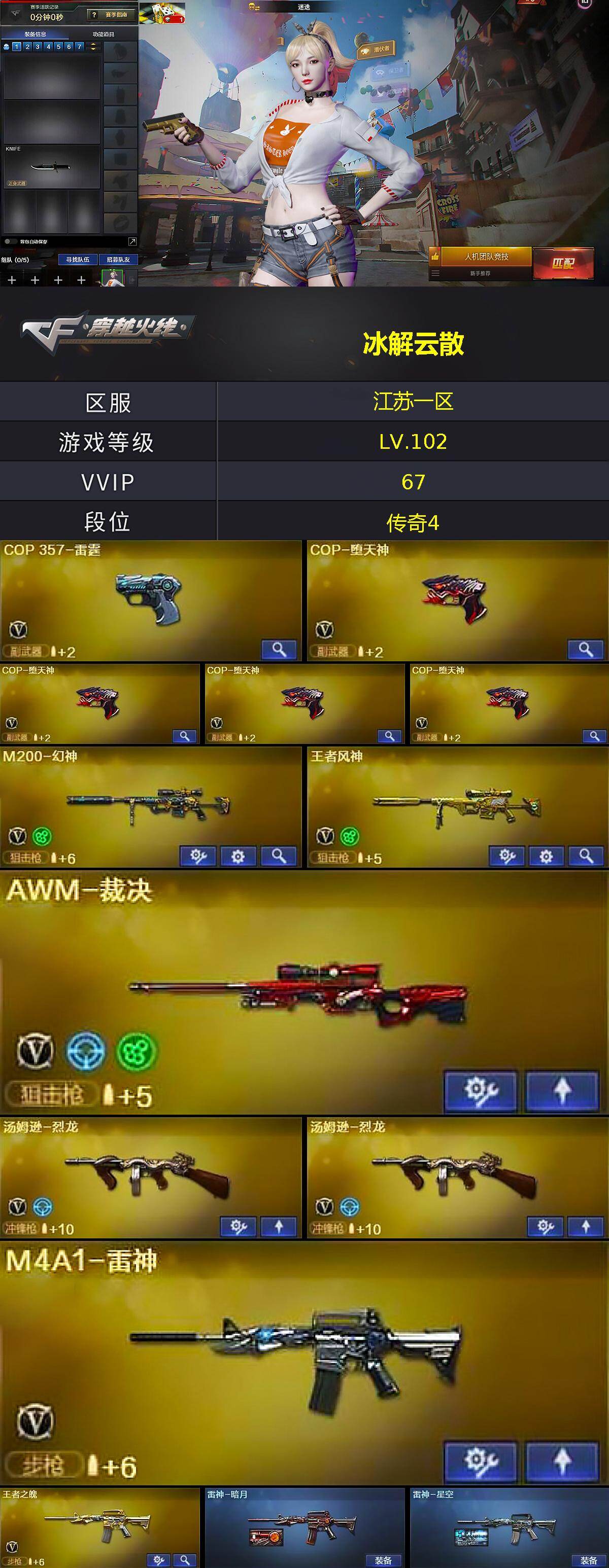 - [17074533]江苏二区-125V-4王者武器数-2炫金武器数 【热门武器】:Scar Light-白虎,死亡之眼*5,M4A1-黑骑士,汤姆逊-烈龙*8,RPK-盘龙*6,加特林-炼狱*2,斯泰尔-蝴蝶,USP-雷暴*2,沙鹰-修罗*8 【王者炫金武器】:王者之戮,王者之灵,炫金骑士,炫金毁灭 【音效卡】:AK47-火麒麟音效卡 【皮肤】:雷神-暗月,雷神-宇航兔皮肤,雷神-源计划2.0专属 皮肤,毁灭-暗月*2,黑龙-能量核心,黑龙-暗月,黑骑士耀金皮肤,天启-暗月,战神-流金岁月皮肤,天龙-能量核心,修罗-能量核心 【角色】:葵,樱,春,鹰,审判者,王者-零,王者之瞳,北极狐-X,电竞少女,芳心审判者,风暴女,娟娟,兰-海滩派对,0号玩家,零-水下丽影,龙儿,曼陀罗-X,潘多拉-甜心教官,蜀雪,铁骑荣耀 【人偶武器】:火麒麟-灵狐*2,迷你救赎猎手,斯泰尔-蝴蝶,COP-旗袍 【暴走生化】:死亡之眼*5 【挑战大师】:神圣爆裂者III 【英雄级武器】:M4A1-千变*2,AK47-火麒麟*3,M4A1-黑龙,M4A1-雷神,M4A1-黑骑士,M4A1-死神,AN94-超新星*3,M4A1-武圣*2,AK47-黑鲨,AK47-雷暴*2,Scar Light-白虎,M4A1-玫瑰精灵,AK-47-猩红传说,AWM-天龙,Barrett-毁灭*2,Barrett-极光,Barrett-金色蔷薇*2,王者之光-觉醒版,王者星神-觉醒版,RPK-盘龙*6,加特林-炼狱*2,汤姆逊-烈龙*8,沙鹰-修罗*8,沙鹰-天神*8,USP-雷暴*2,Glock18-武圣,屠龙*7,龙啸*7,擎天,麒麟刺*3,斩神刀-雷暴,高爆手雷-雷霆,高爆手雷-雷暴*7,闪光弹-雷霆,闪光弹-雷暴*7,烟雾弹-雷霆,烟雾弹-雷暴*7 【道具】:CFS限定背包,战舰背包,炫彩背包,女皇终结者-魔龙之吻,绿色巨人,灵魂忍者,变异宝贝,迷雾幽灵,生化弹匣,夺命之镰,防化服*2,EP战队名片,EP战队喷图,C4-红龙,防弹头盔*4,防弹衣*4,C4工具钳*3,手雷包*4 【特殊枪械】:蝴蝶斯泰尔+6烈龙,1白虎,1黑骑士,6烈龙,6盘龙,2炼狱,1蝴蝶斯泰尔