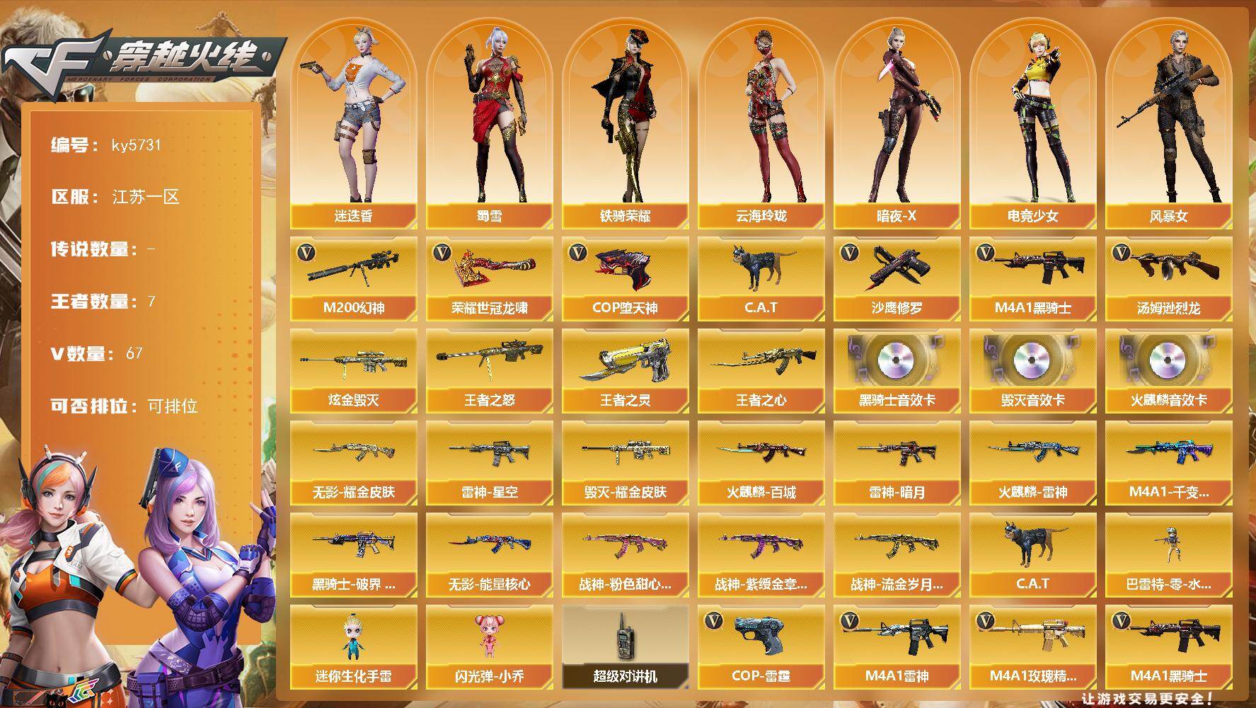 [16945301]江苏一区-70V-7王者武器数-1炫金武器数 【热门武器】:M200-幻神,C.A.T,M4A1-黑骑士,汤姆逊-烈龙*2,COP-堕天神*4,沙鹰-修罗,荣耀世冠-龙啸 【王者炫金武器】:王者之心,王者之怒*2,王者之灵,炫金毁灭 【音效卡】:AK47-火麒麟音效卡,M4A1-黑骑士音效卡,Barrett-毁灭音效卡 【皮肤】:雷神-暗月,雷神-星空,火麒麟-雷神,火麒麟-百城,毁灭耀金皮肤,M4A1-千变-孔明皮肤,黑骑士-破界 皮肤,无影-能量核心,无影耀金皮肤,战神-粉色甜心皮肤,战神-紫绶金章皮肤*5,战神-流金岁月皮肤 【角色】:迷迭香,云海玲珑,暗夜-X,电竞少女,风暴女,兰-新年限定,0号玩家,灵狐者-X,灵狐者-七夕宝贝,潘多拉-甜心教官,潜龙队-X,蜀雪,铁骑荣耀,兔囡囡,雪莉杨-摸金校尉 【人偶武器】:巴雷特-零-水下丽影,C.A.T,迷你生化手雷,闪光弹-小乔 【暴走生化】:超级对讲机 【英雄级武器】:AK47-火麒麟,M4A1-雷神,M4A1-黑骑士,AK47-无影,AK47-黑武士,AK47-黑鲨*3,M4A1-堕天神,黑武士-锦绣游龙,M4A1-玫瑰精灵,王者之魄-觉醒版,AK-47-猩红传说,AK47-B-战神,Barrett-毁灭,AWM-裁决,M200-幻神,王者之光-觉醒版,王者风神-觉醒版,汤姆逊-烈龙*2,沙鹰-修罗,沙鹰-天神,COP-雷霆,COP-堕天神*4,麒麟刺-堕天神,擎天*3,擎天-竞技荣光,荣耀世冠-龙啸,龙啸-堕天神,高爆手雷-雷霆,高爆手雷-堕天神*7,高爆手雷-竞技荣光,闪光弹-雷霆,闪光弹-堕天神*7,闪光弹-竞技荣光*2,烟雾弹-雷霆,烟雾弹-堕天神*7,烟雾弹-竞技荣光*3,M4A1-赤狱骑士 【道具】:云海游龙炫彩背包,炫彩背包,超级背包,女皇终结者-魔龙之吻,灵魂忍者,妖姬,生化弹匣,夺命之镰,防化服,金色流光-枪王排位*2,星辰流光-枪王排位,枪王排位28赛季金色流光,枪王排位29赛季金色流光,云海游龙表情,防弹头盔*2,防弹衣*2,C4工具钳*2,手雷包*4 【特殊枪械】:1黑骑士,2烈龙