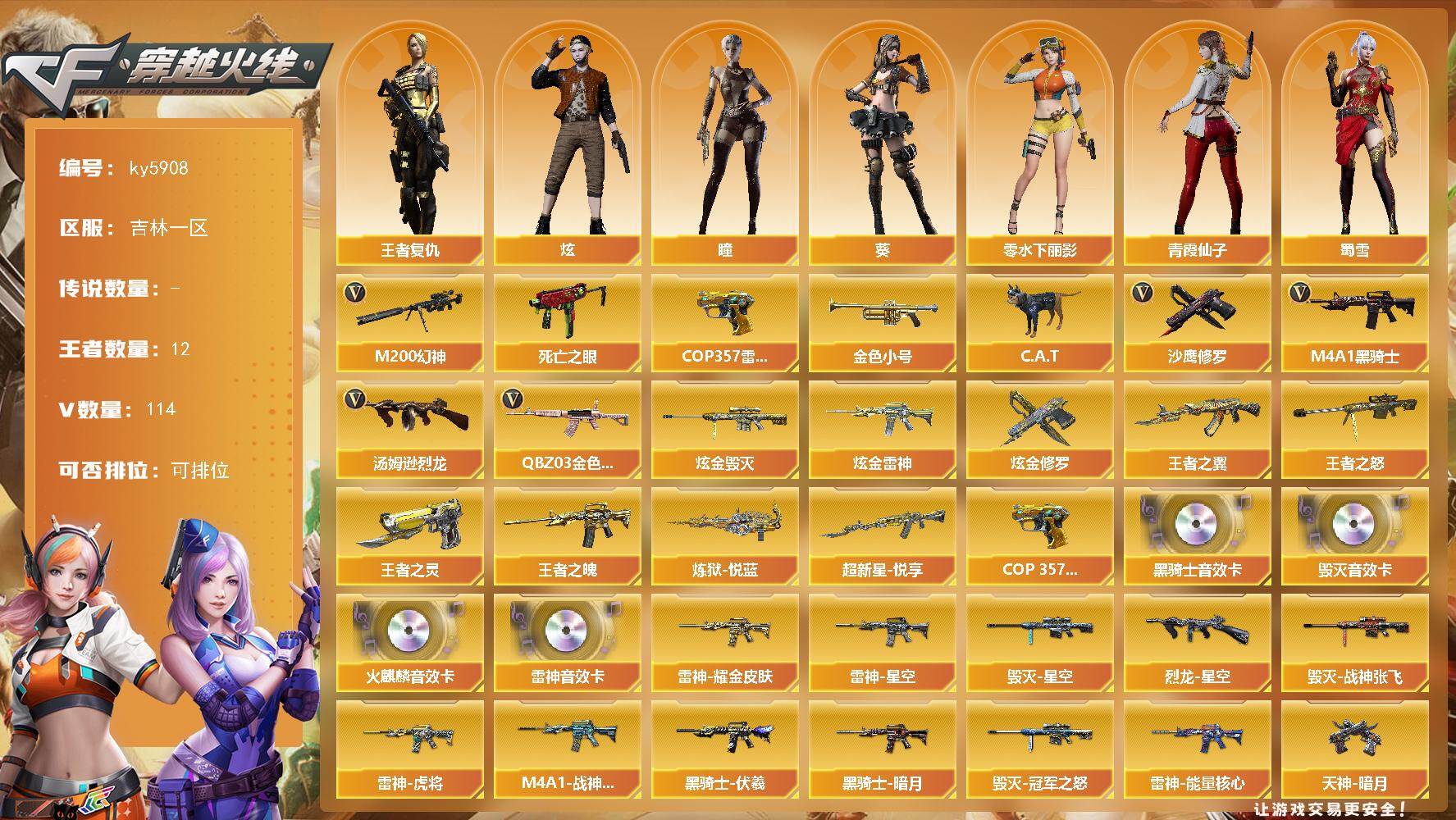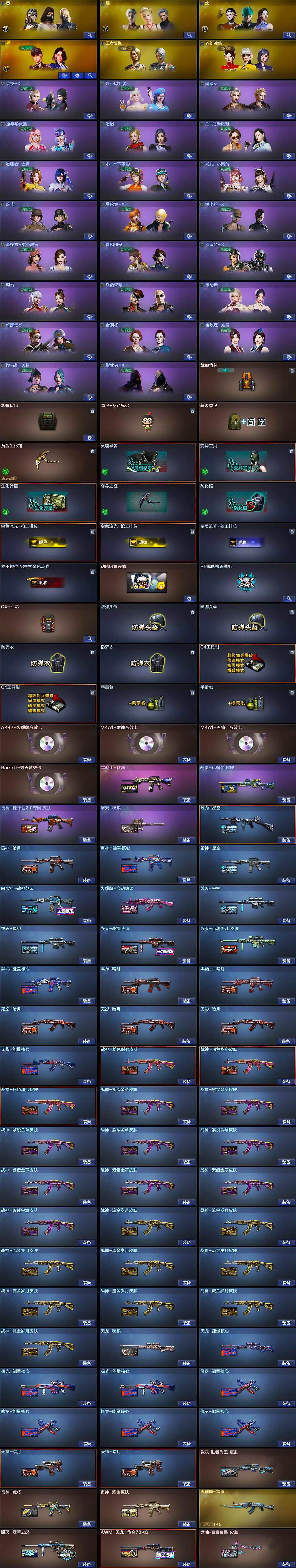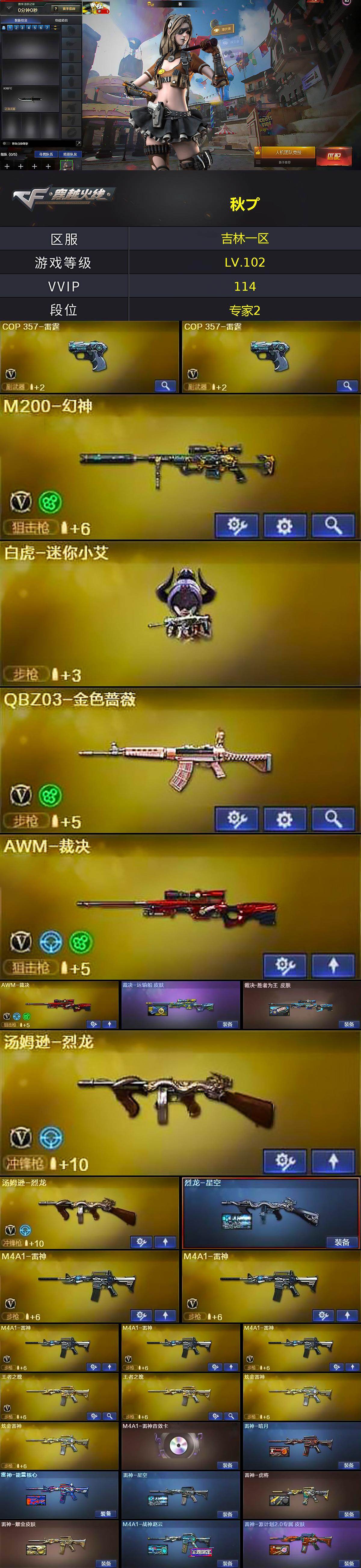 - [15286127]北方大区-77V-6王者-6炫金 【热门武器】:QBZ03-金色蔷薇,M200-幻神,M4A1-黑骑士*3,汤姆逊-烈龙*3,加特林-炼狱*2,斯泰尔-蝴蝶,USP-雷暴,沙鹰-修罗*2 【王者炫金武器】:超新星-悦享,王者之怒,炼狱-悦蓝,炫金骑士,炫金黑龙,炫金雷神,炫金毁灭,炫金天龙,炫金修罗 【音效卡】:M4A1-雷神音效卡,Barrett-毁灭音效卡,炼狱-百战金芒-庆典舞曲音效卡,沙鹰-修罗-盛典舞曲音效卡,死神-雪域霜狐-怀旧音效卡,柯尔特-百战金芒-庆典舞曲音效卡 【皮肤】:幻神-周瑜皮肤,雷神-暗月,雷神-能量核心*2,雷神-星空,M4A1-再燃火线,火麒麟-雷神,火麒麟-心动糖果,毁灭-荣耀之怒,毁灭耀金皮肤,毁灭-星空,毁灭-冠军之怒,毁灭-英雄计划 皮肤,黑龙-暗月*2,黑骑士-暗月*2,无影-暗月,无影-能量核心,死神-秘银,AK47-黑武士-361,天启-暗月*3,天龙-秘银*2,AWM-天龙-传奇白鲨*2,极光-能量核心*2,修罗-能量核心,修罗-星空,修罗-冠军之魂,屠龙-荣耀之锋,轻型军用手斧-再燃火线 【角色】:零,葵,樱,关小雨,审判者,战地猎狐,雪域霜狐,暗夜-X,初恋灵狐,风暴女,嘉年华灵狐,兰-海滩派对,兰-新年限定,零-水下丽影,灵狐-花神,灵狐者-黄金海岸,龙儿-小淘气,曼陀罗-X,潘多拉-X,潘多拉-甜心教官,斯沃特-X,铁骑荣耀,新娜塔莎,影武者-X 【人偶武器】:天龙-曼陀罗,斯泰尔-蝴蝶,AWM-灵狐-15周年嘉年华,M37-葵,COP-旗袍,迷你波特博士*2,夺魂,迷你火种,迷你生化手雷,迷你巨石泰坦-魔花研究所 【挑战大师】:神圣爆裂者III,冰龙粉碎者-白马银枪,激光毁灭者III,神圣爆裂者-末日III,阐释者III 【英雄级武器】:AK47-火麒麟*3,M4A1-黑龙*3,M4A1-雷神*2,M4A1-黑骑士*3,AK47-无影,AK47-黑武士*2,AK12-天启,AK47-黑鲨,M4A1-龙血*2,无影-神兵利器,死神-雪域霜狐,QBZ03-金色蔷薇,AK-47-猩红传说,黑骑士-海王,王者之烈-觉醒版,AWM-天龙*2,Barrett-毁灭*2,Barrett-极光,AWM-裁决,M200-幻神,Barrett-金色蔷薇*3,加特林-炼狱*2,炼狱-百战金芒,汤姆逊-烈龙*3,AA-12-雷霆*