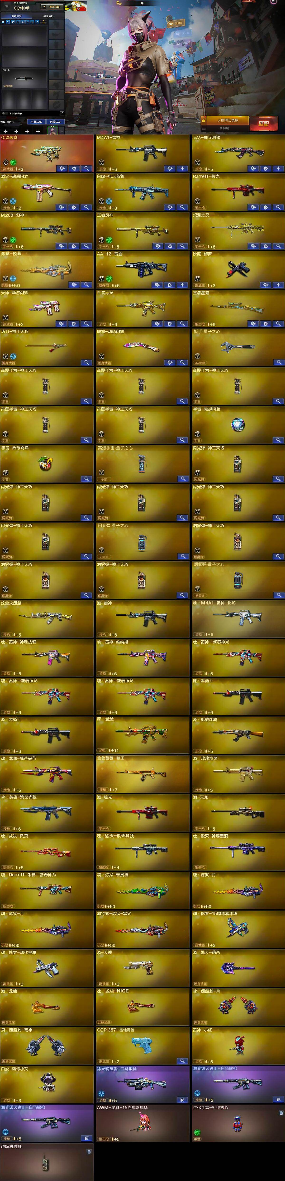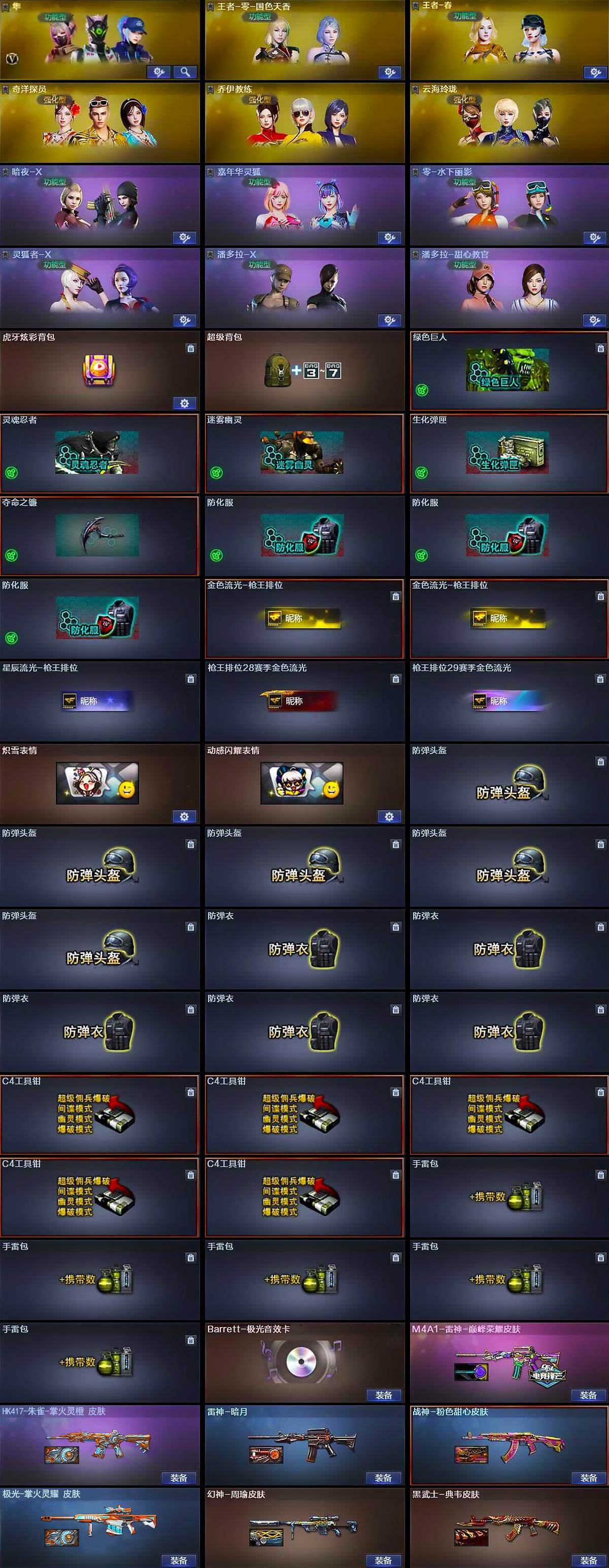 【英雄级武器】:M4A1-雷神,无影-神兵利器,烈火-动感闪耀,白虎-电玩蓝兔,Barrett-极光,M200-幻神,王者风神-觉醒版,炽渊之怒-觉醒版,炼狱-悦蓝-觉醒版,AA-12-雷霆,沙鹰-修罗,天神-动感闪耀,唐刀-神工天巧,屠龙-动感闪耀,扳手-量子之心,高爆手雷-神工天巧*5,手雷-动感闪耀,手雷-热带奇洋,高爆手雷-量子之心,闪光弹-神工天巧*5,闪光弹-量子之心,烟雾弹-神工天巧*3,烟雾弹-量子之心