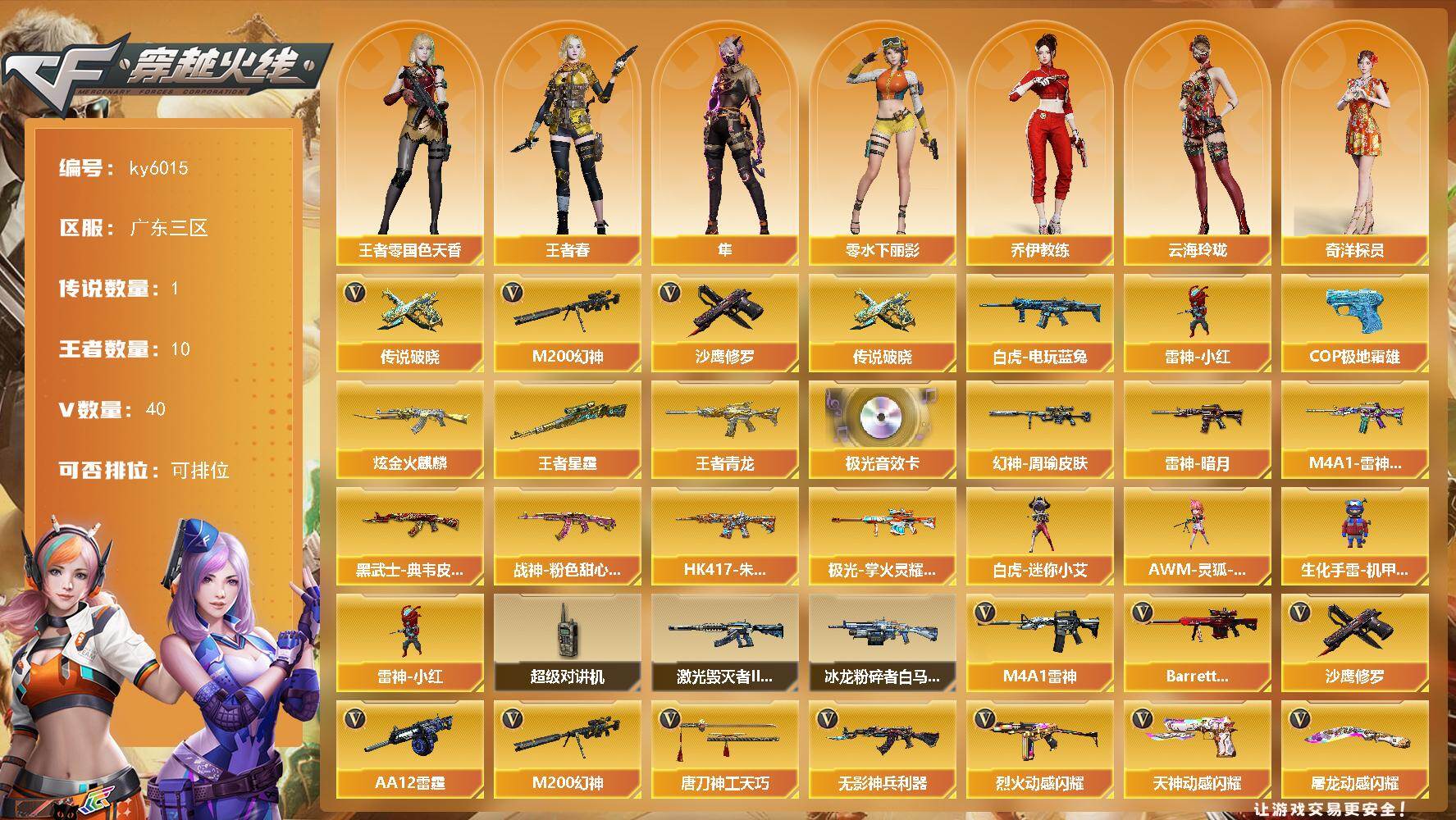[17155329]广东三区-46V-10王者武器数-1炫金武器数 【传说武器】:传说破晓 【热门武器】:传说破晓,M200-幻神,白虎-电玩蓝兔,雷神-小红,沙鹰-修罗,COP 357-极地霜雄 【王者炫金武器】:王者青龙,王者星霆,炫金火麒麟 【音效卡】:Barrett-极光音效卡 【皮肤】:幻神-周瑜皮肤,雷神-暗月,M4A1-雷神-巅峰荣耀皮肤,黑武士-典韦皮肤,HK417-朱雀-掌火灵橙 皮肤,战神-粉色甜心皮肤,极光-掌火灵耀 皮肤 【角色】:隼,王者-零-国色天香,王者春,奇洋探员,乔伊教练,云海玲珑,暗夜-X,嘉年华灵狐,零-水下丽影,灵狐者-X,潘多拉-X,潘多拉-甜心教官,兔囡囡 【人偶武器】:雷神-小红,白虎-迷你小艾,AWM-灵狐-15周年嘉年华,生化手雷-机甲核心 【暴走生化】:超级对讲机 【挑战大师】:冰龙粉碎者-白马银枪,激光毁灭者III-白马银枪*2 【英雄级武器】:M4A1-雷神,无影-神兵利器,烈火-动感闪耀,白虎-电玩蓝兔,Barrett-极光,M200-幻神,王者风神-觉醒版,炽渊之怒-觉醒版,炼狱-悦蓝-觉醒版,AA-12-雷霆,沙鹰-修罗,天神-动感闪耀,唐刀-神工天巧,屠龙-动感闪耀,扳手-量子之心,高爆手雷-神工天巧*5,手雷-动感闪耀,手雷-热带奇洋,高爆手雷-量子之心,闪光弹-神工天巧*5,闪光弹-量子之心,烟雾弹-神工天巧*3,烟雾弹-量子之心 【道具】:虎牙炫彩背包,超级背包,绿色巨人,灵魂忍者,迷雾幽灵,生化弹匣,夺命之镰,防化服*3,金色流光-枪王排位*2,星辰流光-枪王排位,枪王排位28赛季金色流光,枪王排位29赛季金色流光,炽雪表情,动感闪耀表情,防弹头盔*5,防弹衣*5,C4工具钳*5,手雷包*5 【特殊枪械】: