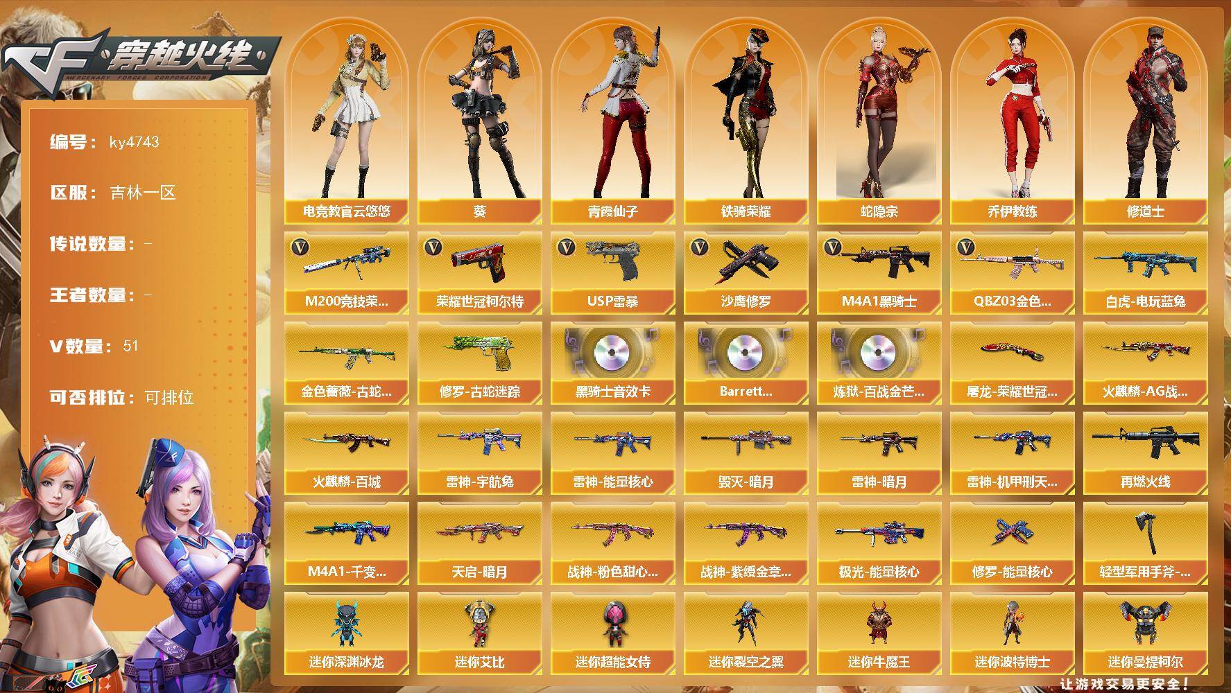 [17253146]吉林一区-51V-0王者-0炫金 【热门武器】:QBZ03-金色蔷薇,金色蔷薇-古蛇迷踪,修罗-古蛇迷踪,M200-竞技荣光,白虎-电玩蓝兔,荣耀世冠-柯尔特,M4A1-黑骑士,USP-雷暴,沙鹰-修罗*2 【音效卡】:M4A1-黑骑士音效卡,Barrett-碧霄极光音效卡,炼狱-百战金芒-庆典舞曲音效卡 【皮肤】:雷神-暗月,雷神-能量核心*2,雷神-机甲刑天皮肤,雷神-宇航兔皮肤,M4A1-再燃火线,火麒麟-AG战队皮肤,火麒麟-百城,毁灭-暗月*2,M4A1-千变-孔明皮肤,天启-暗月,战神-粉色甜心皮肤,战神-紫绶金章皮肤*2,极光-能量核心*2,修罗-能量核心*2,屠龙-荣耀世冠AG,轻型军用手斧-再燃火线 【角色】:葵,电竞教官-云悠悠,蛇隐宗,乔伊教练,修道士,暗夜-X,芳心审判者,风暴女,虎妞,灵狐者-X,灵狐者-七夕宝贝,龙儿-小淘气,潘多拉-甜心教官,青霞仙子,蛇姬,铁骑荣耀,兔囡囡 【人偶武器】:迷你深渊冰龙,迷你裂空之翼*3,迷你牛魔王,迷你波特博士*4,迷你曼提柯尔,夺魂*11,迷你火种,生化手雷-机甲核心,深渊终结者手雷,迷你艾比,迷你超能女侍 【暴走生化】:超级对讲机 【挑战大师】:神圣爆裂者III,冰龙粉碎者-白马银枪*2,激光毁灭者III-白马银枪*2,VEPR-12-金魔,机甲撕裂者III,试炼破坏者III,KAC-圣炎切割者III,惩戒者III 【英雄级武器】:M4A1-千变,AK47-火麒麟*2,M4A1-雷神,M4A1-黑骑士,AK12-天启,金色蔷薇-古蛇迷踪,M4A1-玫瑰精灵,QBZ03-金色蔷薇,AK-47-猩红传说*2,AK47-B-战神,白虎-电玩蓝兔,Barrett-毁灭,Barrett-极光,M200-竞技荣光,炼狱-百战金芒,沙鹰-修罗*2,沙鹰-天神*2,USP-雷暴,荣耀世冠-柯尔特,柯尔特-竞技荣光*2,修罗-古蛇迷踪,屠龙,龙啸,擎天*3,擎天-竞技荣光,麒麟刺-百战金芒,高爆手雷-竞技荣光*4,高爆手雷-古蛇迷踪,闪光弹-竞技荣光*4,烟雾弹-竞技荣光*4,烟雾弹-古蛇迷踪,M4A1-苍鸣雷神,Barrett-碧霄极光 【道具】:BS战队炫彩背包,CFS限定背包,云山科技背包,亚洲杯纪念炫彩背包,古蛇迷踪炫彩背包,战舰背包,炫彩背包,百战金芒炫彩背包,虎牙炫彩背包,超级背包,黄金曼提柯尔的背包,