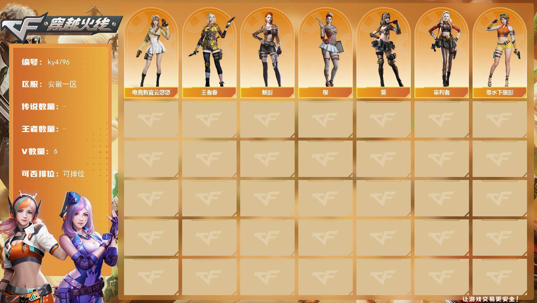 [17253310]安徽一区-6V-0王者-0炫金 【角色】:葵,樱,魅影,电竞教官-云悠悠,审判者,战地猎狐,王者春,雪域霜狐,奇洋探员,乔伊教练,云海玲珑,飞虎队-X,风暴女*2,疾风,娟娟,兰-海滩派对,零-水下丽影,灵狐者-黄金海岸,麻雀,潜龙队-X,莎莎,铁骑荣耀,影武者-X,游珑儿 【特殊枪械】: